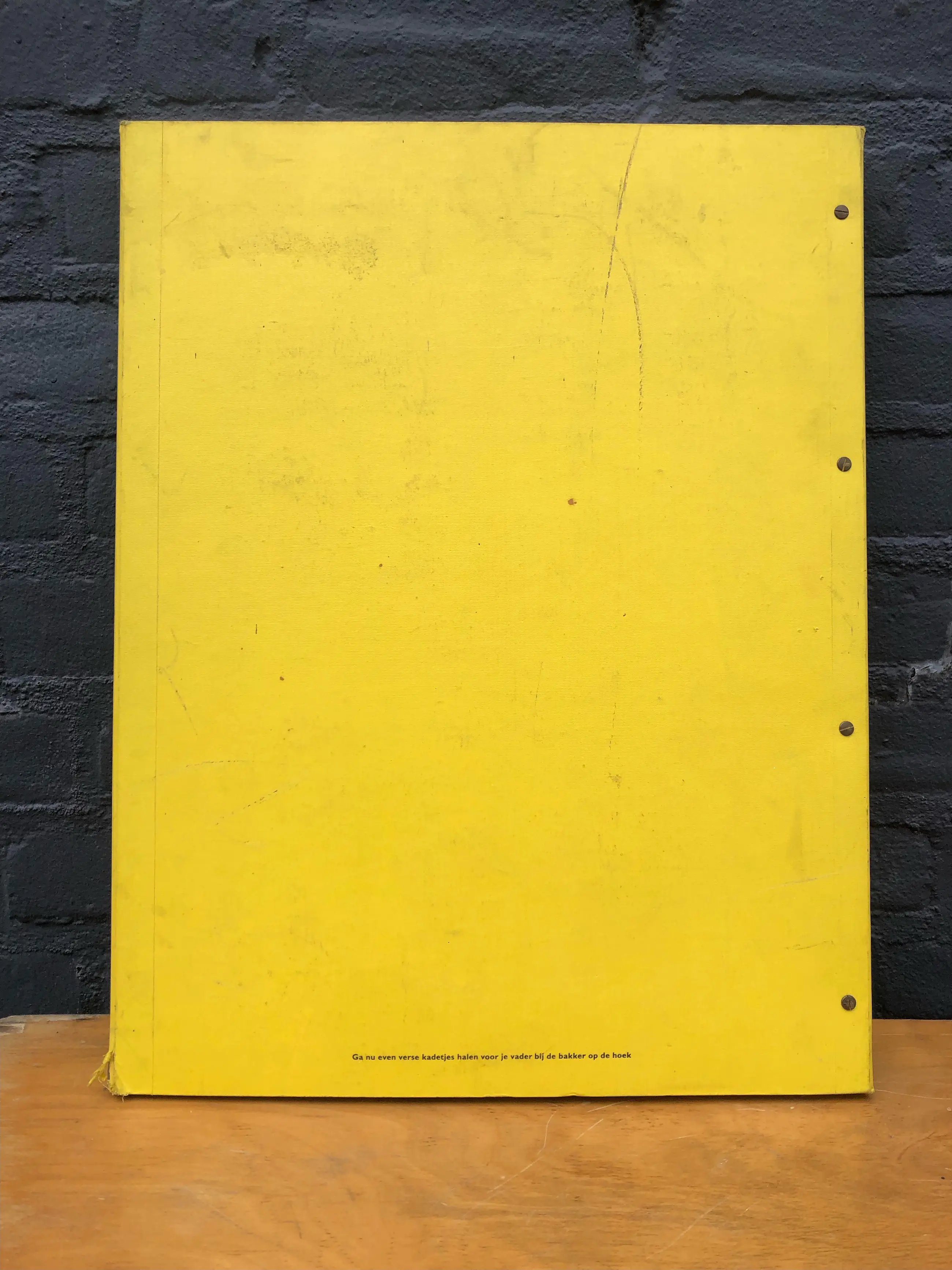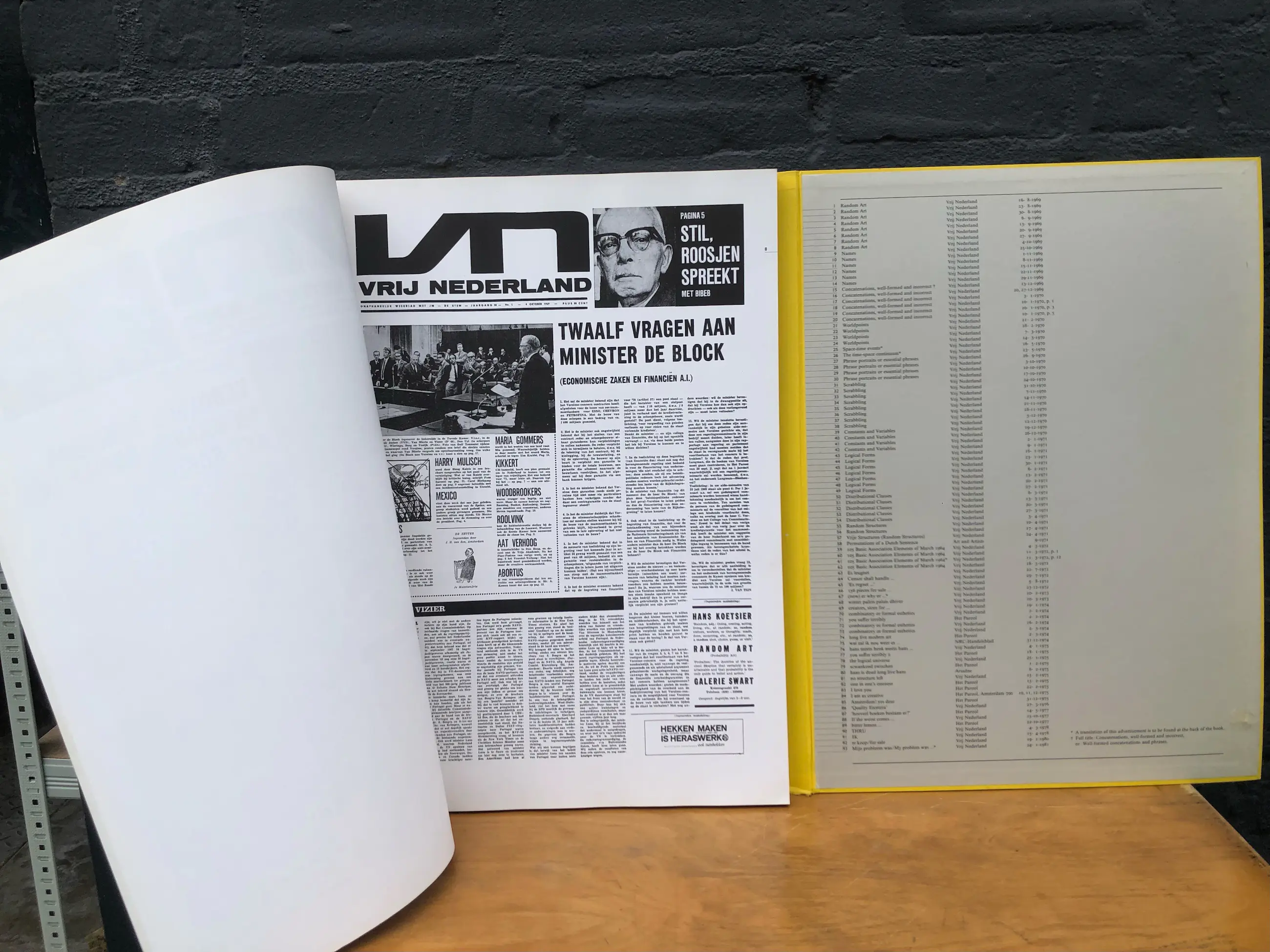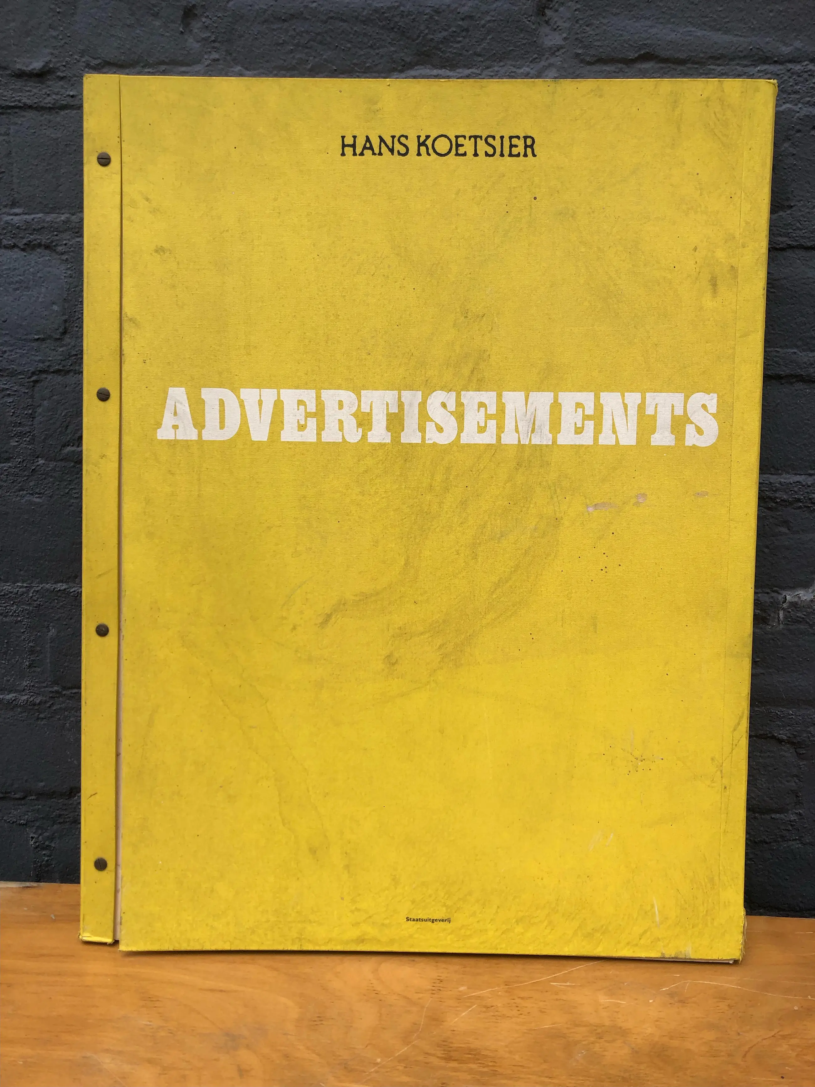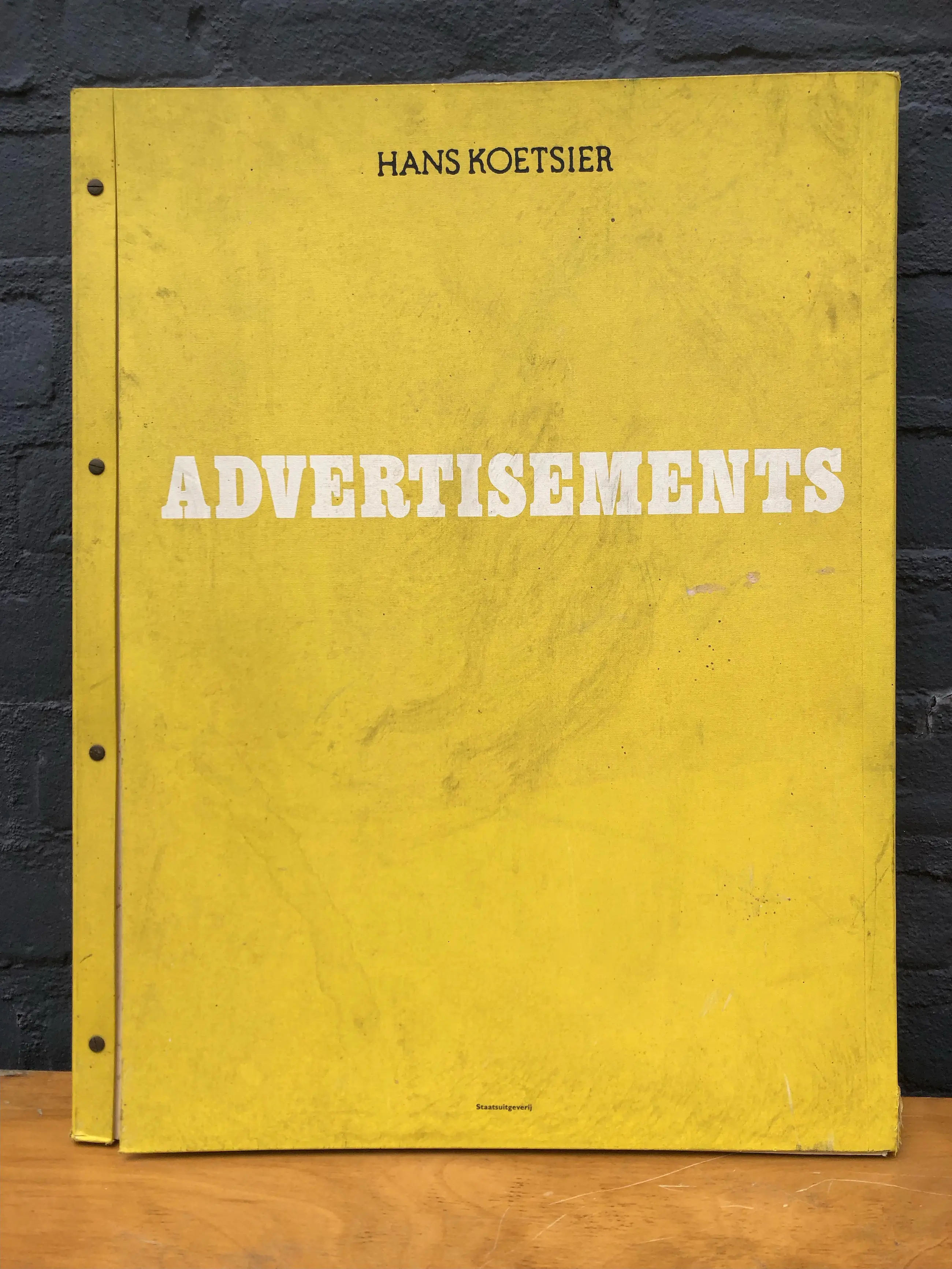 Artist’s book with series of advertisement as art format that weighs 11 kilograms due to the heavy cardboard pages. A bi-lingual text of 9 pages is added to the collection of 93 facsimile plates of front pages of Dutch newspapers Vrij Nederland, Het Parool and NRC-Handelsblad. Cover with screw binding of heavy weight cardboard pages