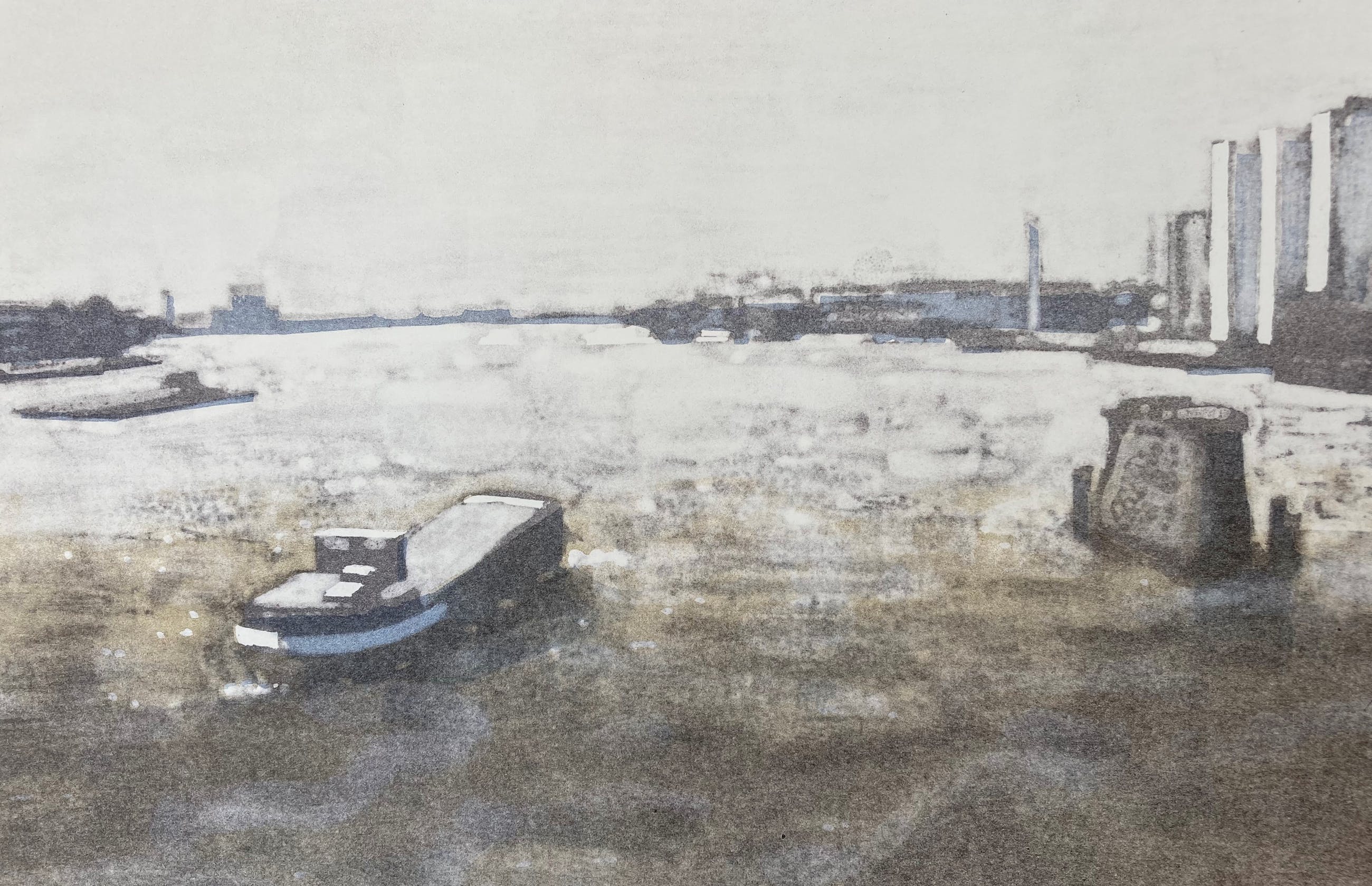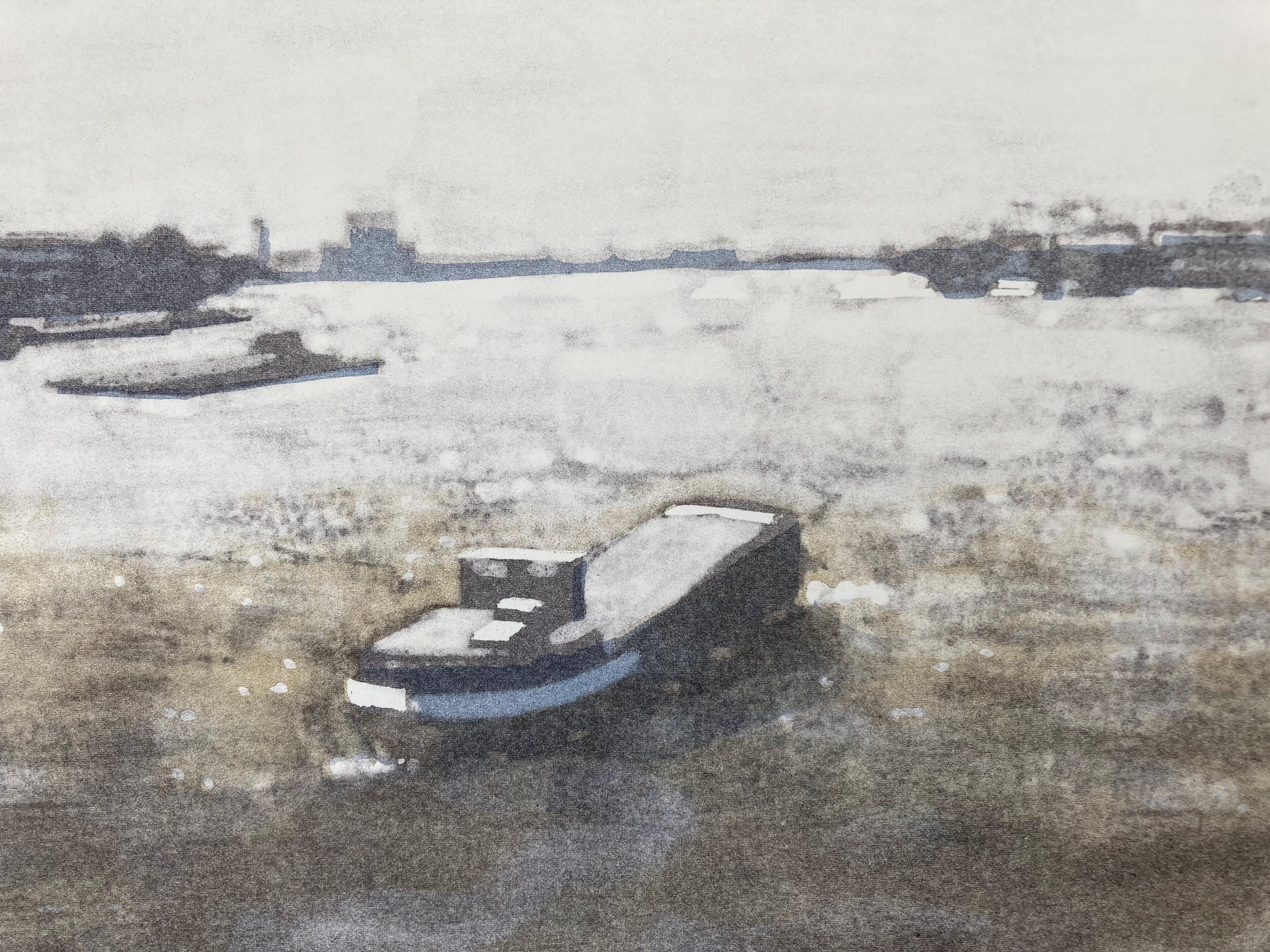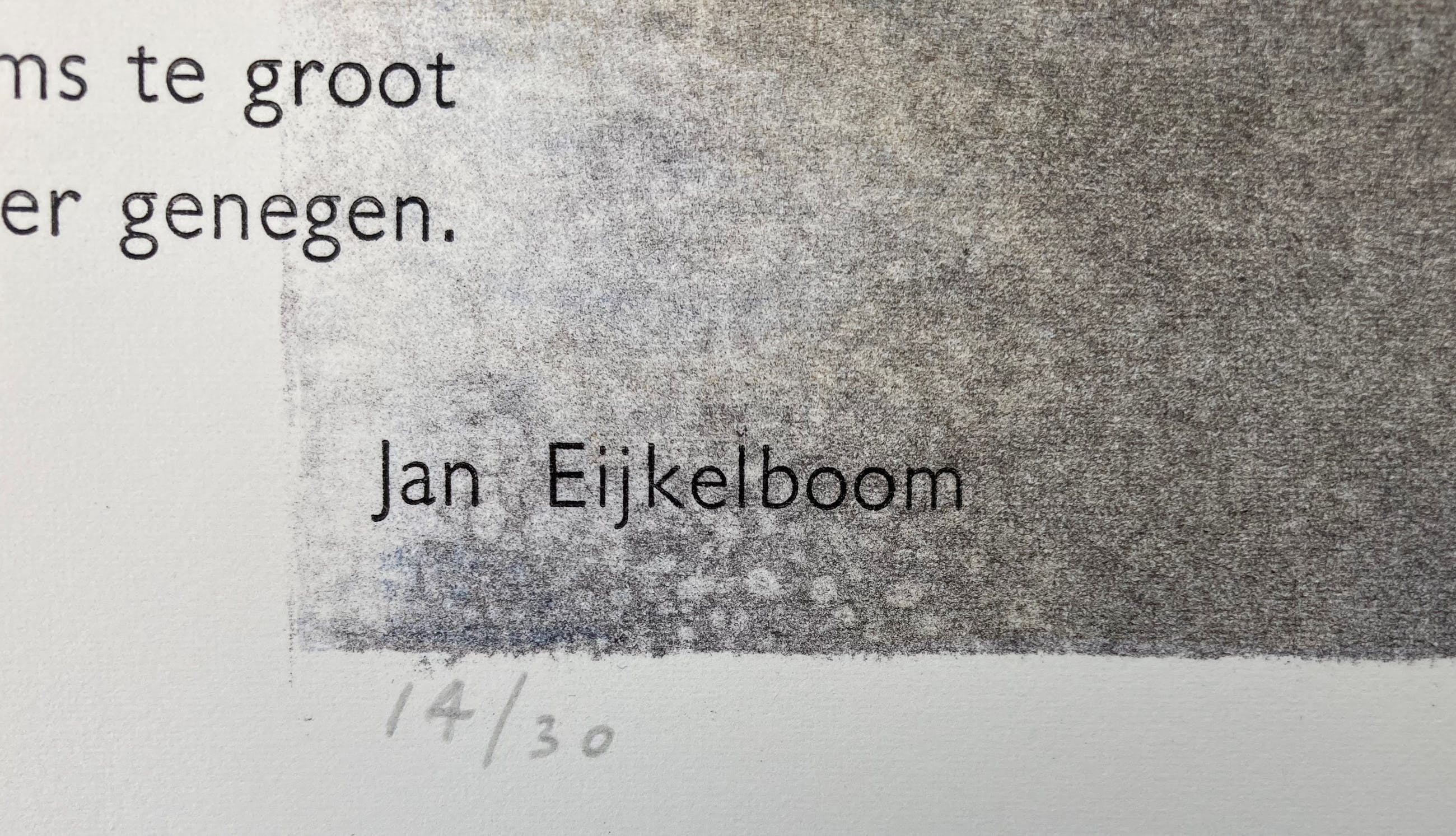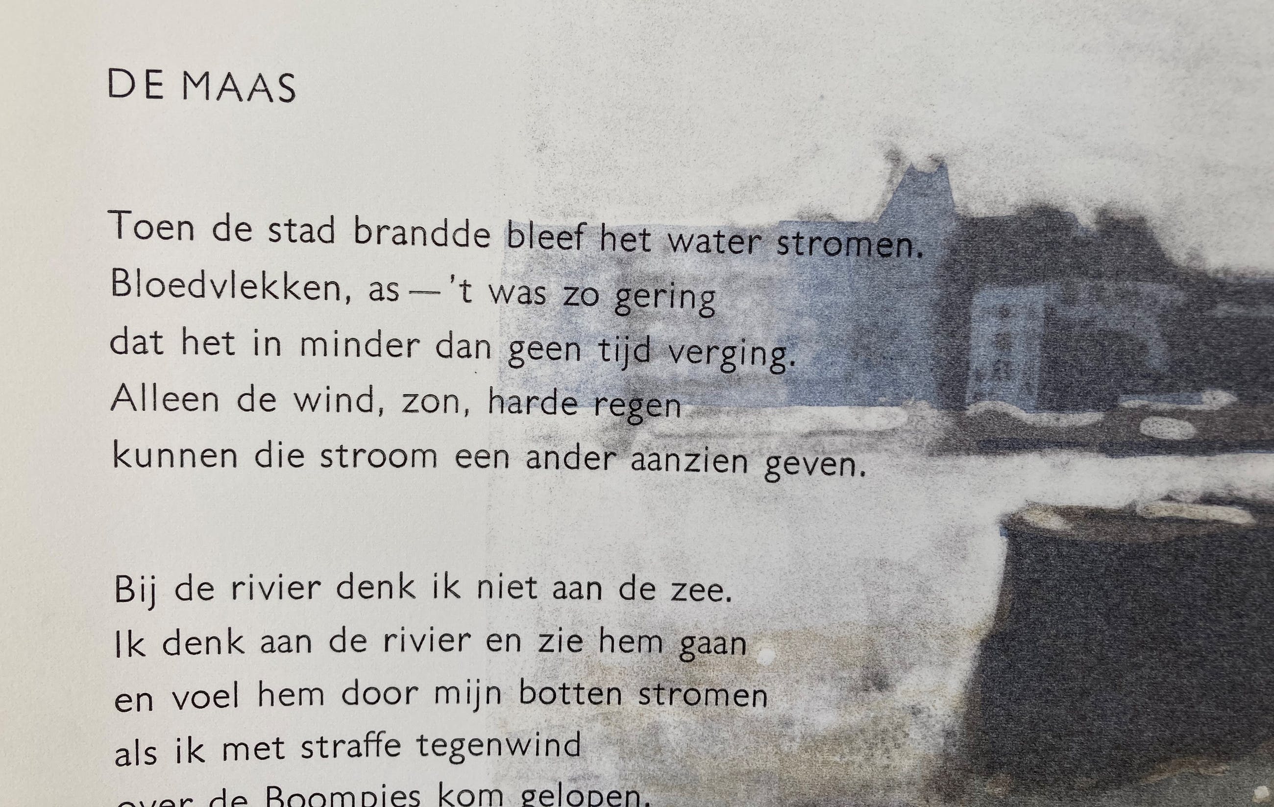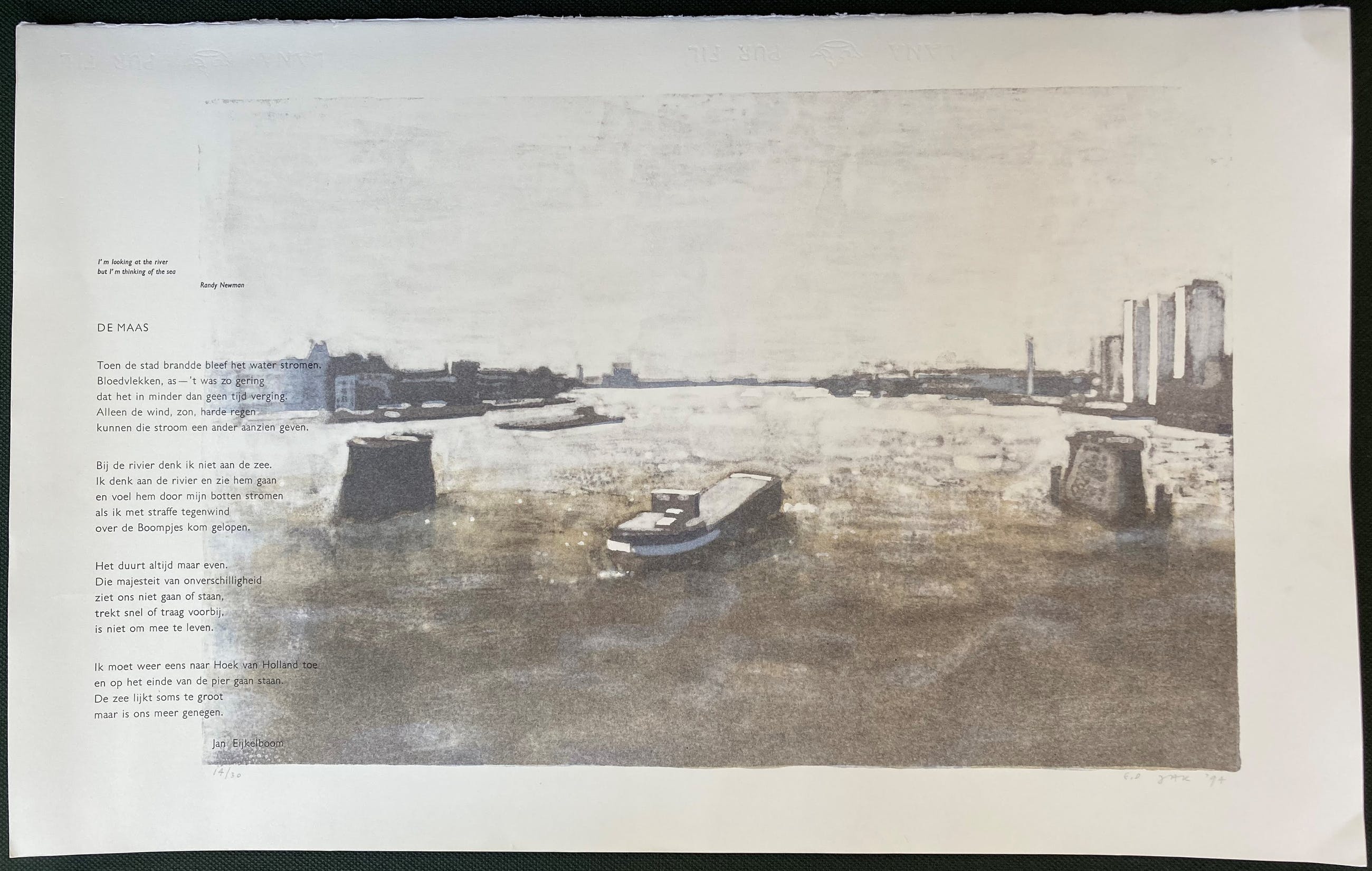 Litho van Hans Koopman met een gedicht van Jan Eijkelboom 'De Maas'. Fraaie grote litho in nieuwstaat, niet eerder ingelijst geweest. Afmeting blad: 76 x 48 cm; afmeting beeld: 65 x 39 cm. Oplage 14/30. Gesigneerd en genummerd met potlood.