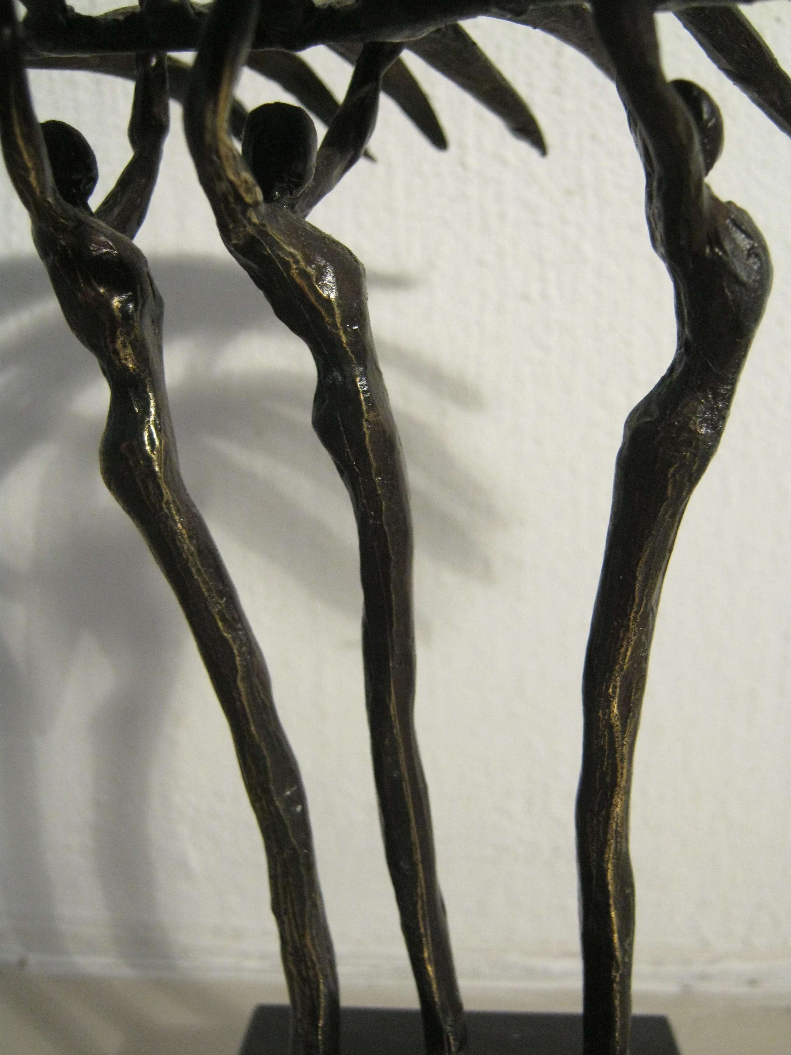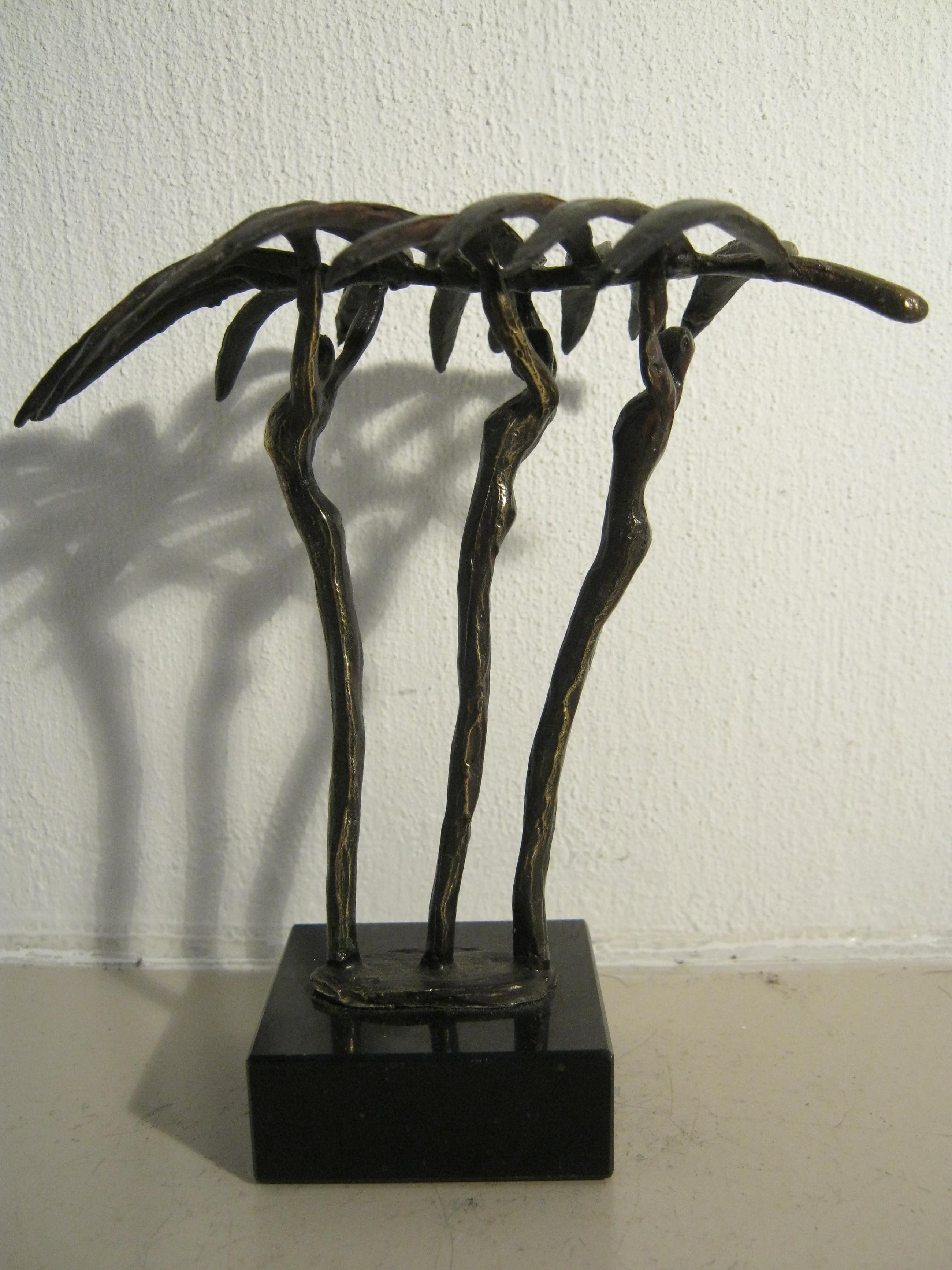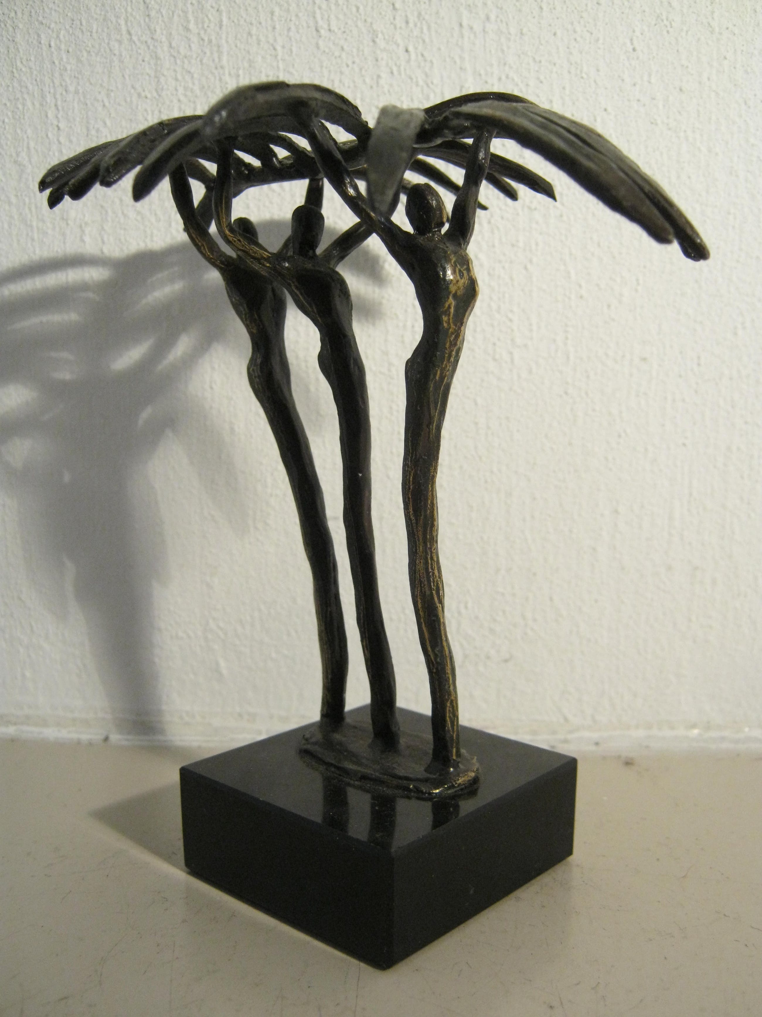 Verbronsd / alloy sculptuur van drie mensfiguren die een palmtak dragen. Uit een serie van vier soortgelijke sculpturen met verschillende bloemen, takken en bladeren. Van de Nederlandse kunstenaar Hans Kuyper, gesigneerd HK.