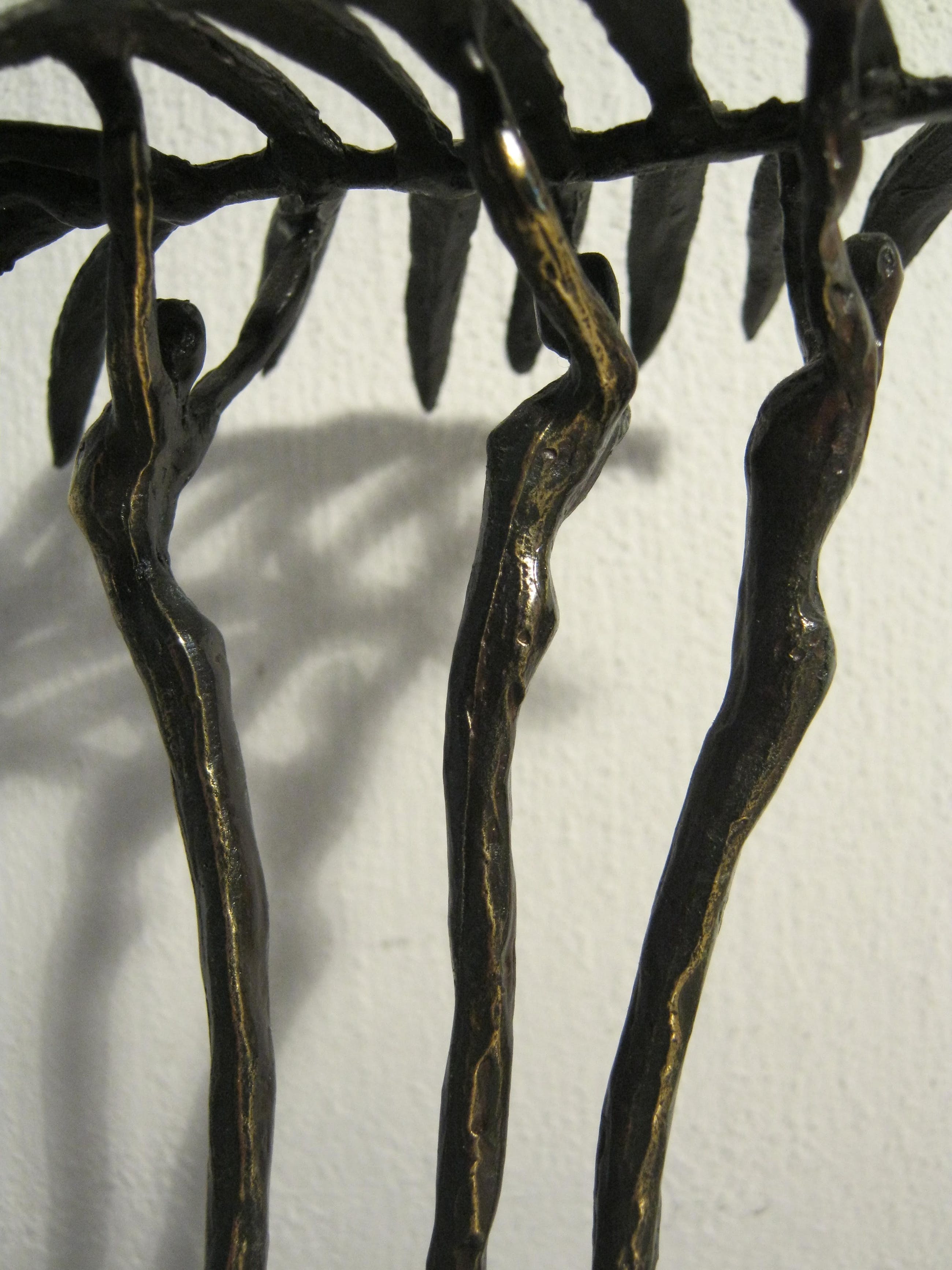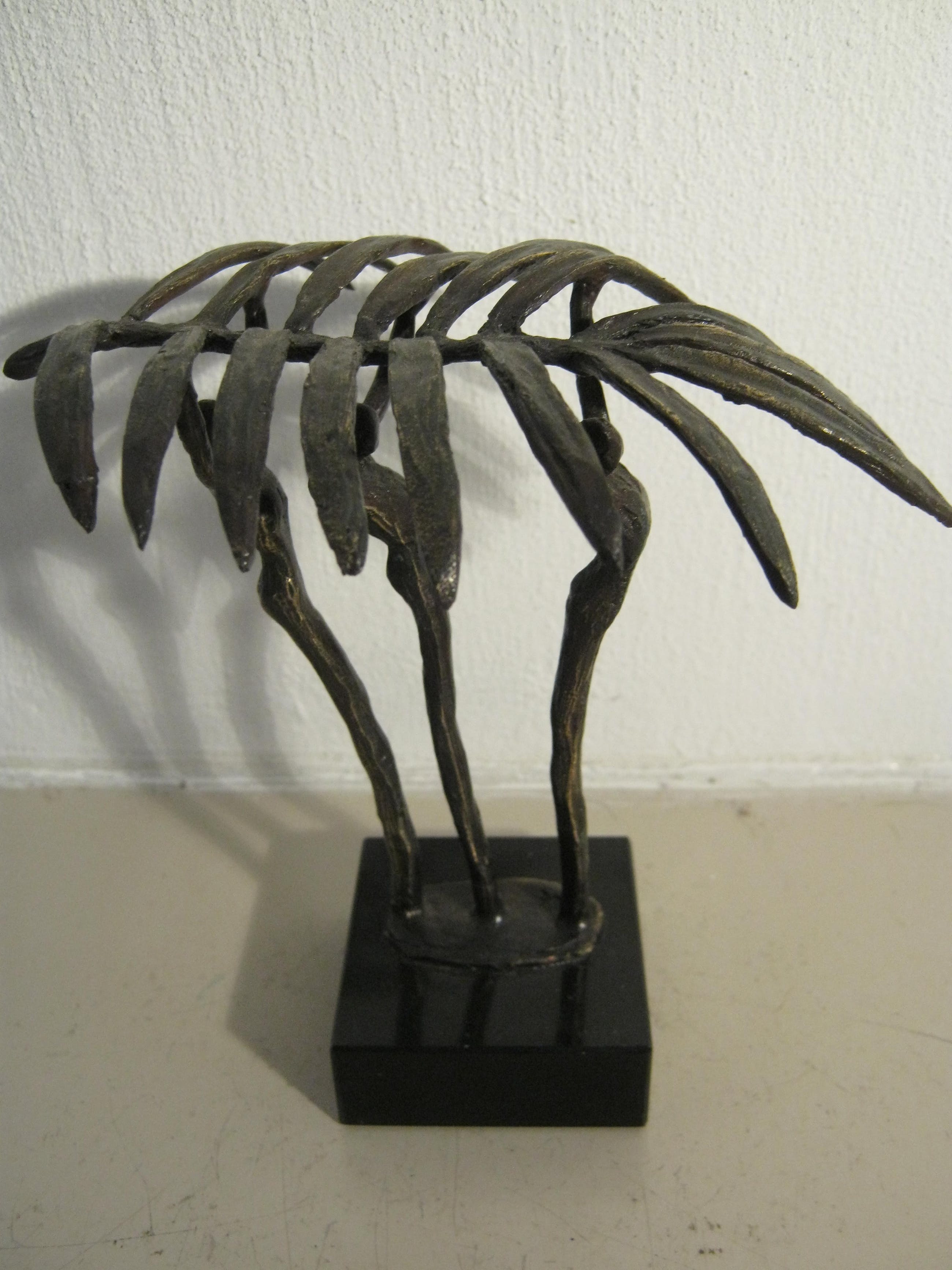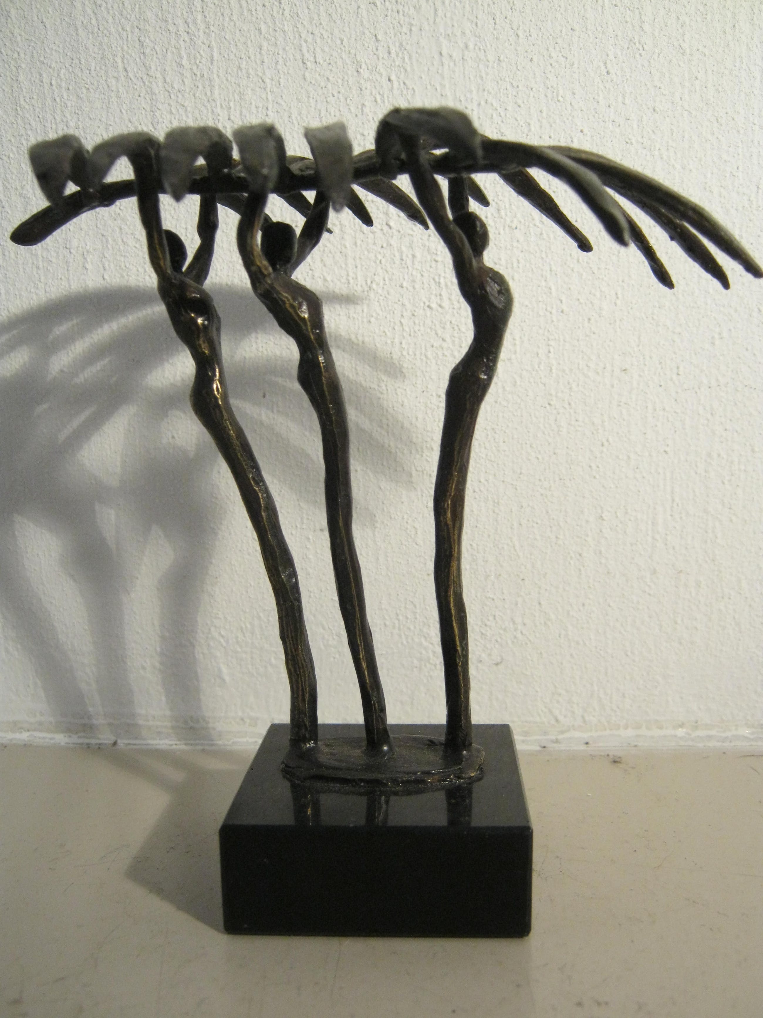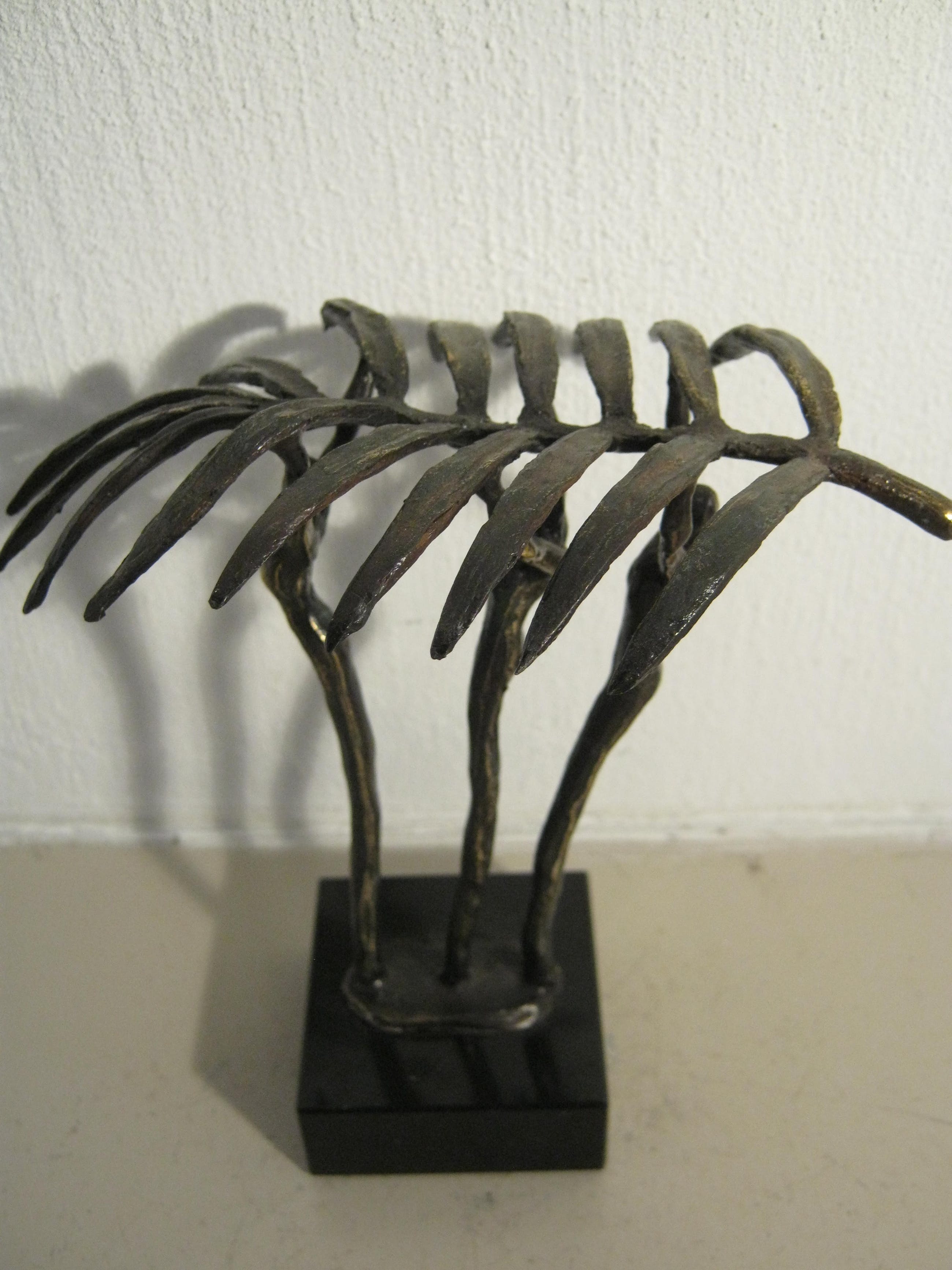 Verbronsd / alloy sculptuur van drie mensfiguren die een palmtak dragen. Uit een serie van vier soortgelijke sculpturen met verschillende bloemen, takken en bladeren. Van de Nederlandse kunstenaar Hans Kuyper, gesigneerd HK.