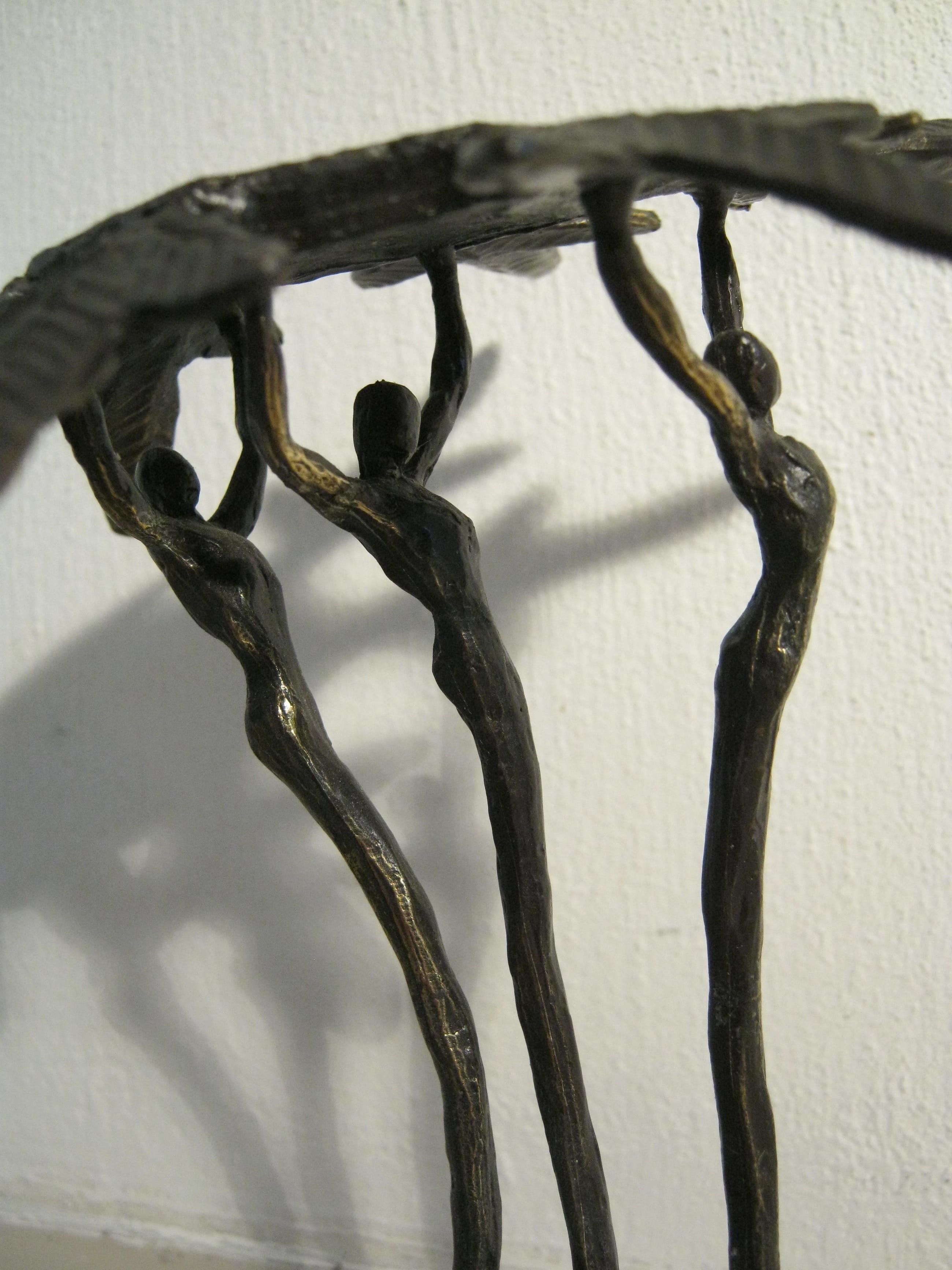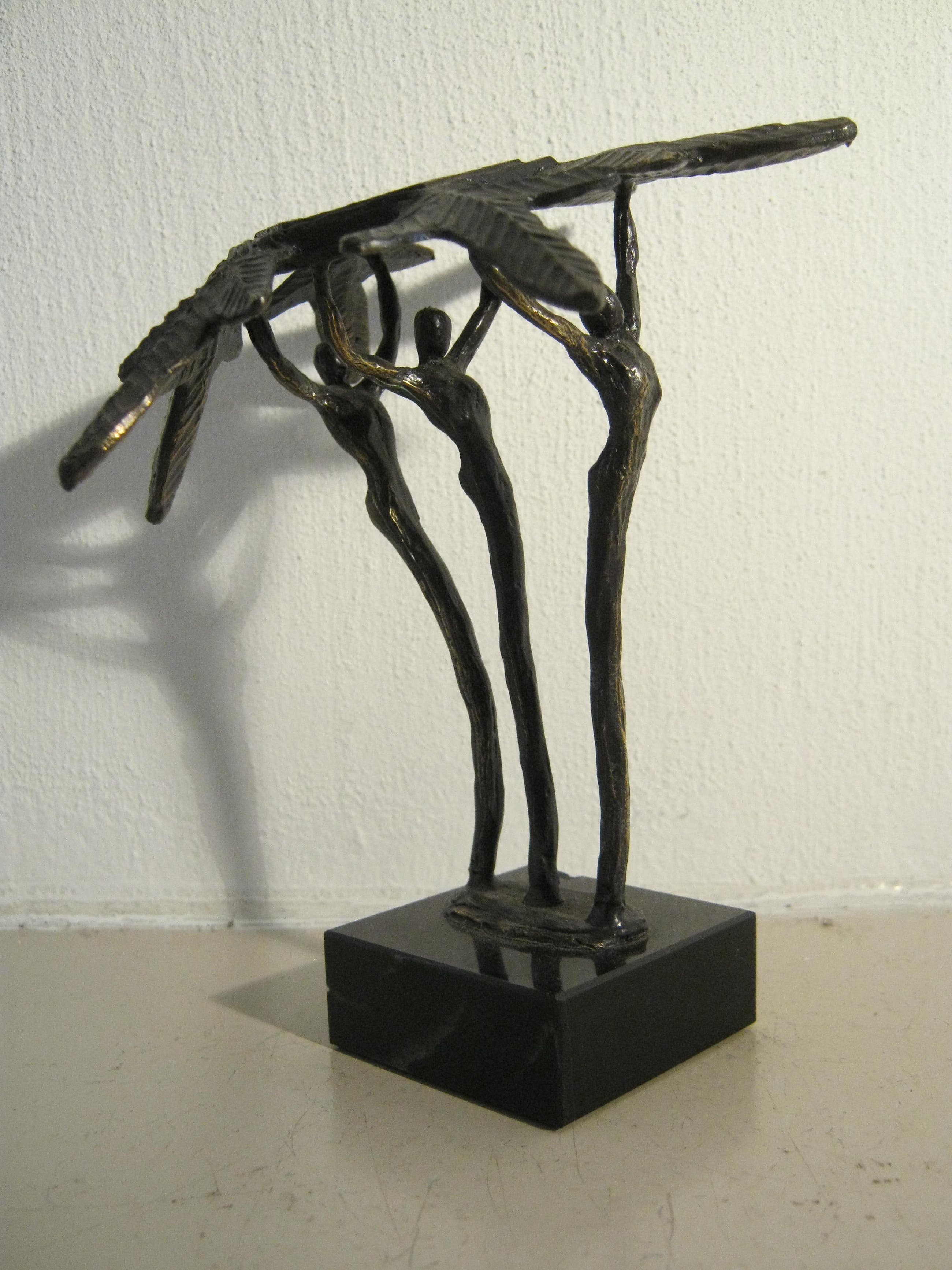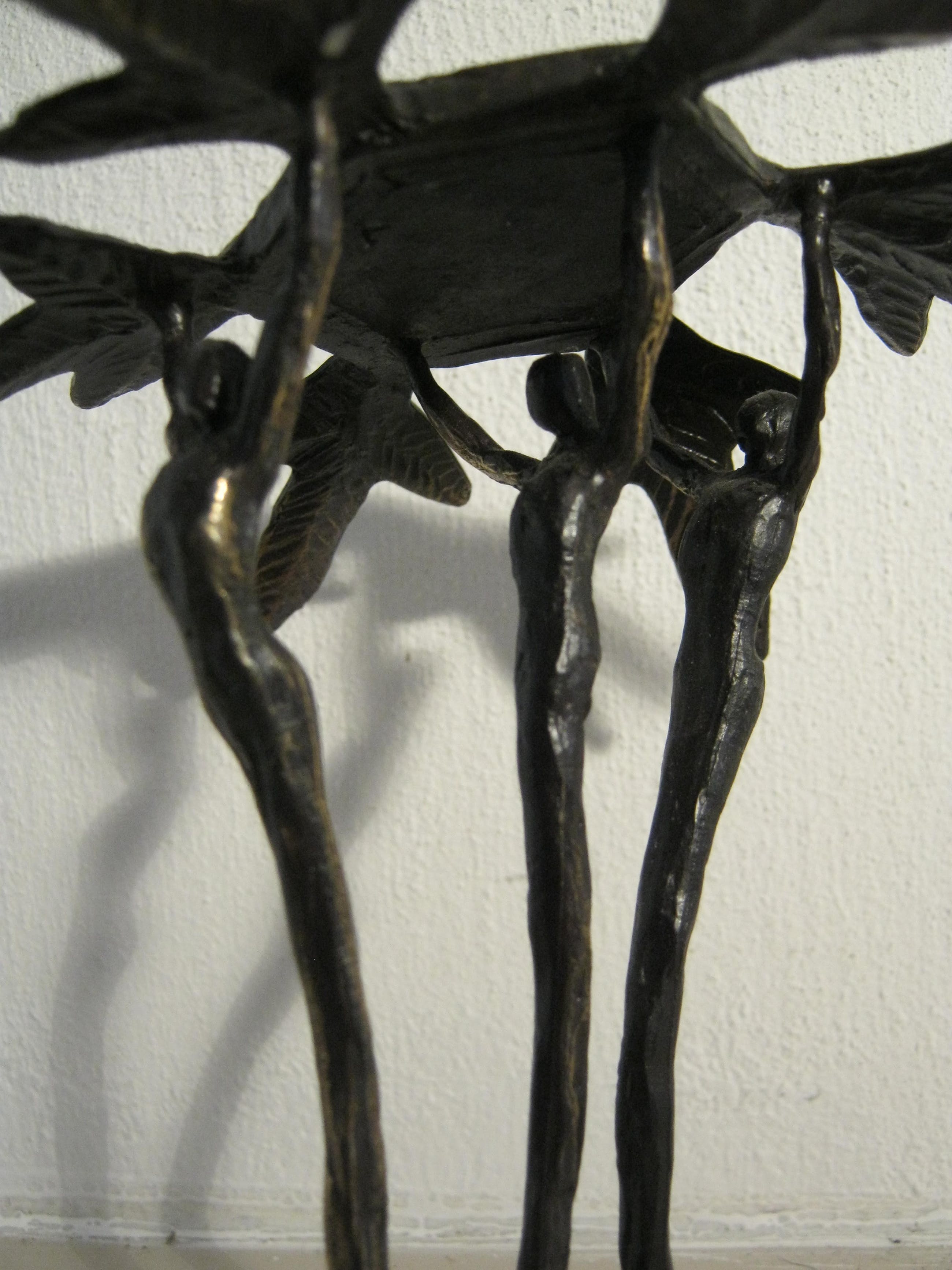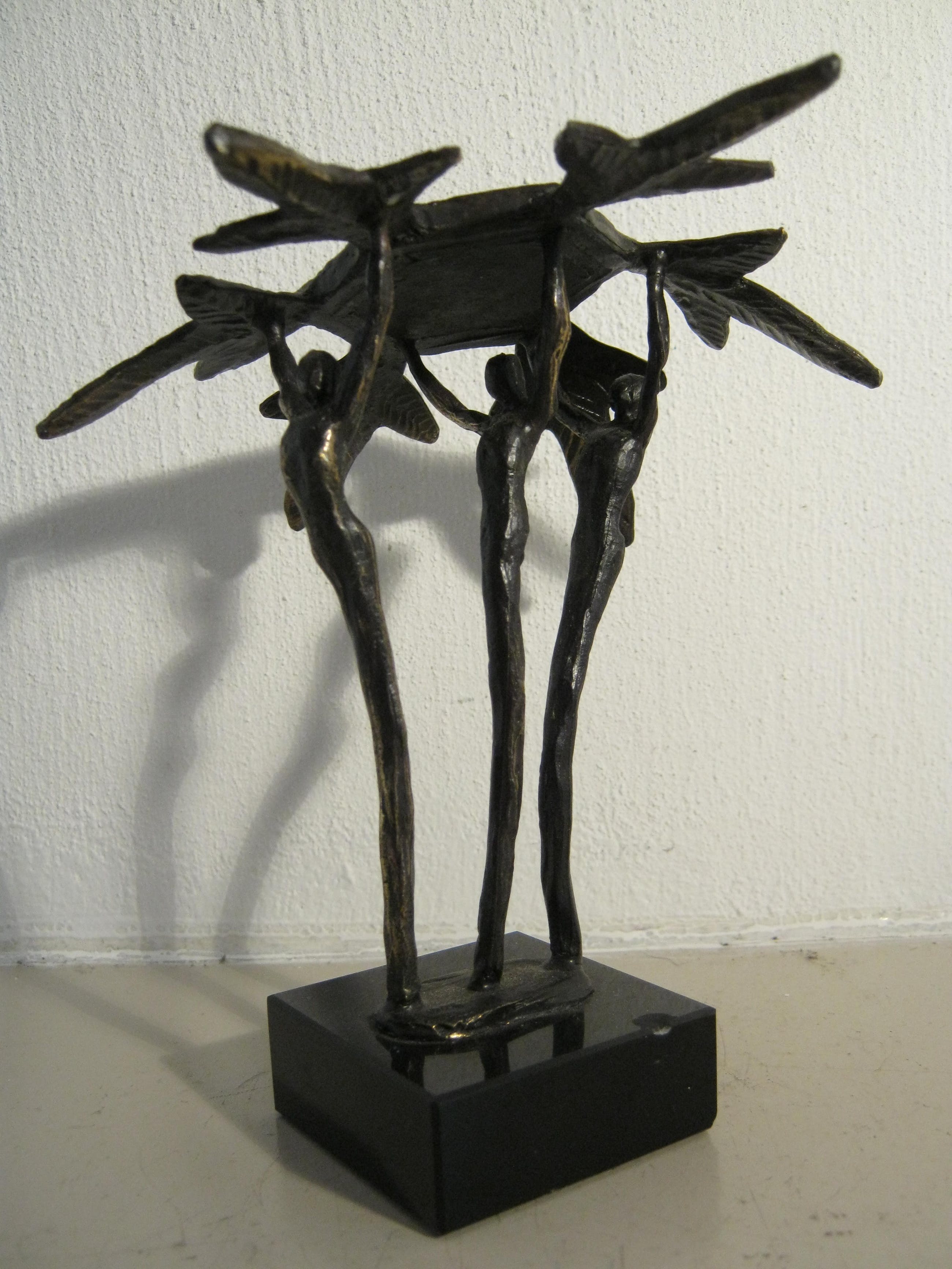 Verbronsd / alloy sculptuur van drie mensfiguren die een grote bloem dragen. Uit een serie van vier soortgelijke sculpturen met verschillende bloemen, takken en bladeren. Van de Nederlandse kunstenaar Hans Kuyper, gesigneerd HK.