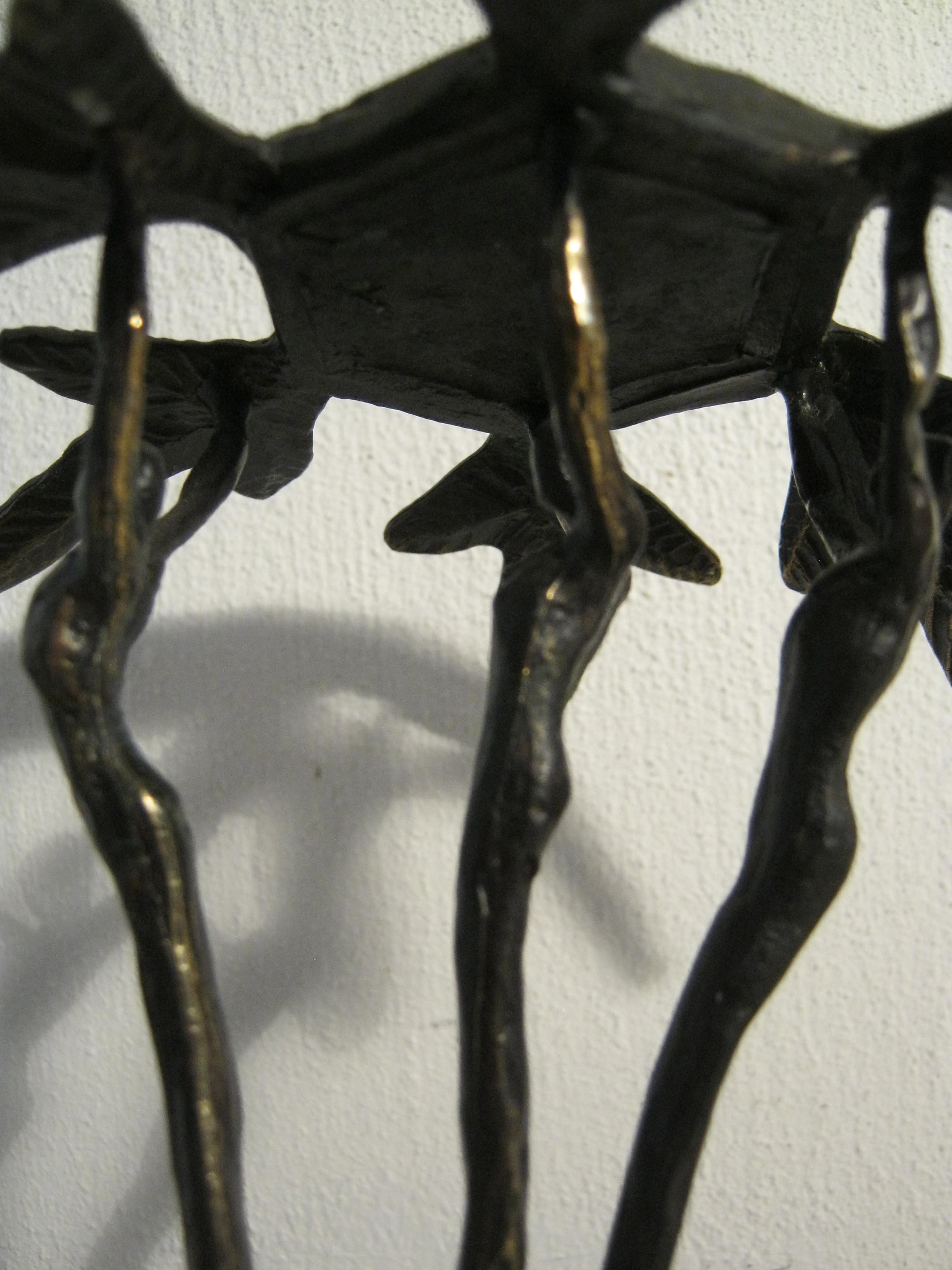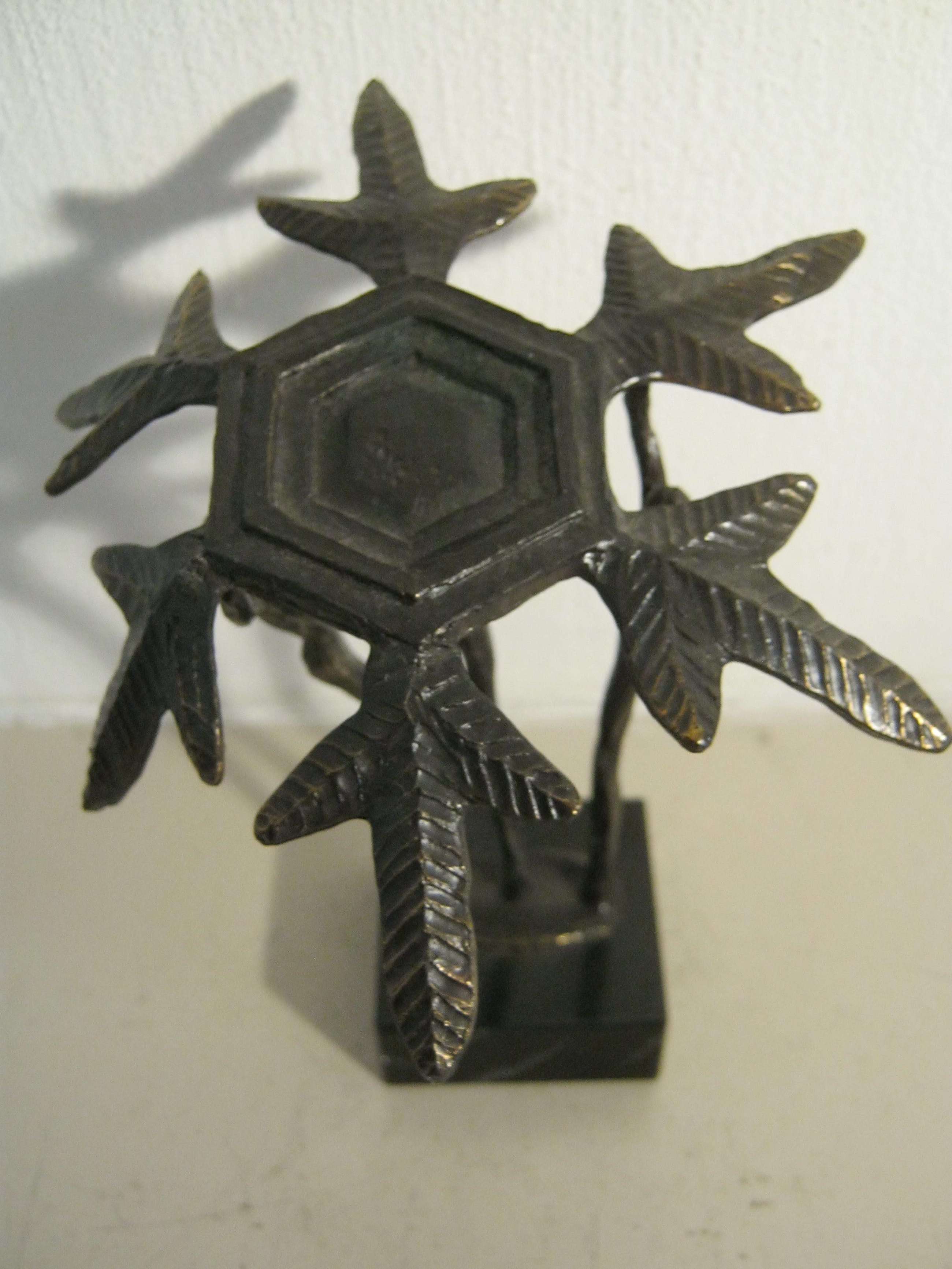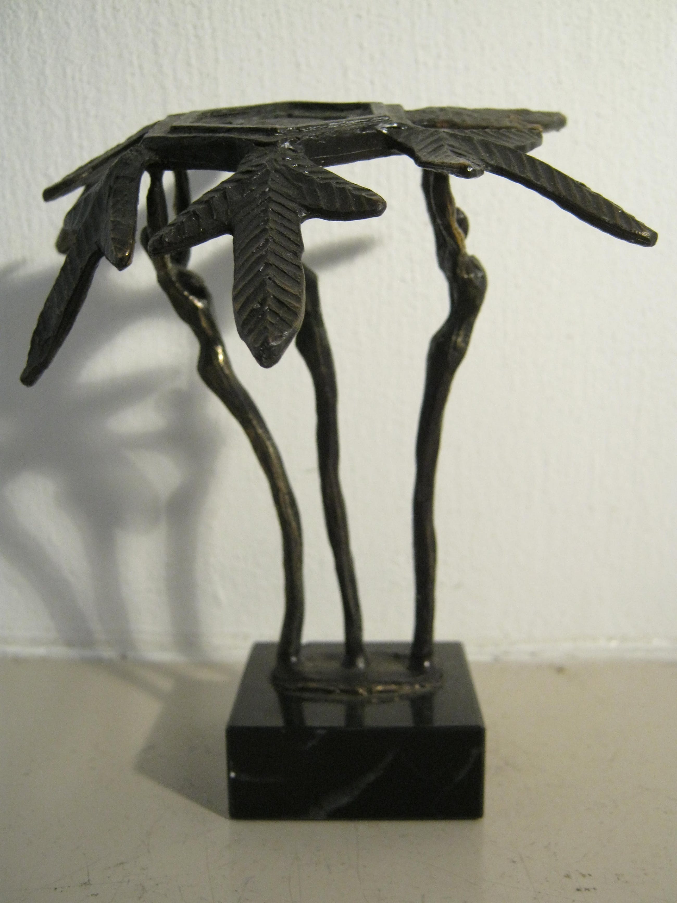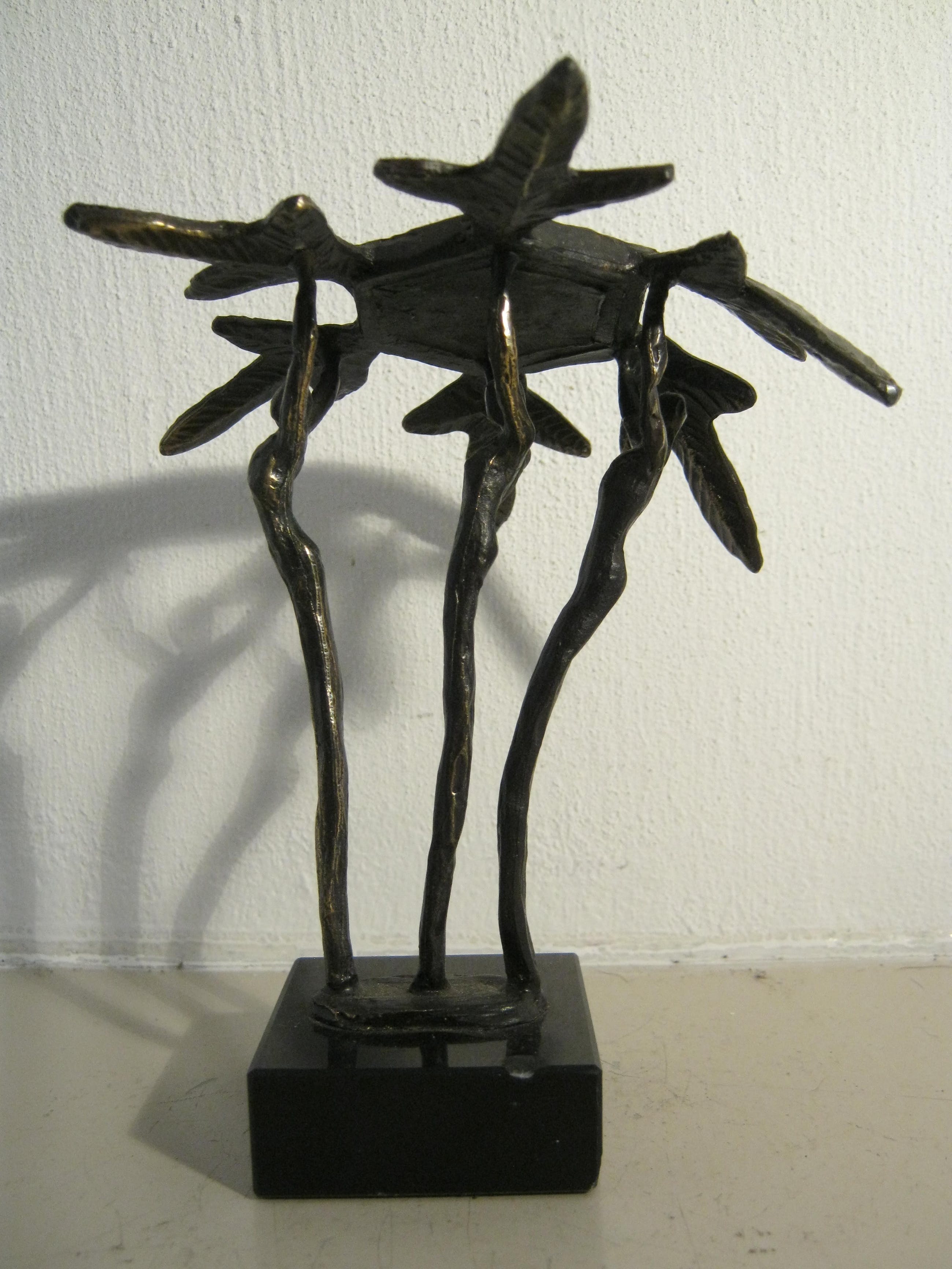Verbronsd / alloy sculptuur van drie mensfiguren die een grote bloem dragen. Uit een serie van vier soortgelijke sculpturen met verschillende bloemen, takken en bladeren. Van de Nederlandse kunstenaar Hans Kuyper, gesigneerd HK.