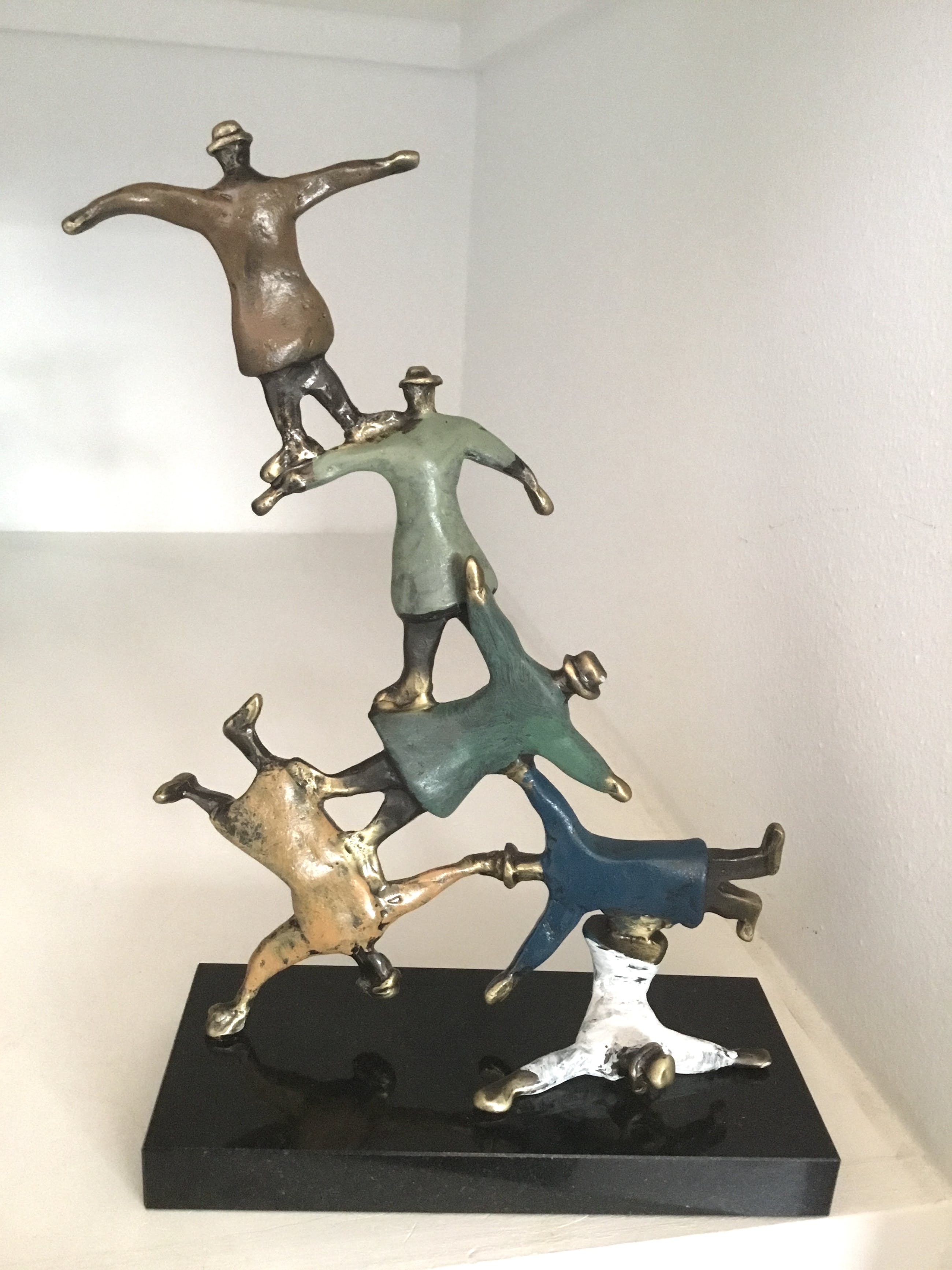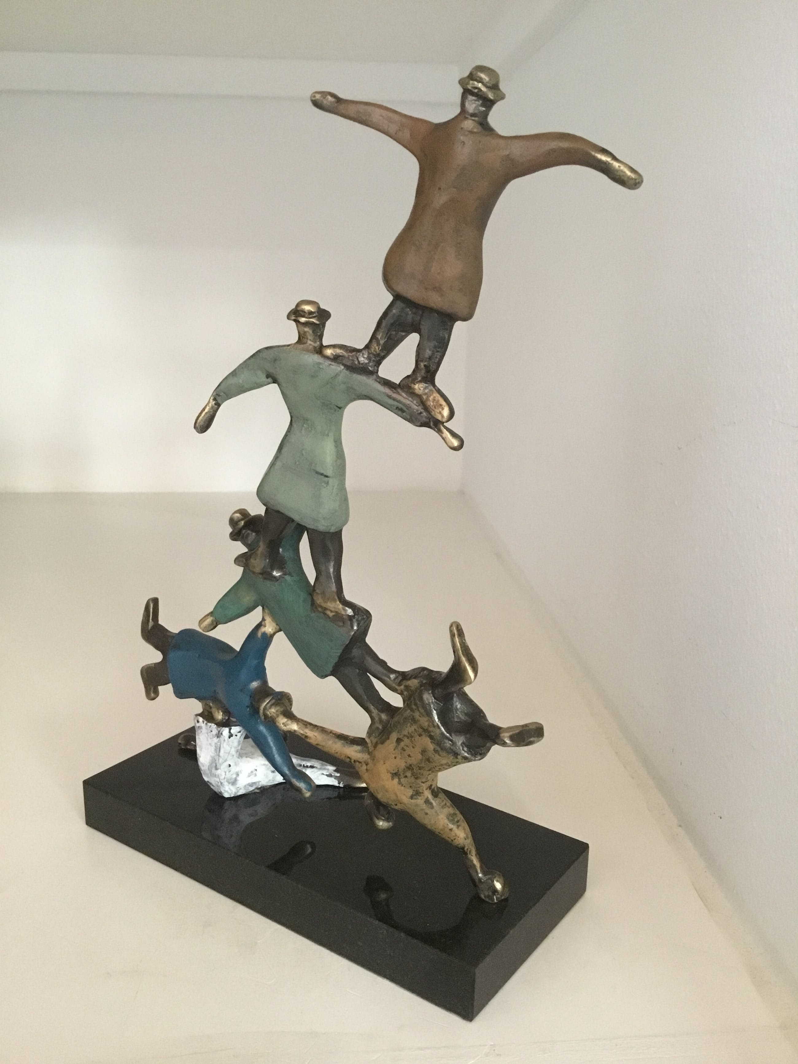 Schitterend kleurrijk sculptuur waarbij de kunstenaar heeft weergegeven dat als mensen elkaar ondersteunen niets onmogelijk is ! Titel “ The sky is the limit “ Kunstenaar: Hans Kuyper Hoogte : 27 cm Breedte : 18 cm Materiaal: verbronsd metaal op zwart marmeren sokkel. Het beeld verkeert in zeer goede staat en wordt zorgvuldig verpakt en aangetekend verzonden.