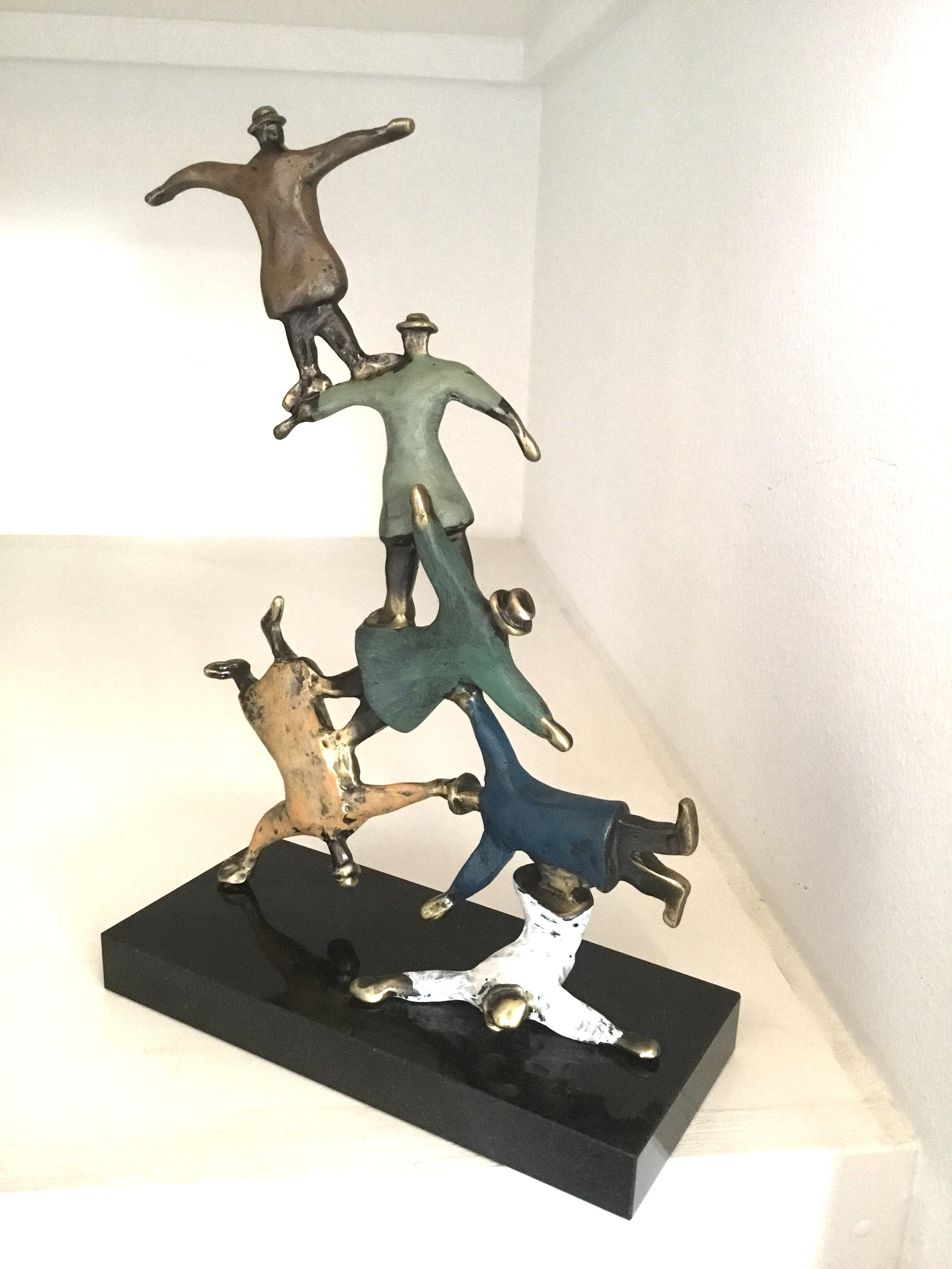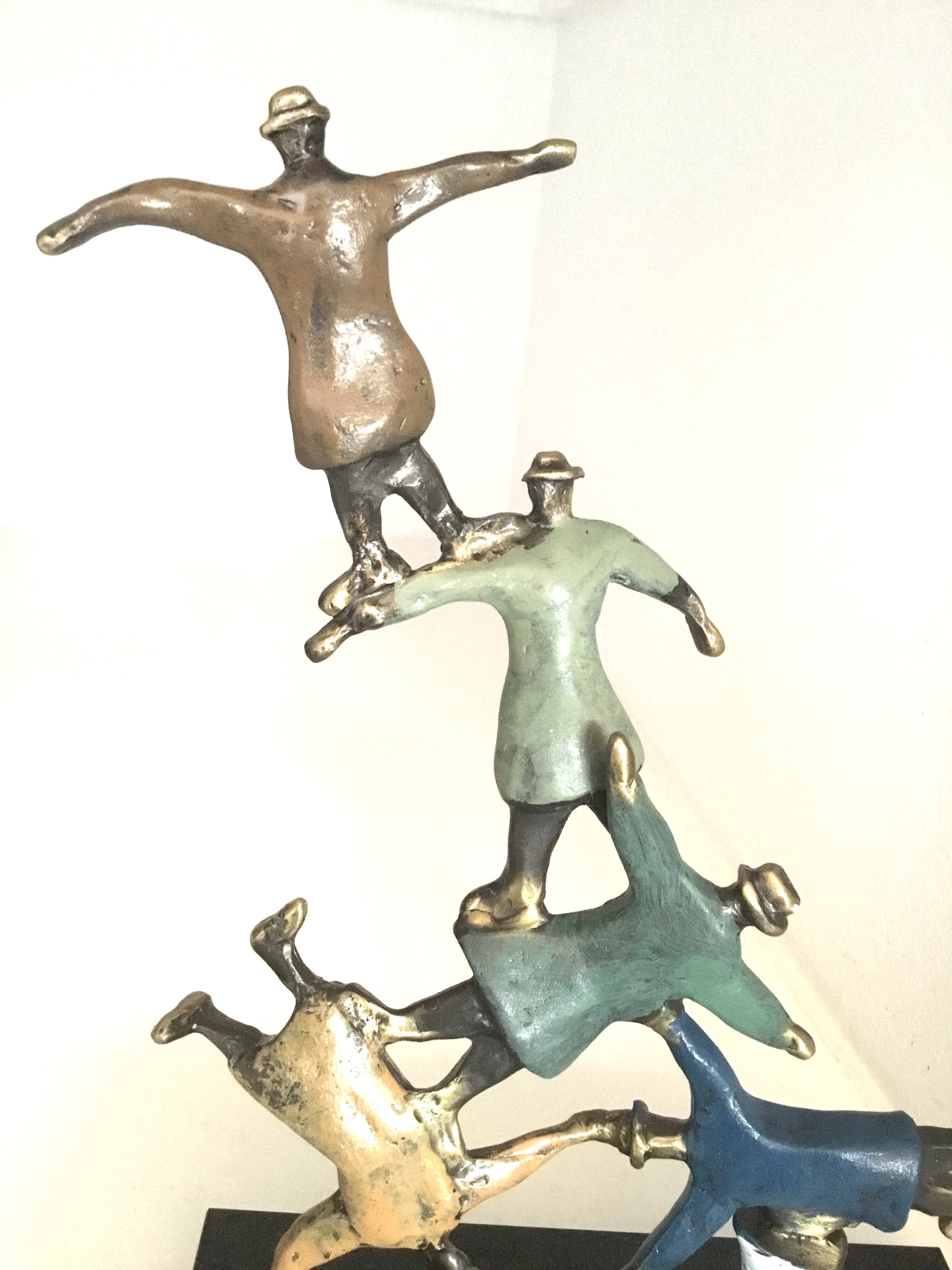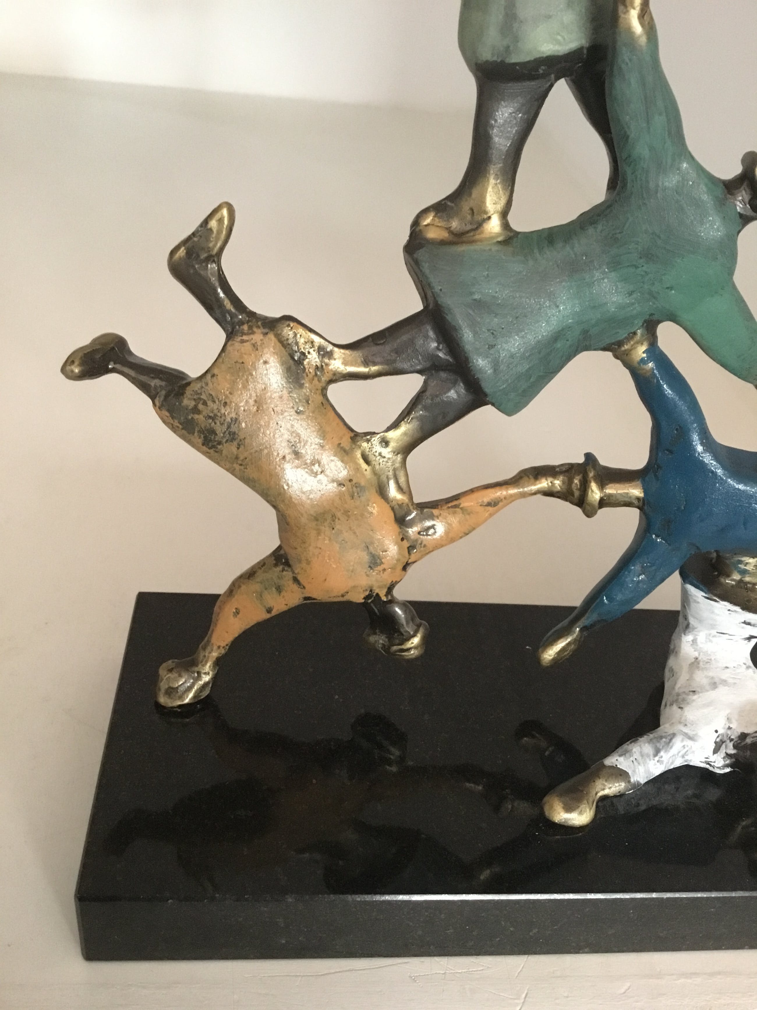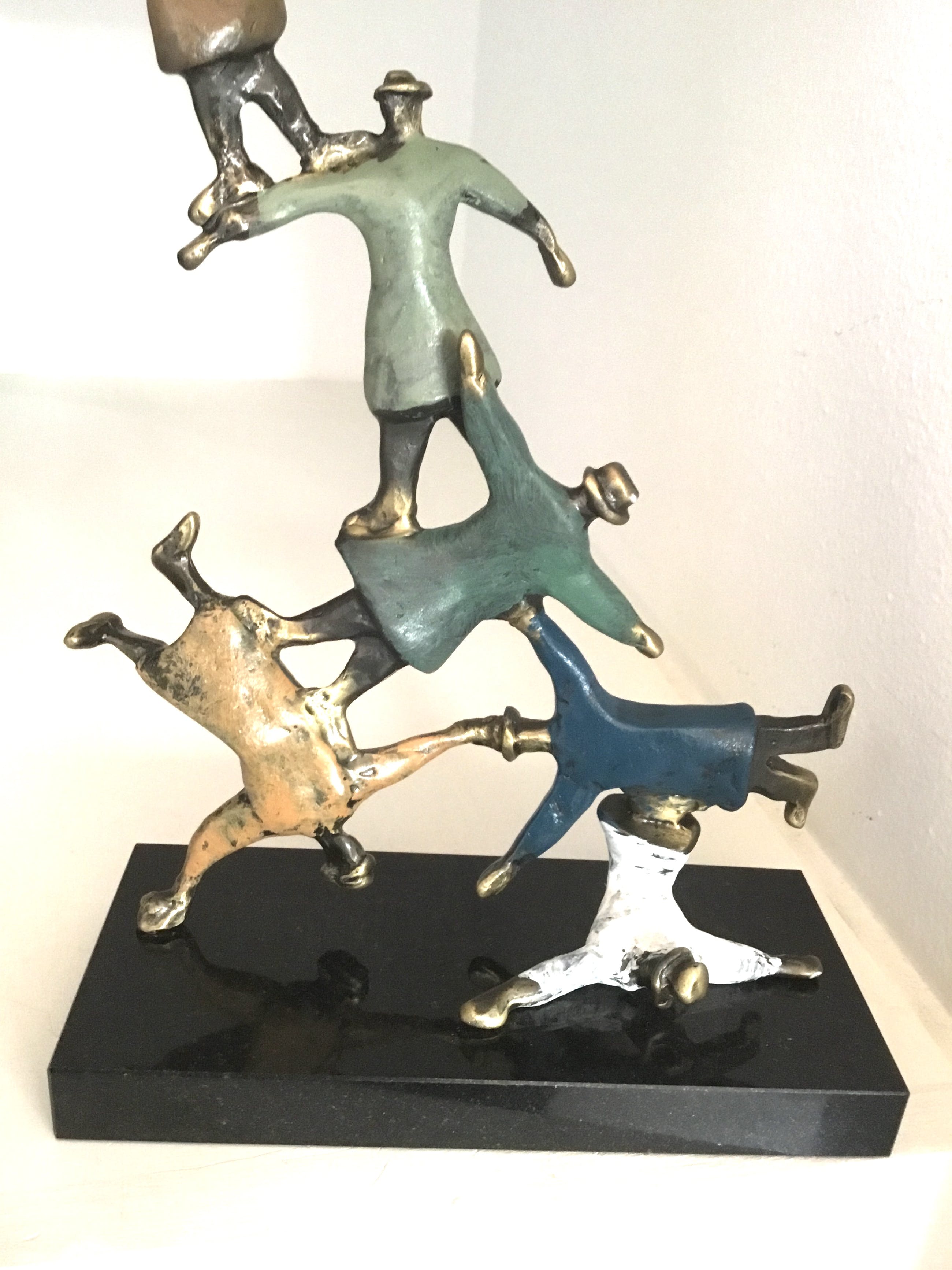 Schitterend kleurrijk sculptuur waarbij de kunstenaar heeft weergegeven dat als mensen elkaar ondersteunen niets onmogelijk is ! Titel “ The sky is the limit “ Kunstenaar: Hans Kuyper Hoogte : 27 cm Breedte : 18 cm Materiaal: verbronsd metaal op zwart marmeren sokkel. Het beeld verkeert in zeer goede staat en wordt zorgvuldig verpakt en aangetekend verzonden.