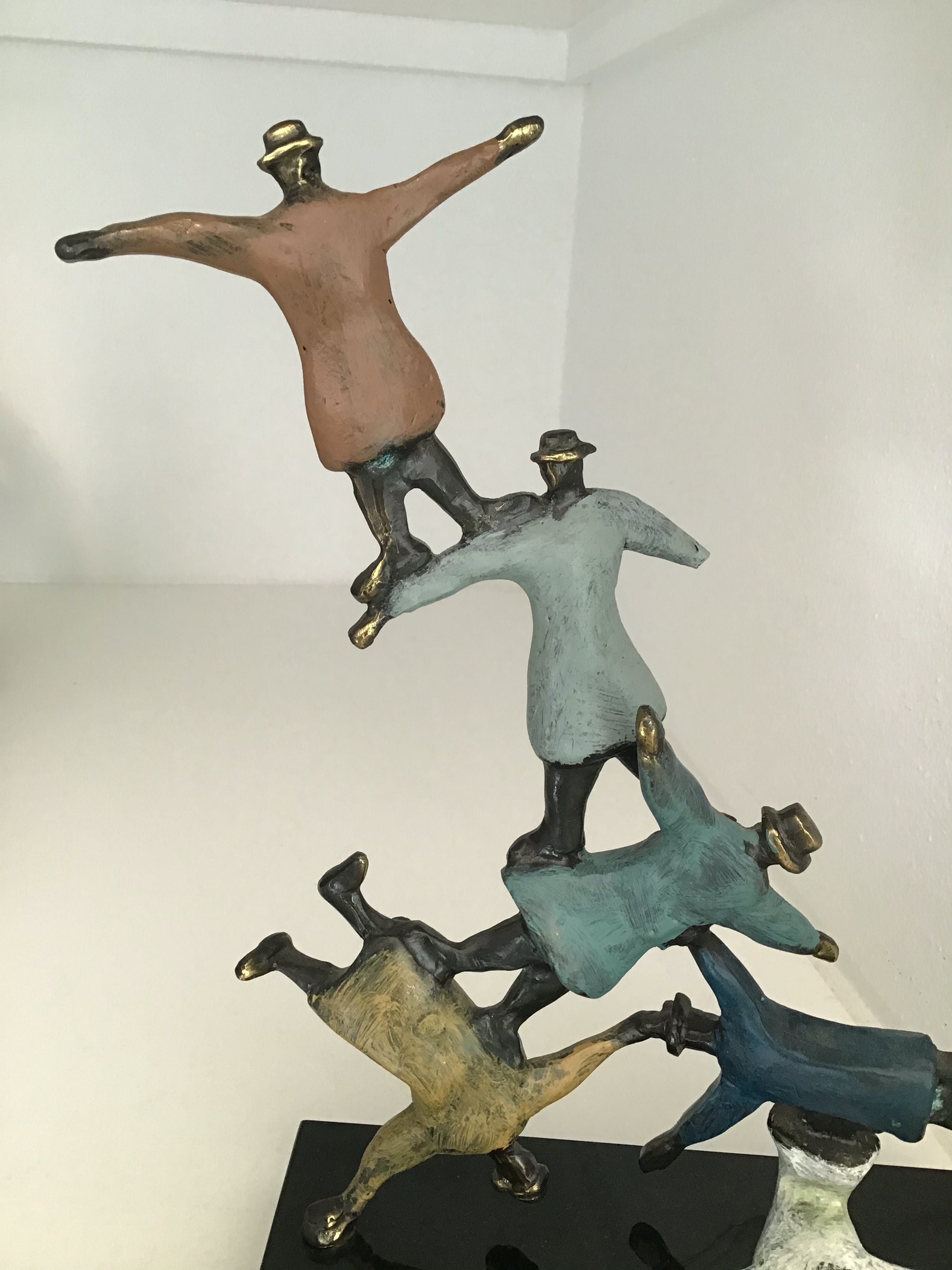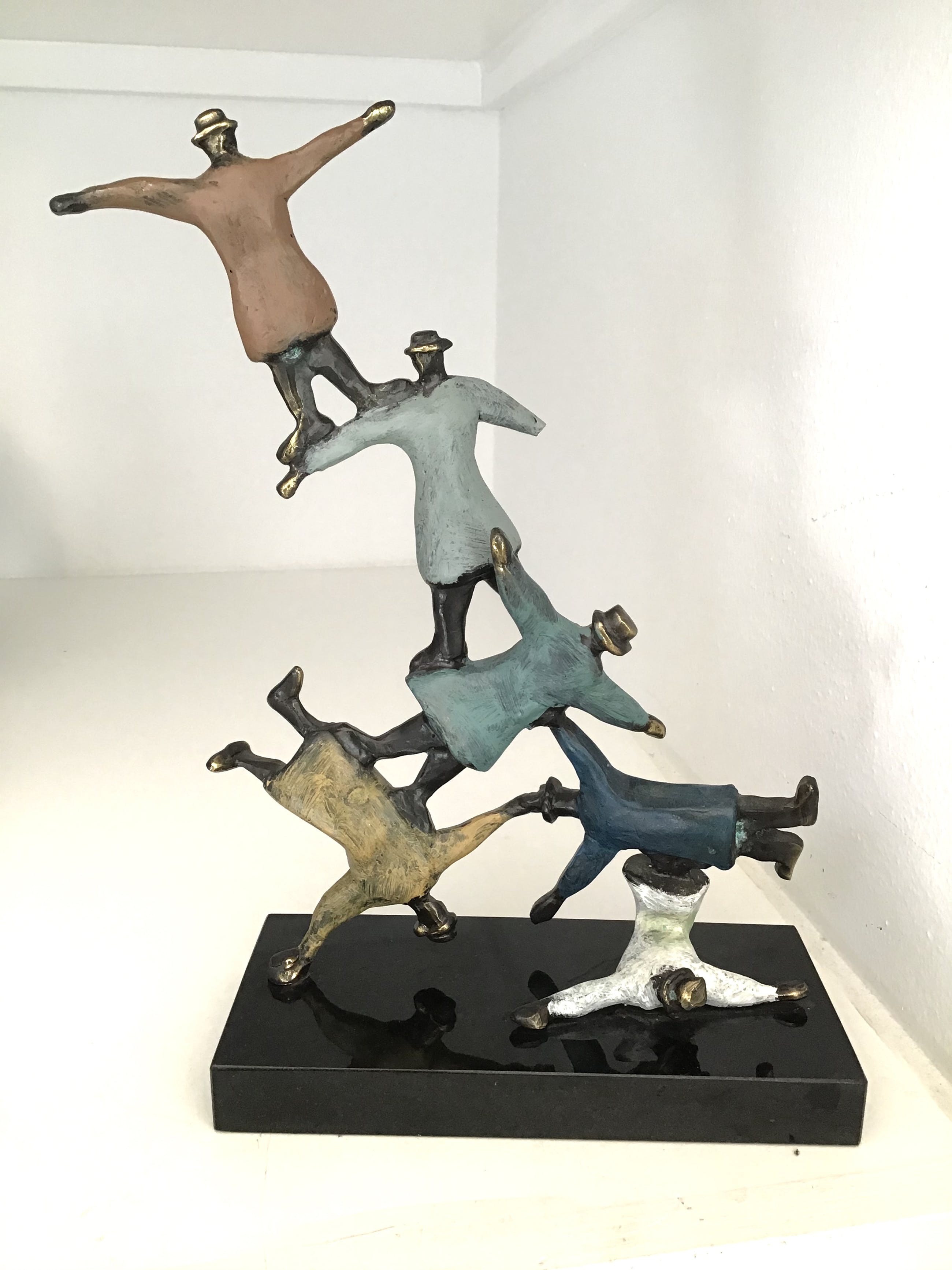 Schitterend kleurrijk sculptuur waarbij de kunstenaar heeft weergegeven dat als mensen elkaar ondersteunen niets onmogelijk is ! Titel “ The sky is the limit “ Kunstenaar: Hans Kuyper Hoogte : 27 cm Breedte : 18 cm Materiaal: verbronsd metaal op zwart marmeren sokkel. Het beeld verkeert in goede staat en wordt zorgvuldig verpakt en aangetekend verzonden.