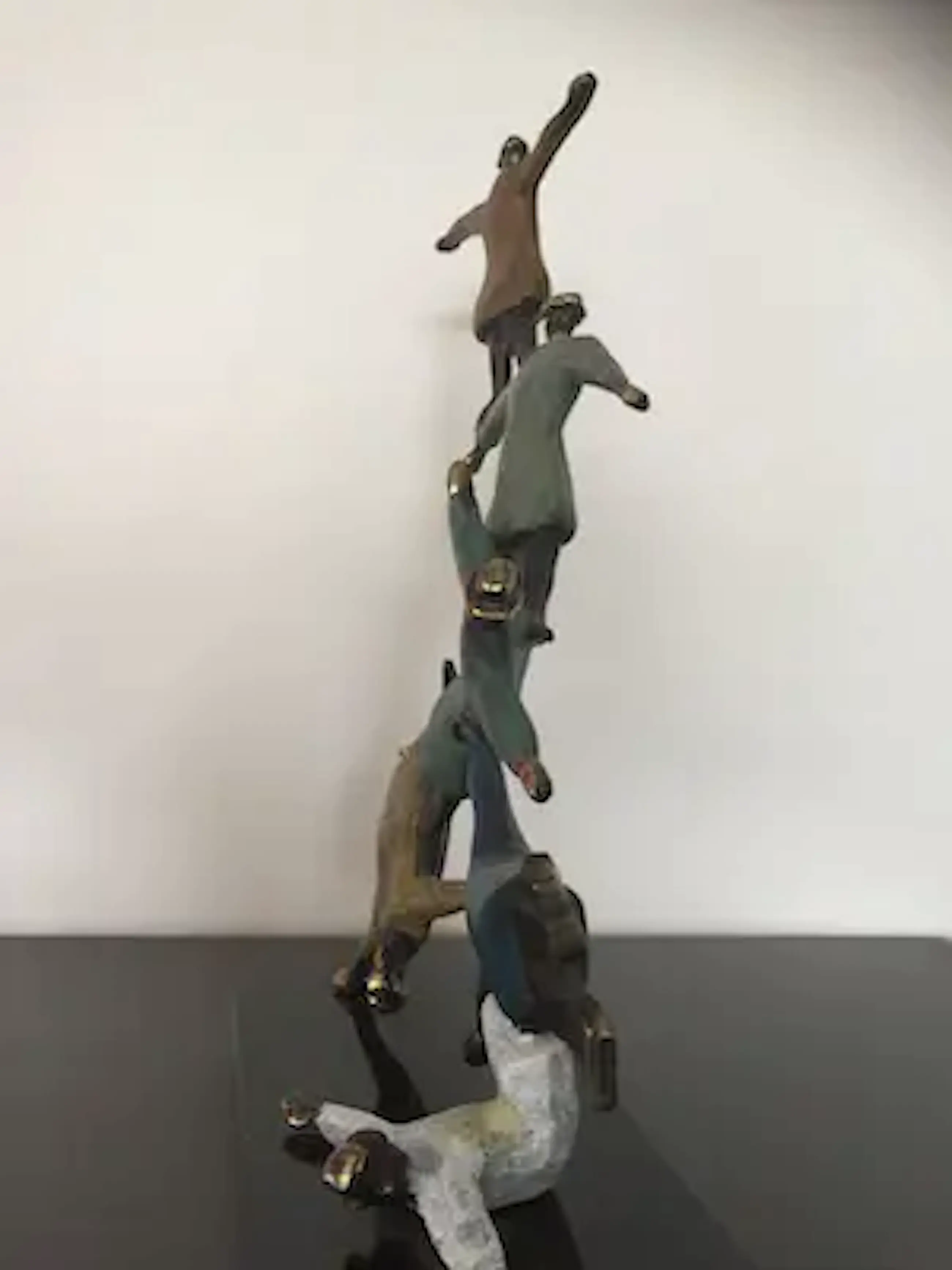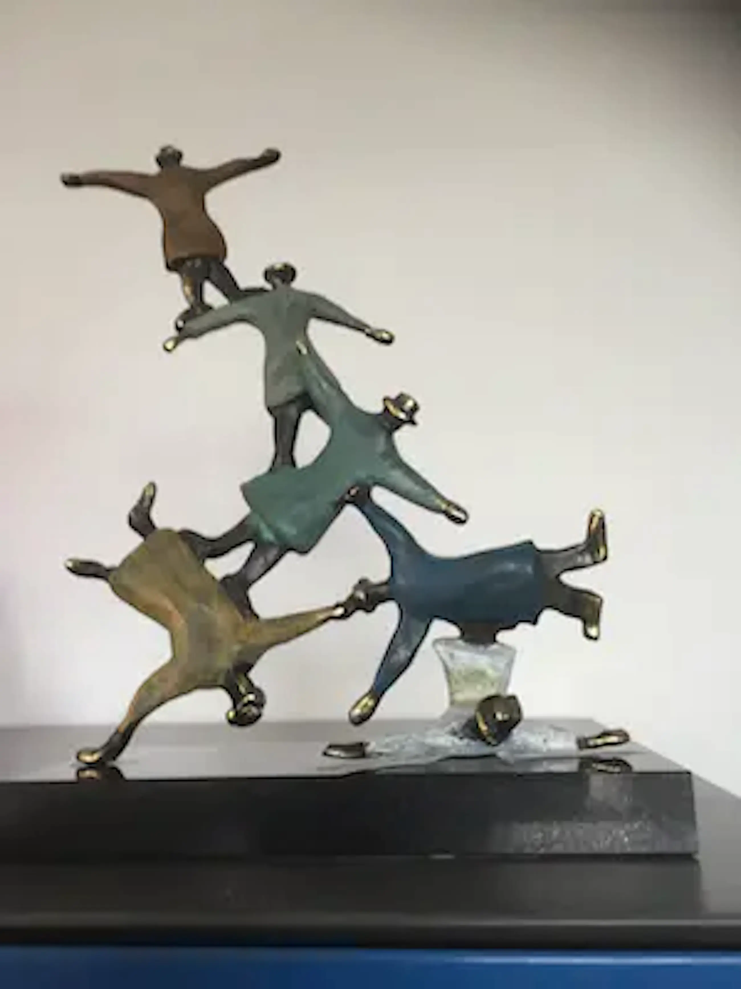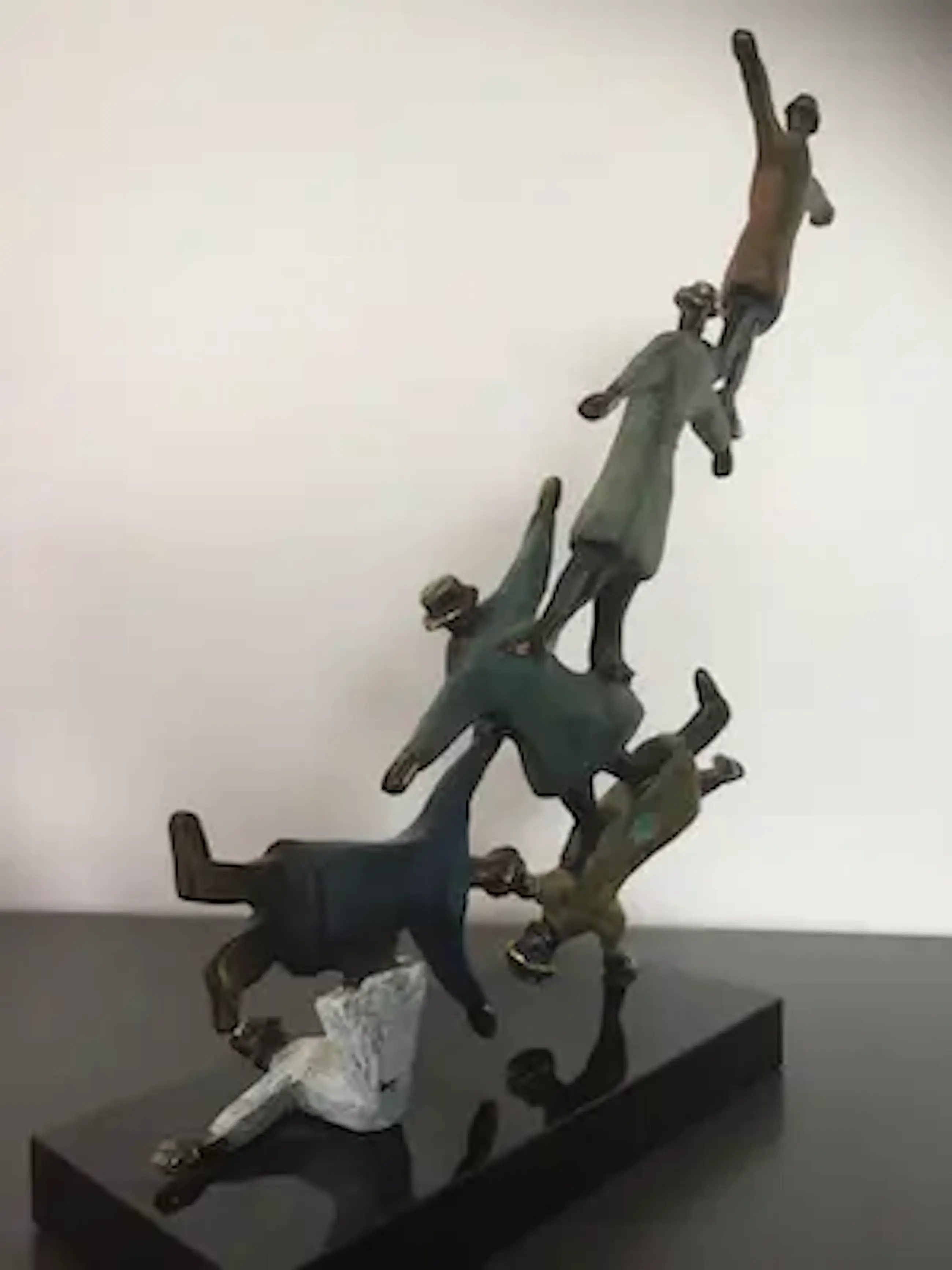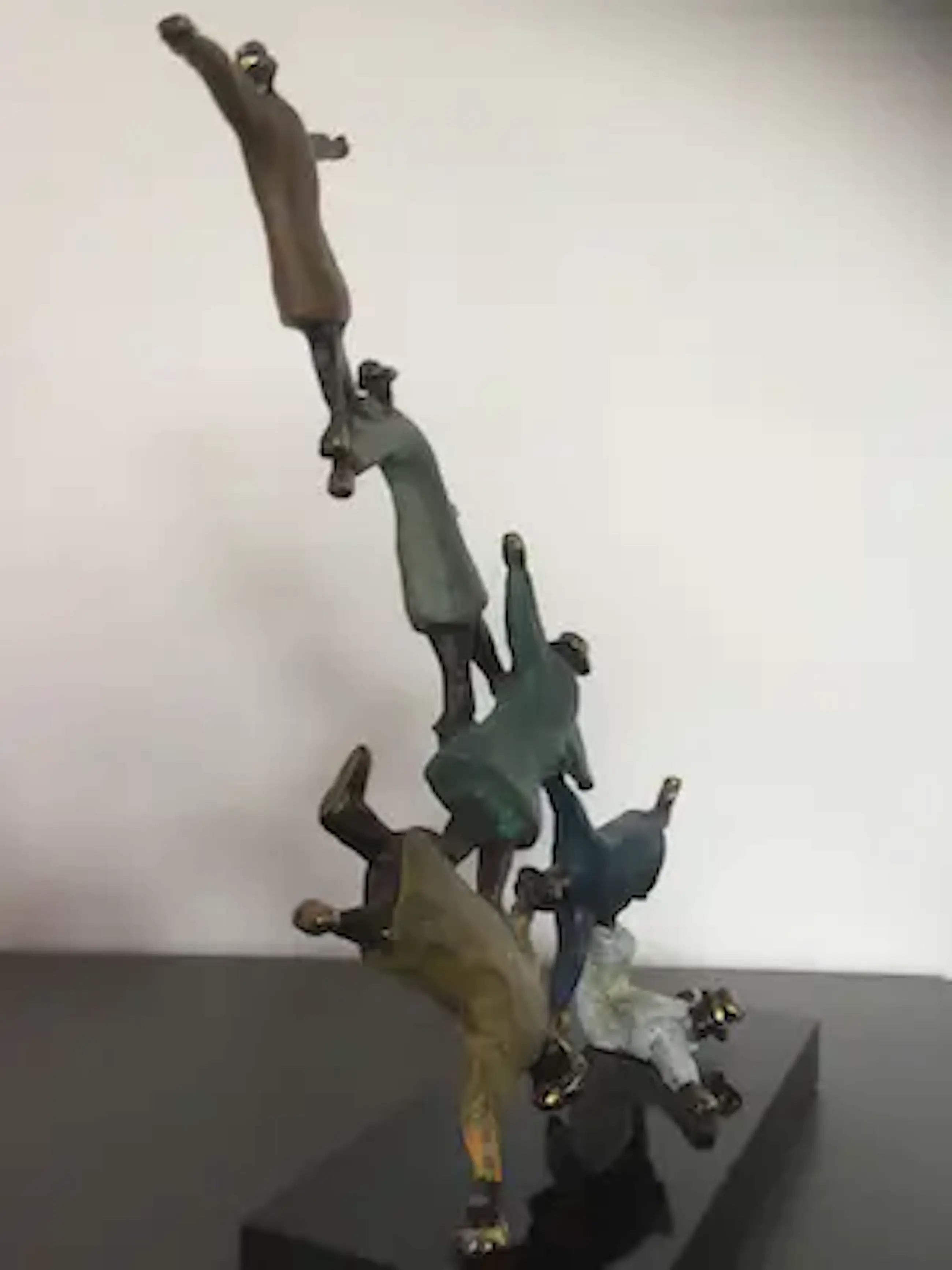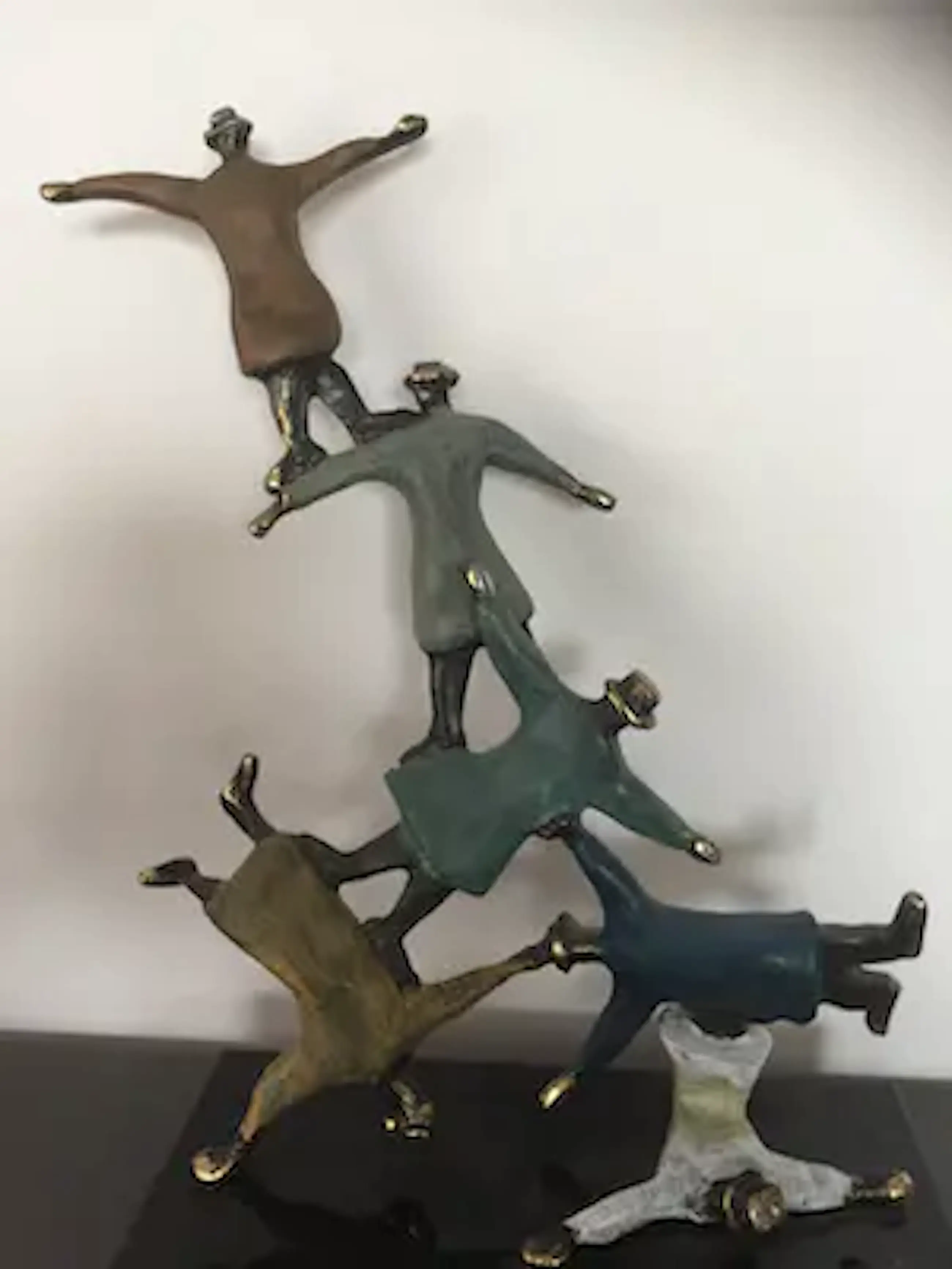 Mannen met bolhoeden lijkend op figuren van Magritte die dolkomisch een toren vormen. Prachtig kleurrijk sculptuur waarbij de kunstenaar heeft weergegeven dat als mensen elkaar ondersteunen en samenwerken werkelijk niets onmogelijk is!