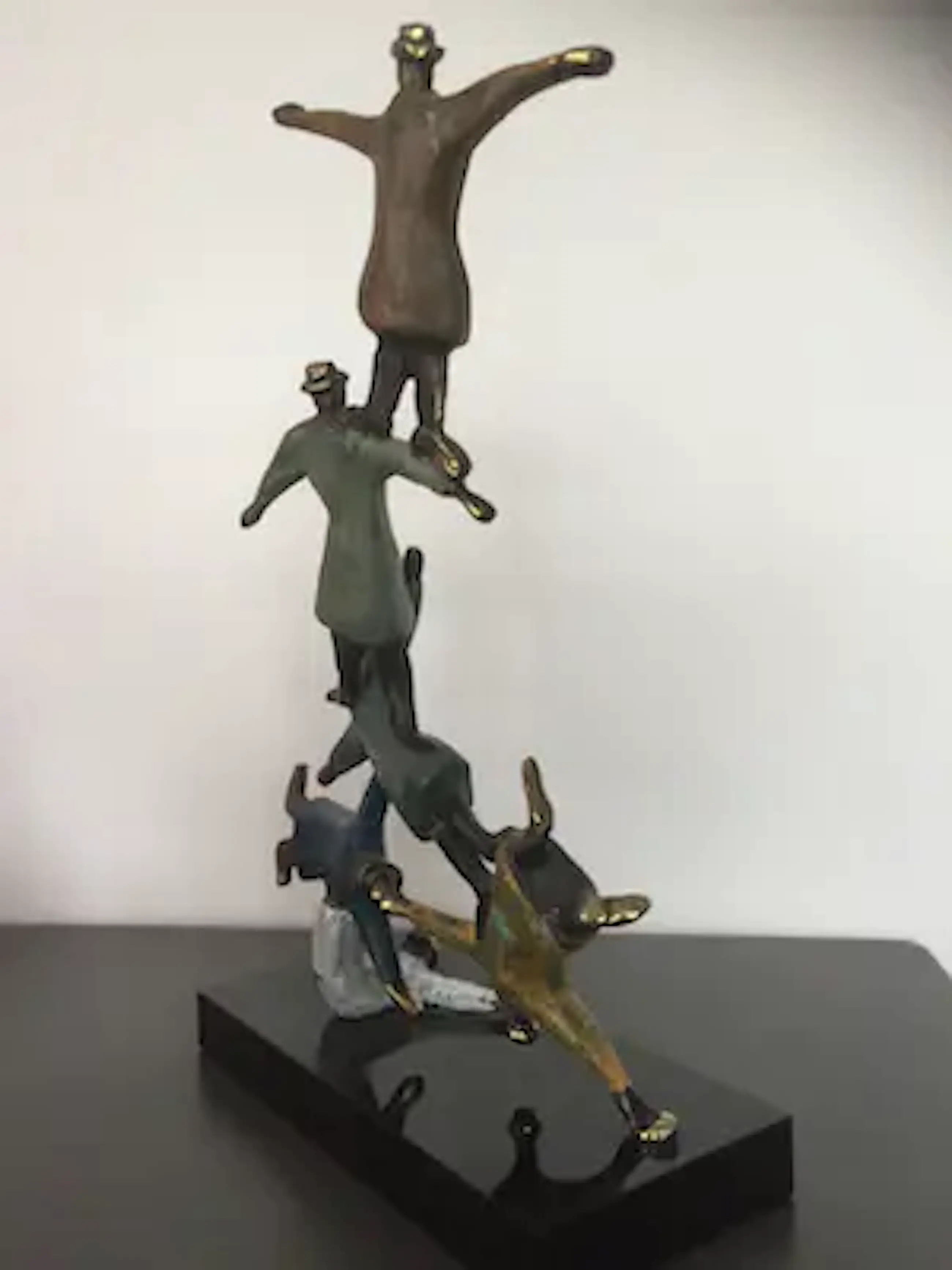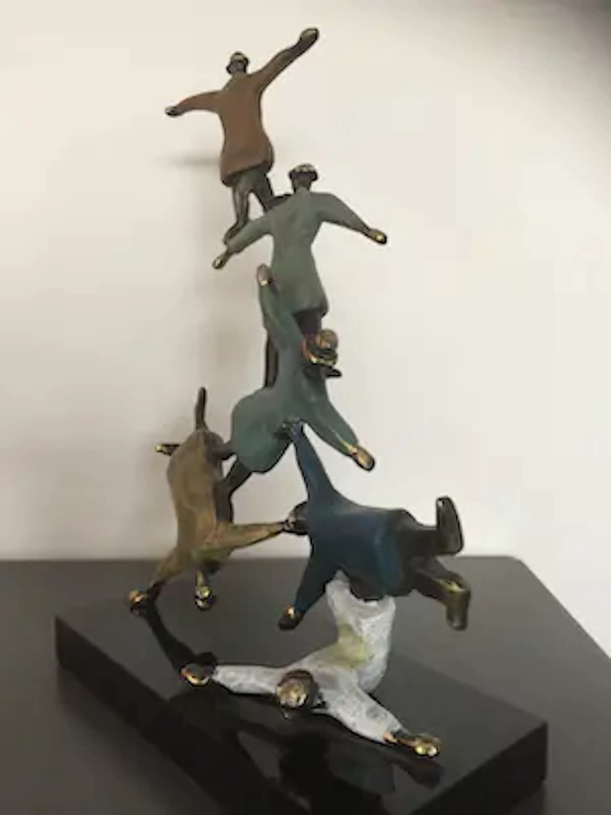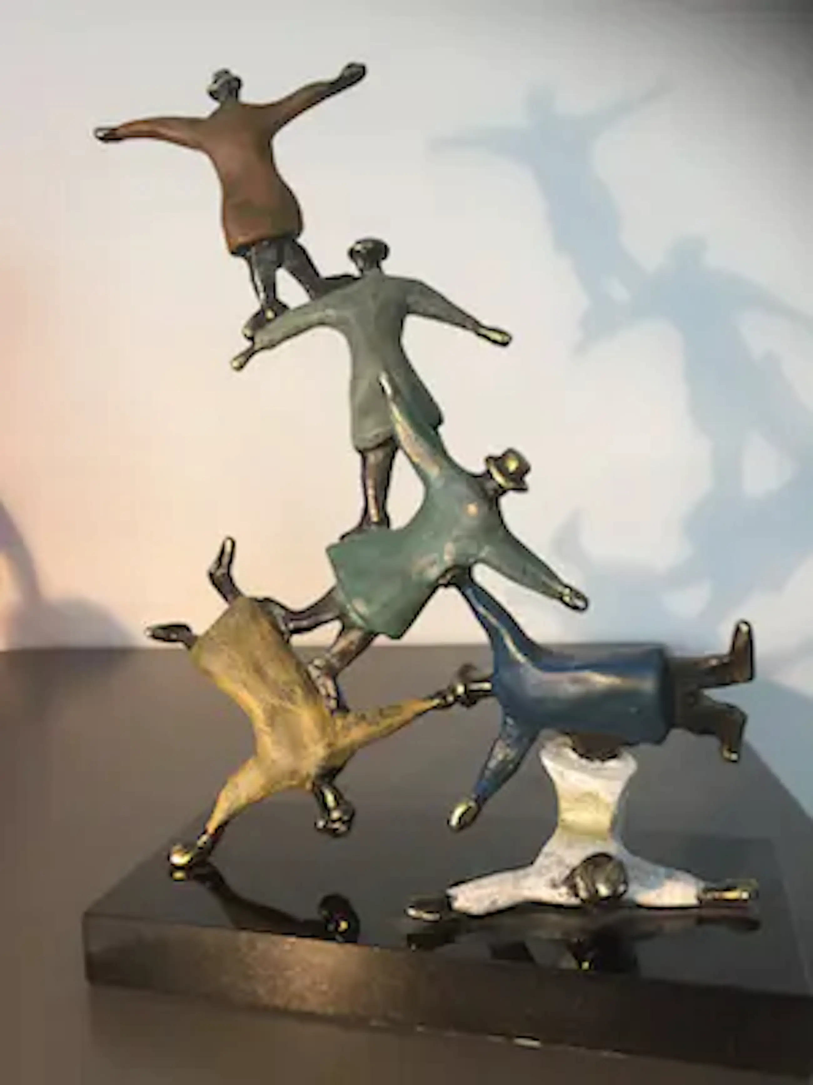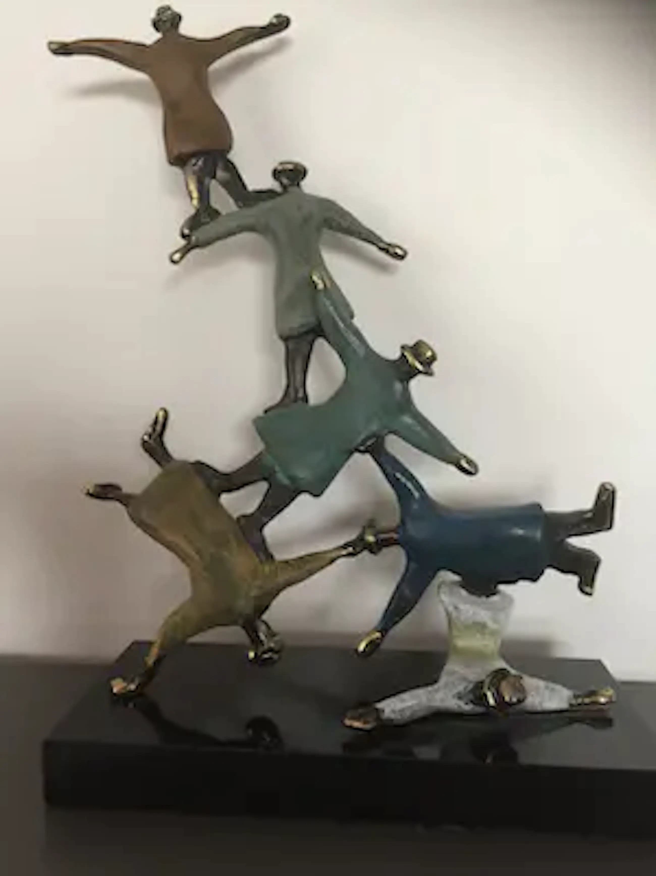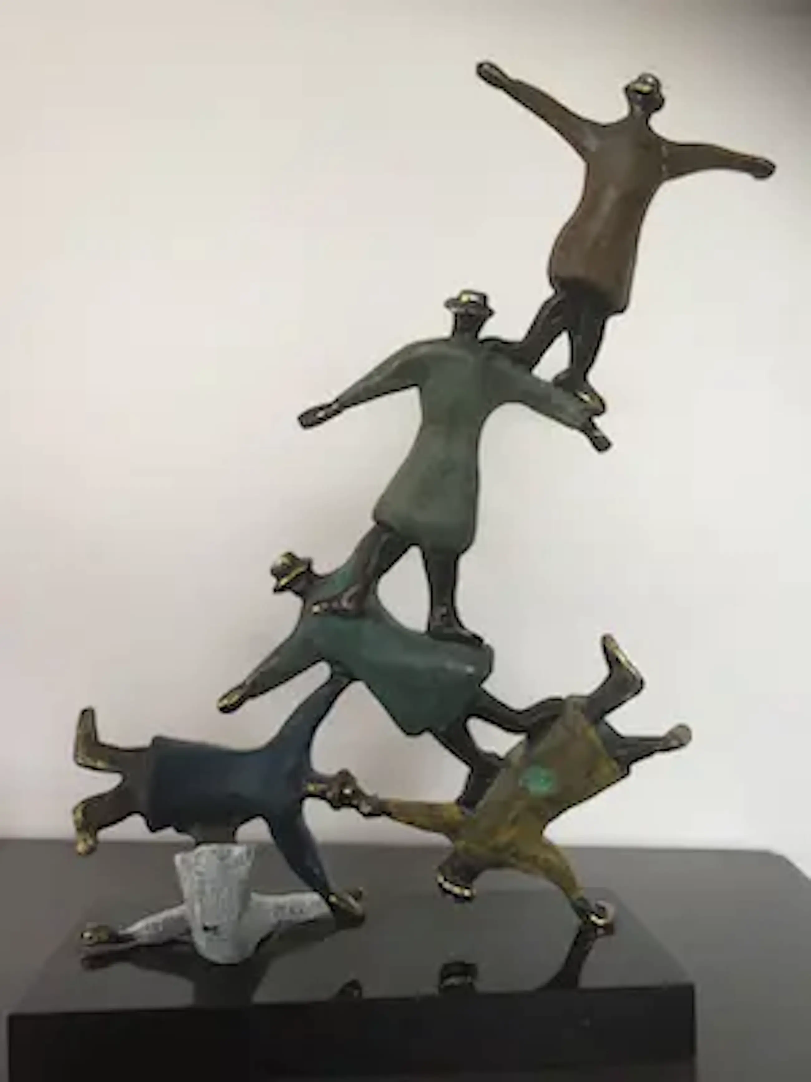 Mannen met bolhoeden lijkend op figuren van Magritte die dolkomisch een toren vormen. Prachtig kleurrijk sculptuur waarbij de kunstenaar heeft weergegeven dat als mensen elkaar ondersteunen en samenwerken werkelijk niets onmogelijk is!