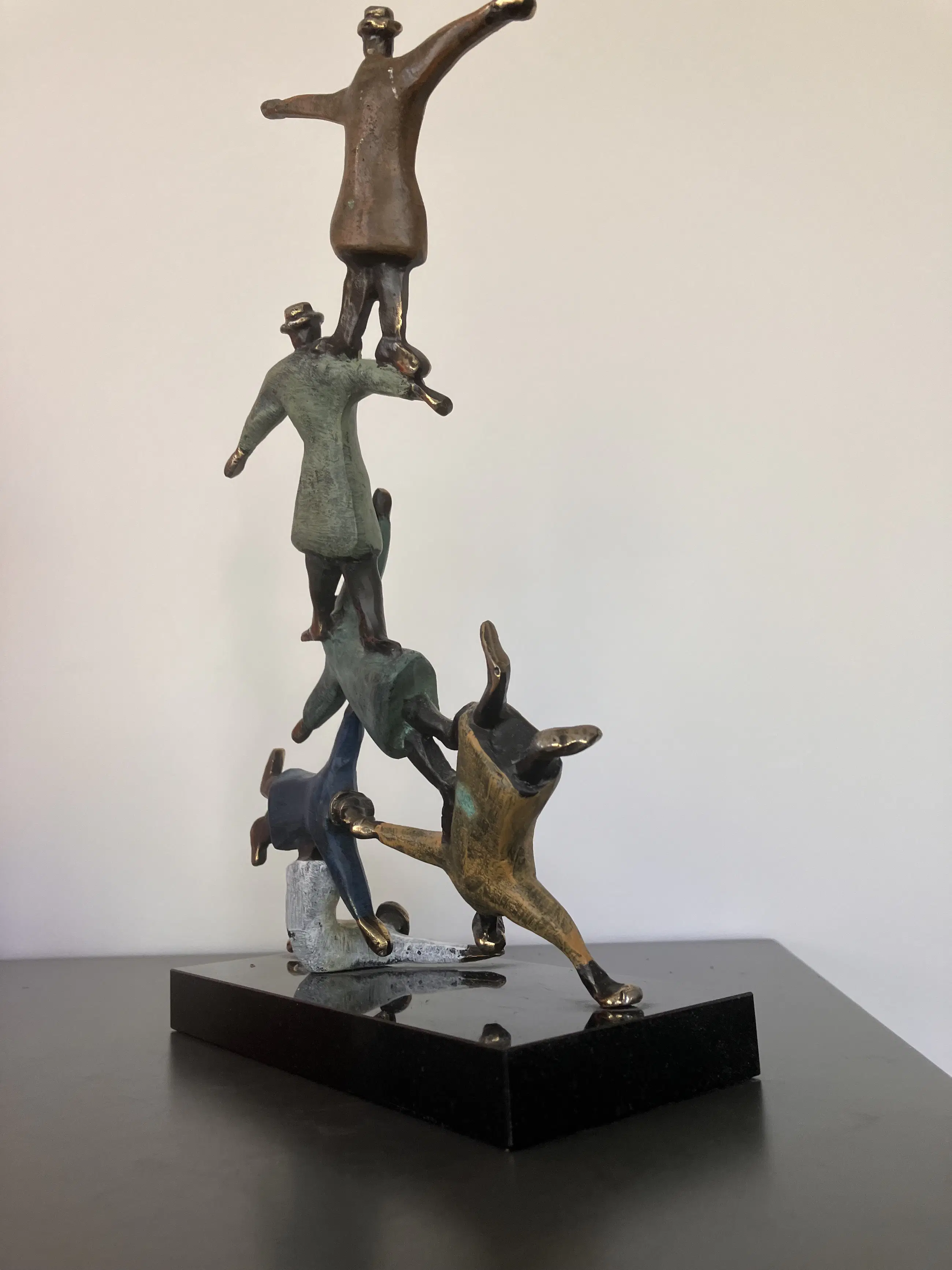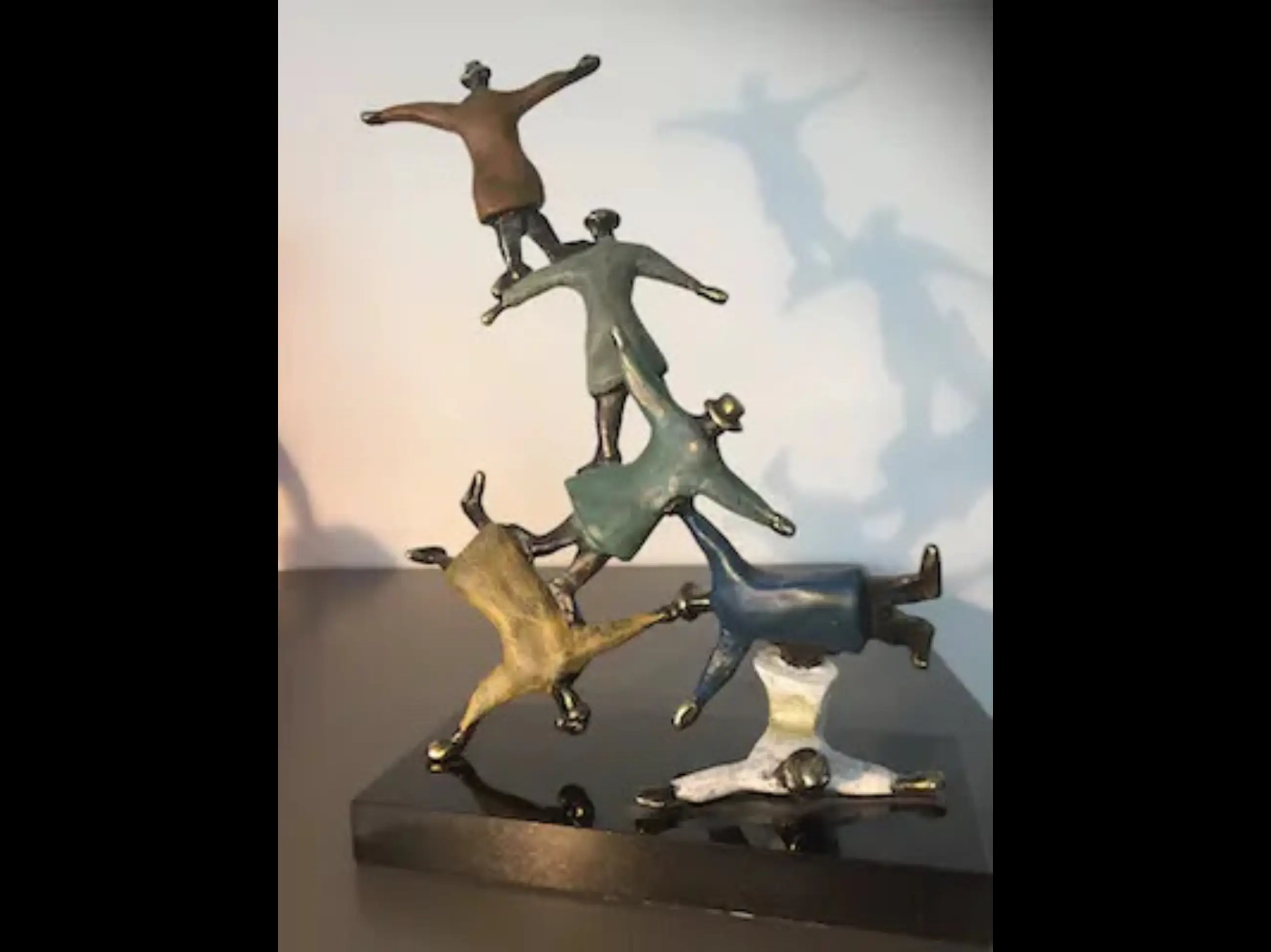 Mannen met bolhoeden lijkend op figuren van Magritte die dolkomisch een toren vormen. Schitterend kleurrijke sculptuur waarbij de kunstenaar heeft weergegeven dat als mensen elkaar ondersteunen en samenwerken werkelijk niets onmogelijk is! Op zwart marmeren sokkel.