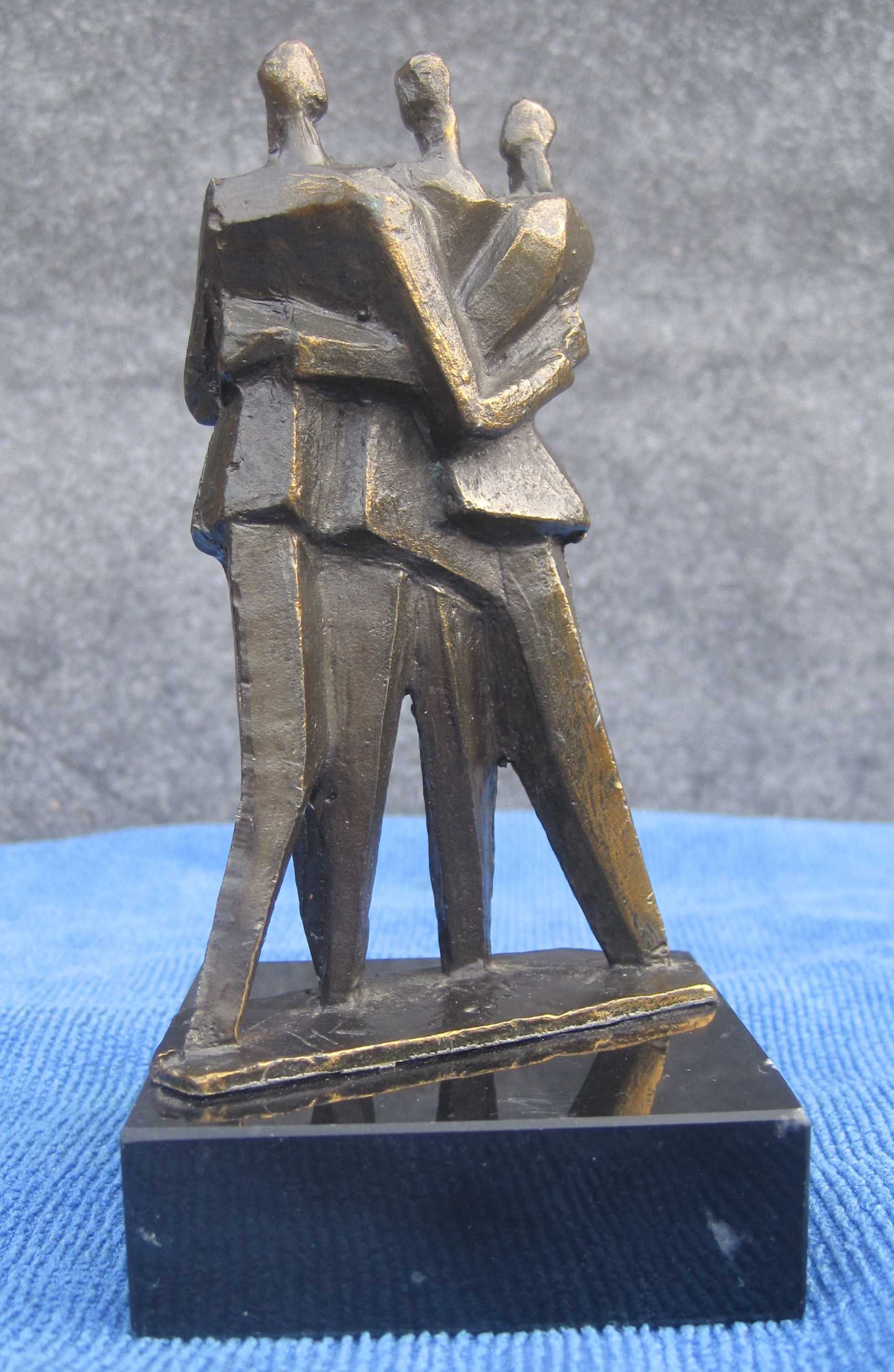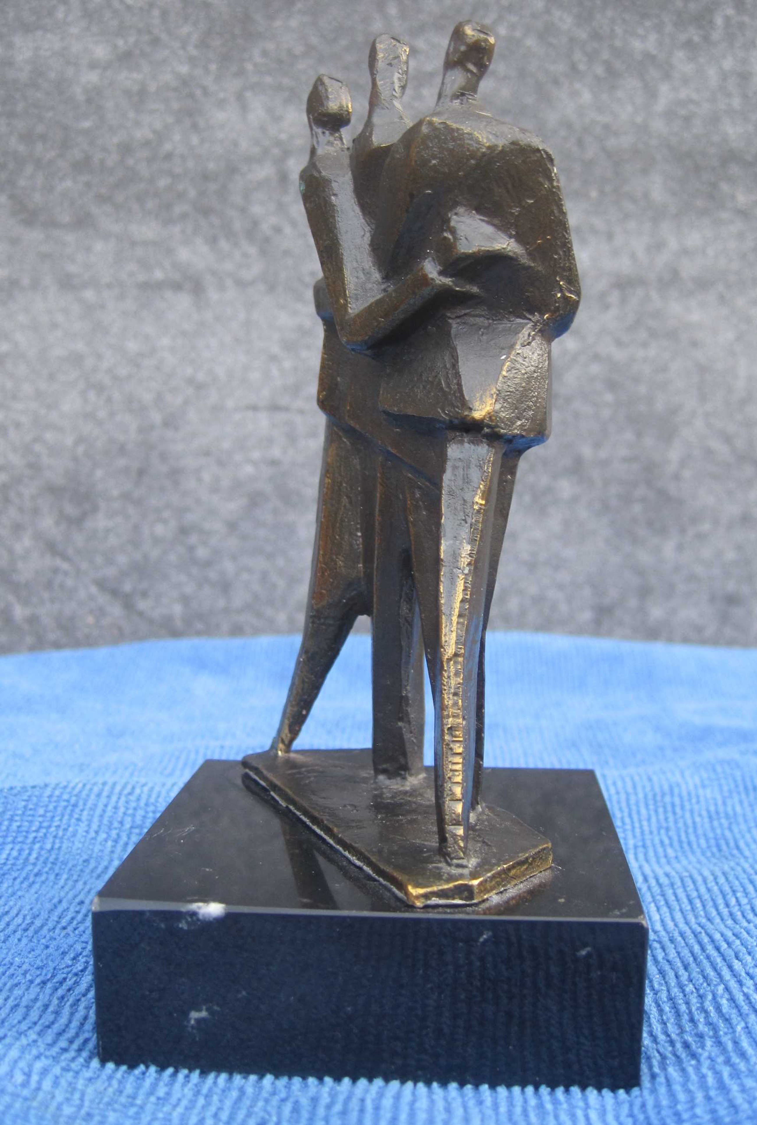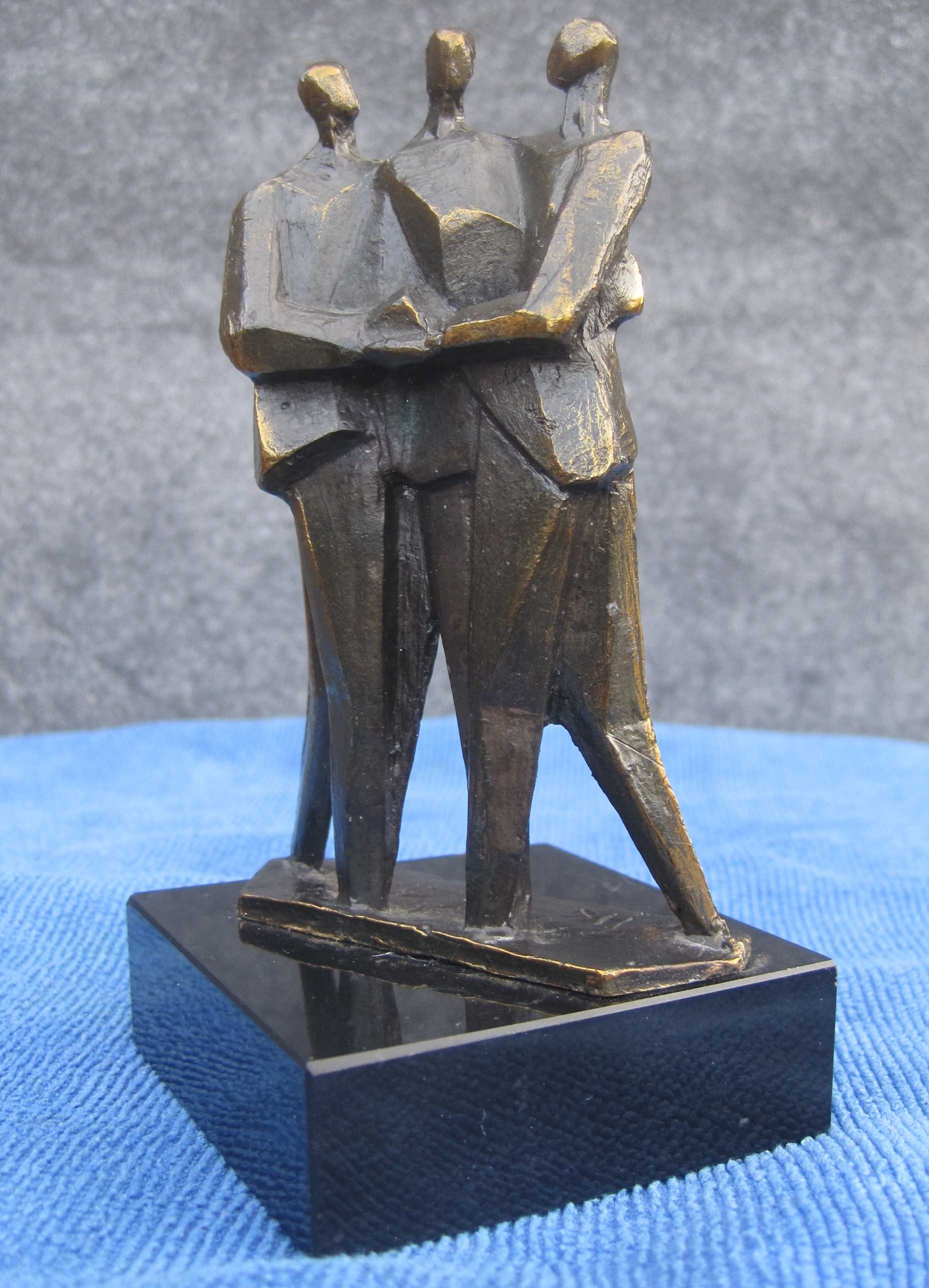 Zware verbronsde sculptuur op marmeren sokkel. Deze sculptuur is ontworpen, geboetseerd, gegoten en gepatineerd door kunstenaar : "Hans Kuypers" De titel is : "COMMUNICATIE" Motivatie kunstenaar : Een goed contact op ieder niveau.