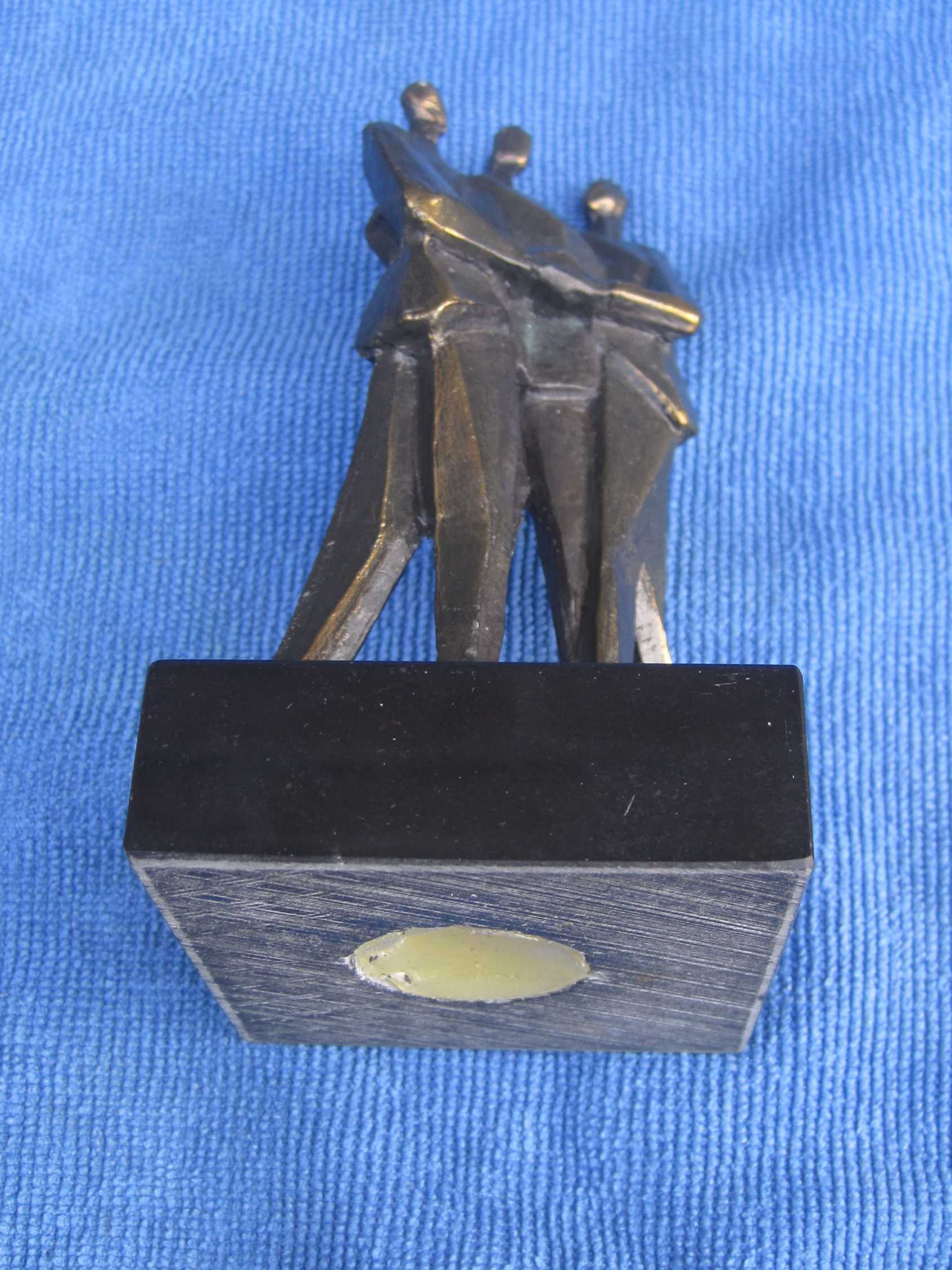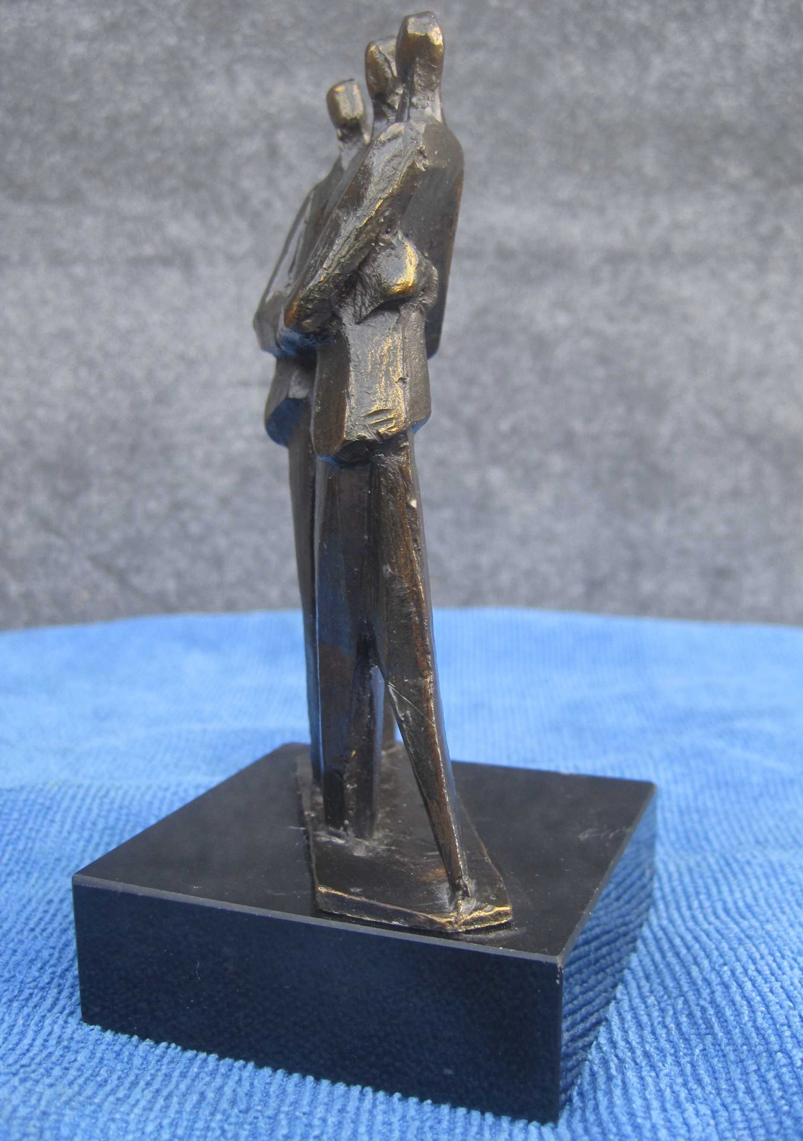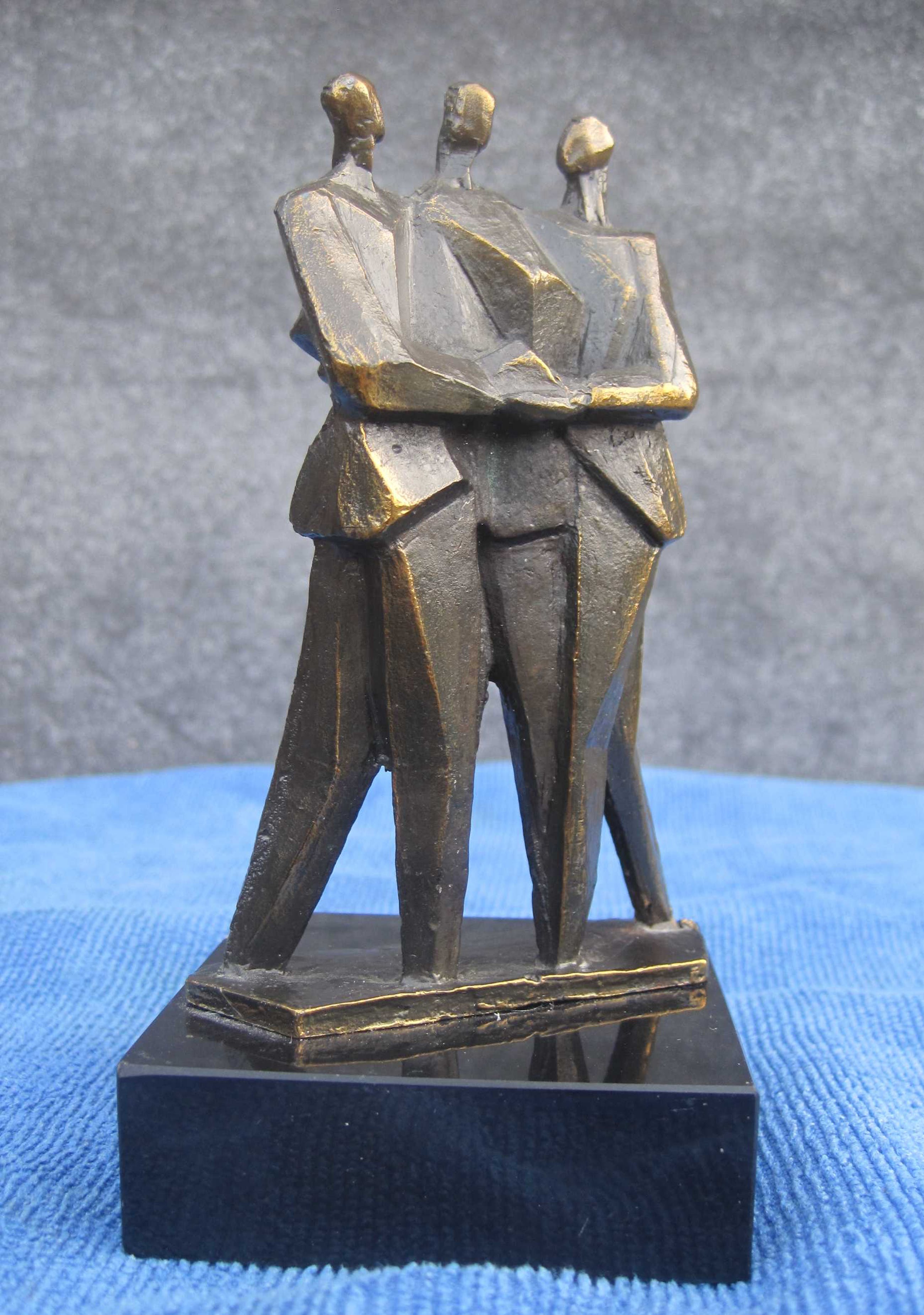 Zware verbronsde sculptuur op marmeren sokkel. Deze sculptuur is ontworpen, geboetseerd, gegoten en gepatineerd door kunstenaar : "Hans Kuypers" De titel is : "COMMUNICATIE" Motivatie kunstenaar : Een goed contact op ieder niveau.