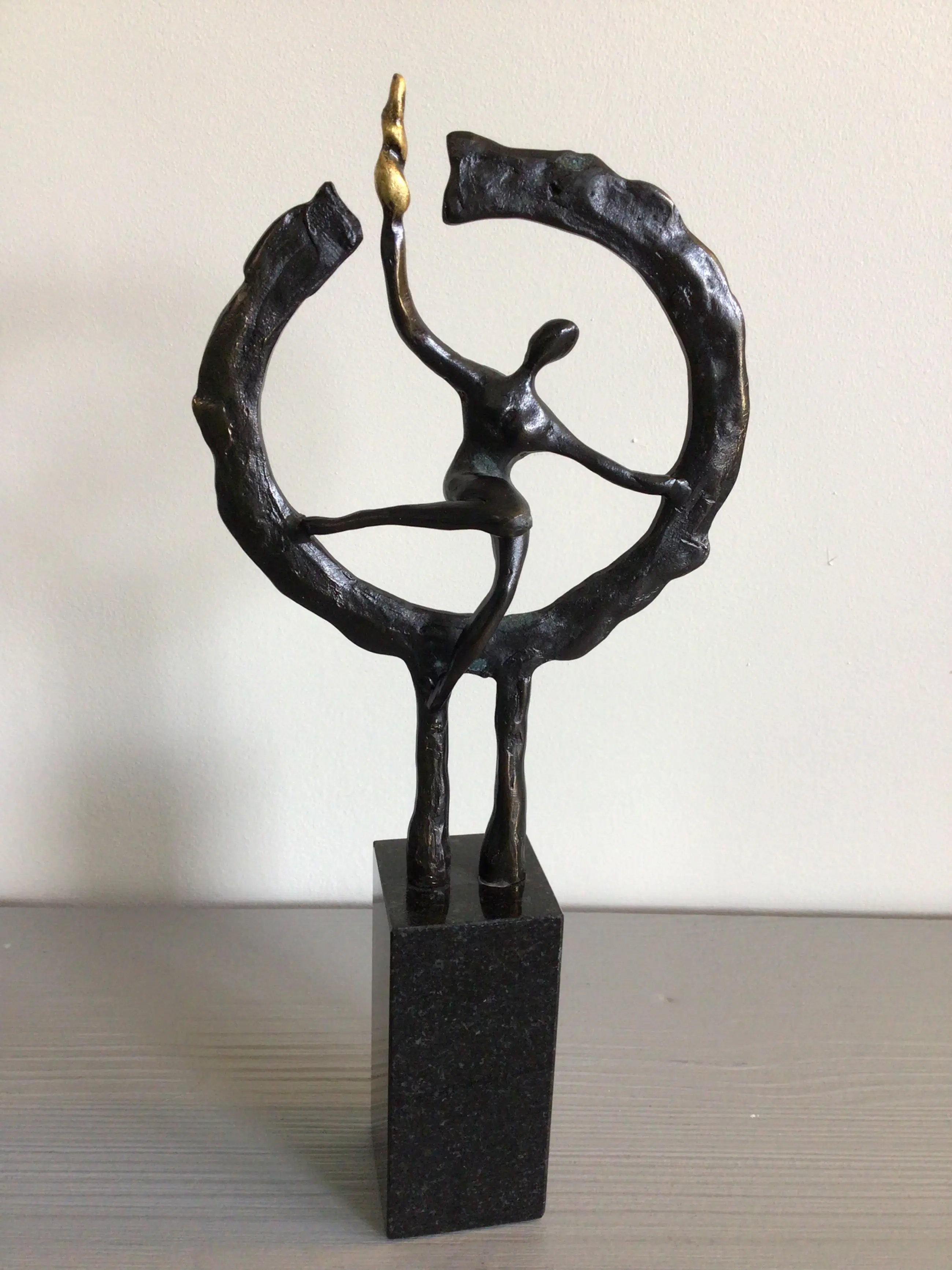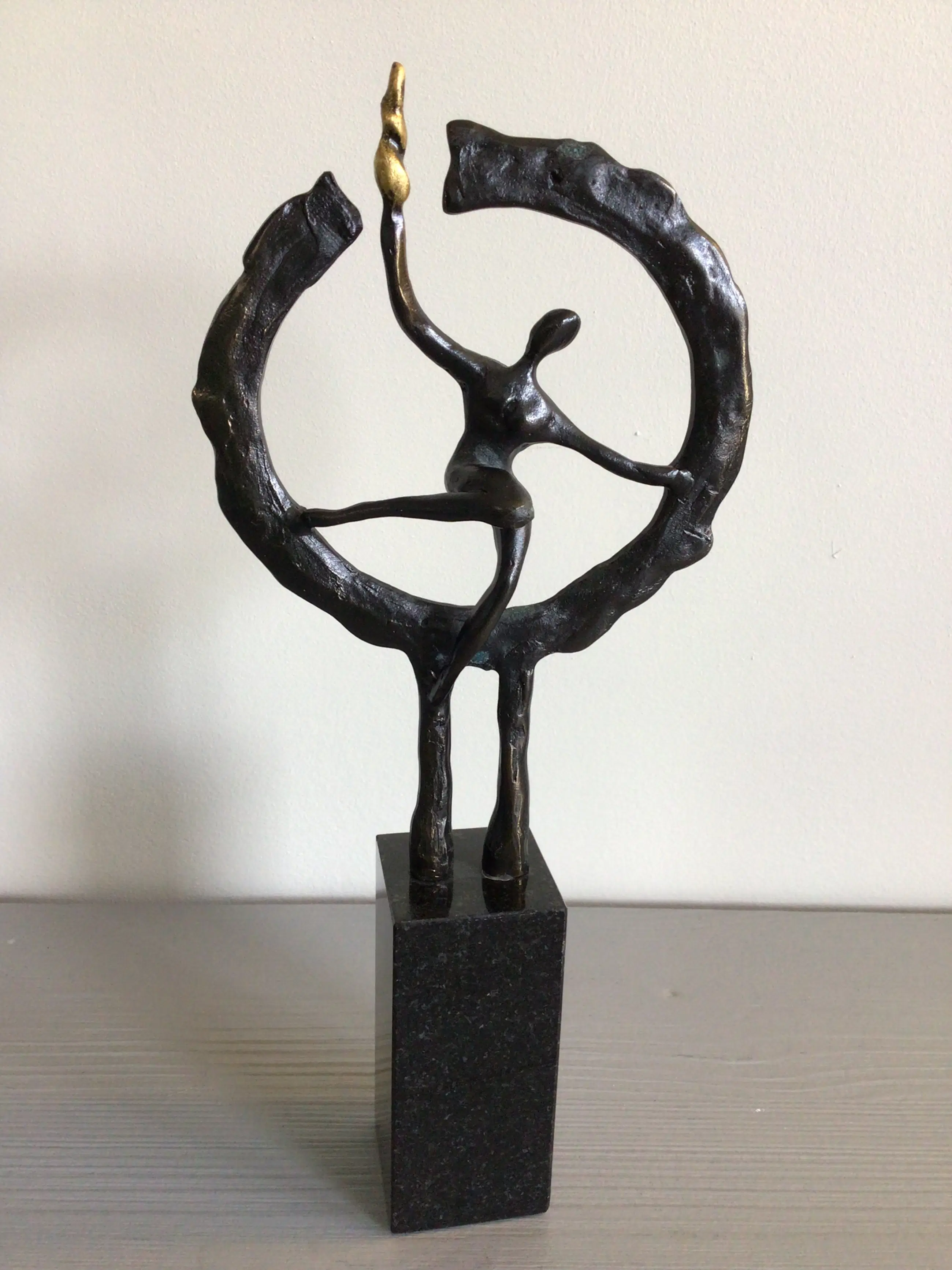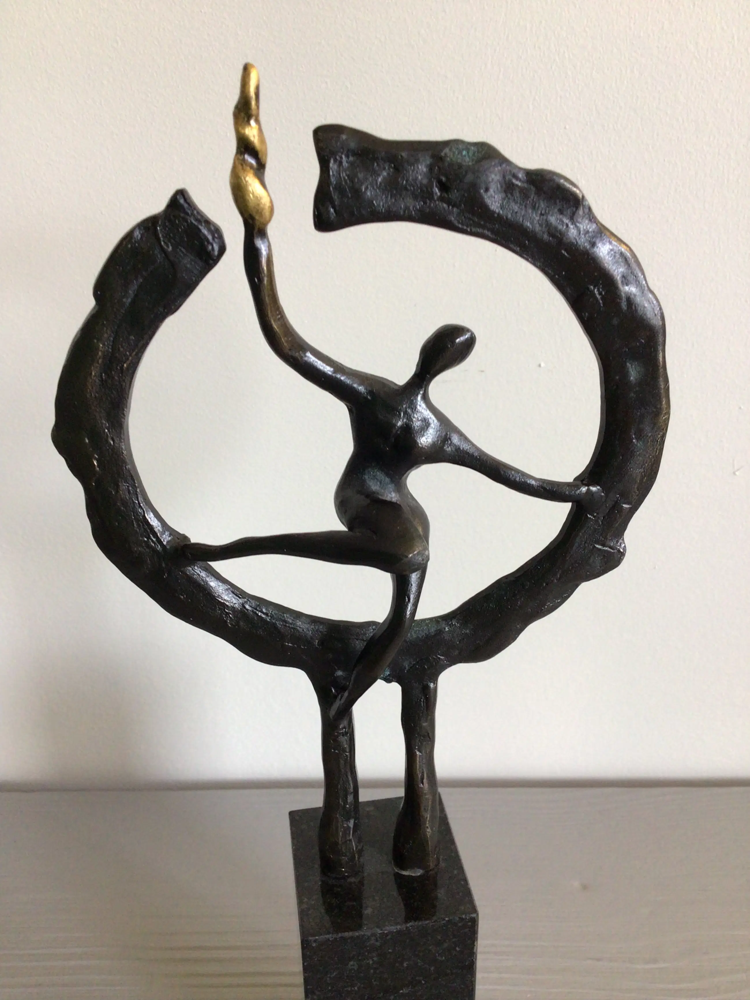 Zeer fraai vormgegeven sculptuur van een mensfiguur in een cirkel met in zijn rechterhand een brandende fakkel. Titel “ Op weg naar het nieuwe “ Kunstenaar: Hans Kuyper Hoogte : 24 cm Het beeld verkeert in zeer goede staat en wordt zorgvuldig verpakt verzonden.