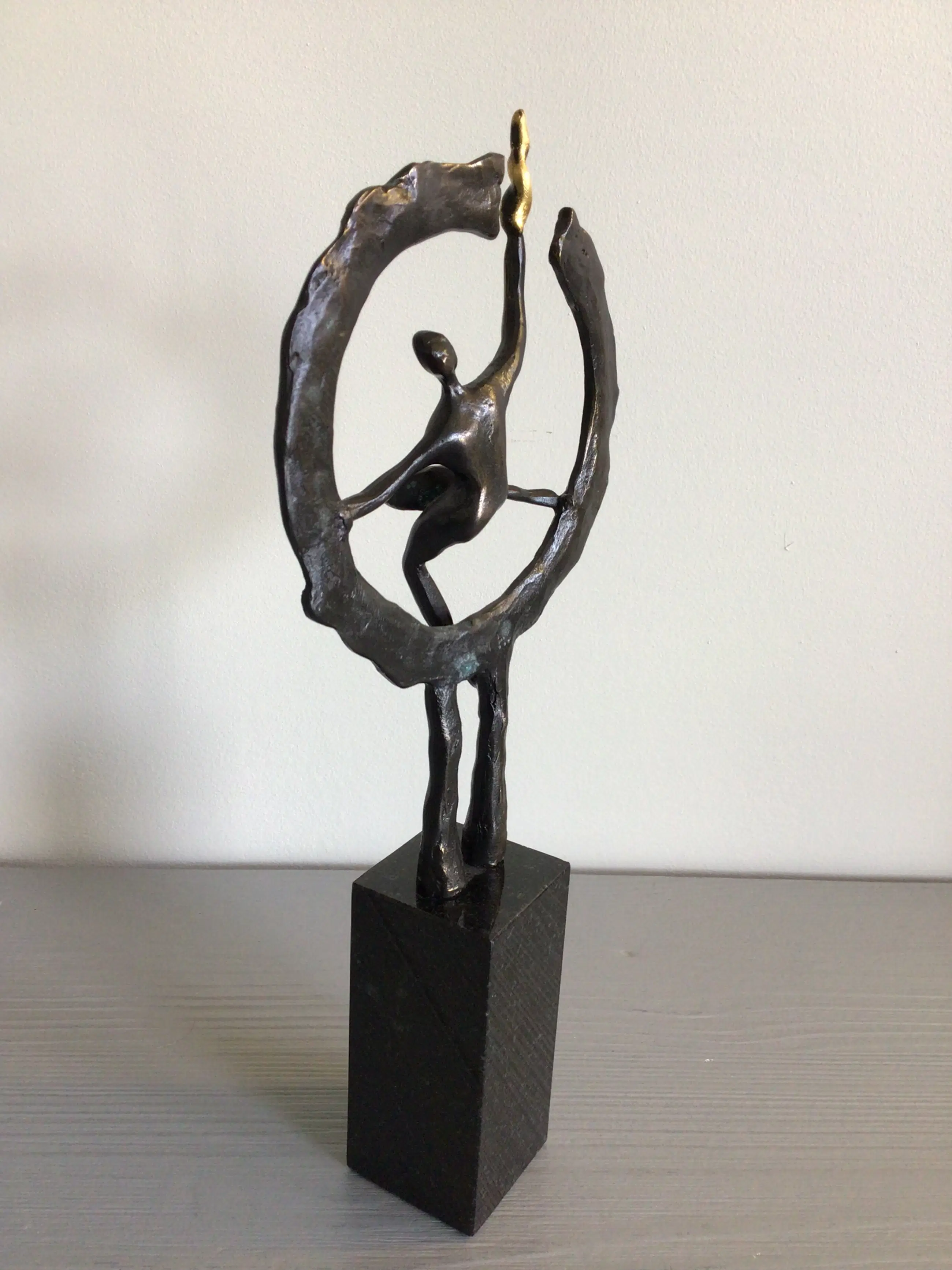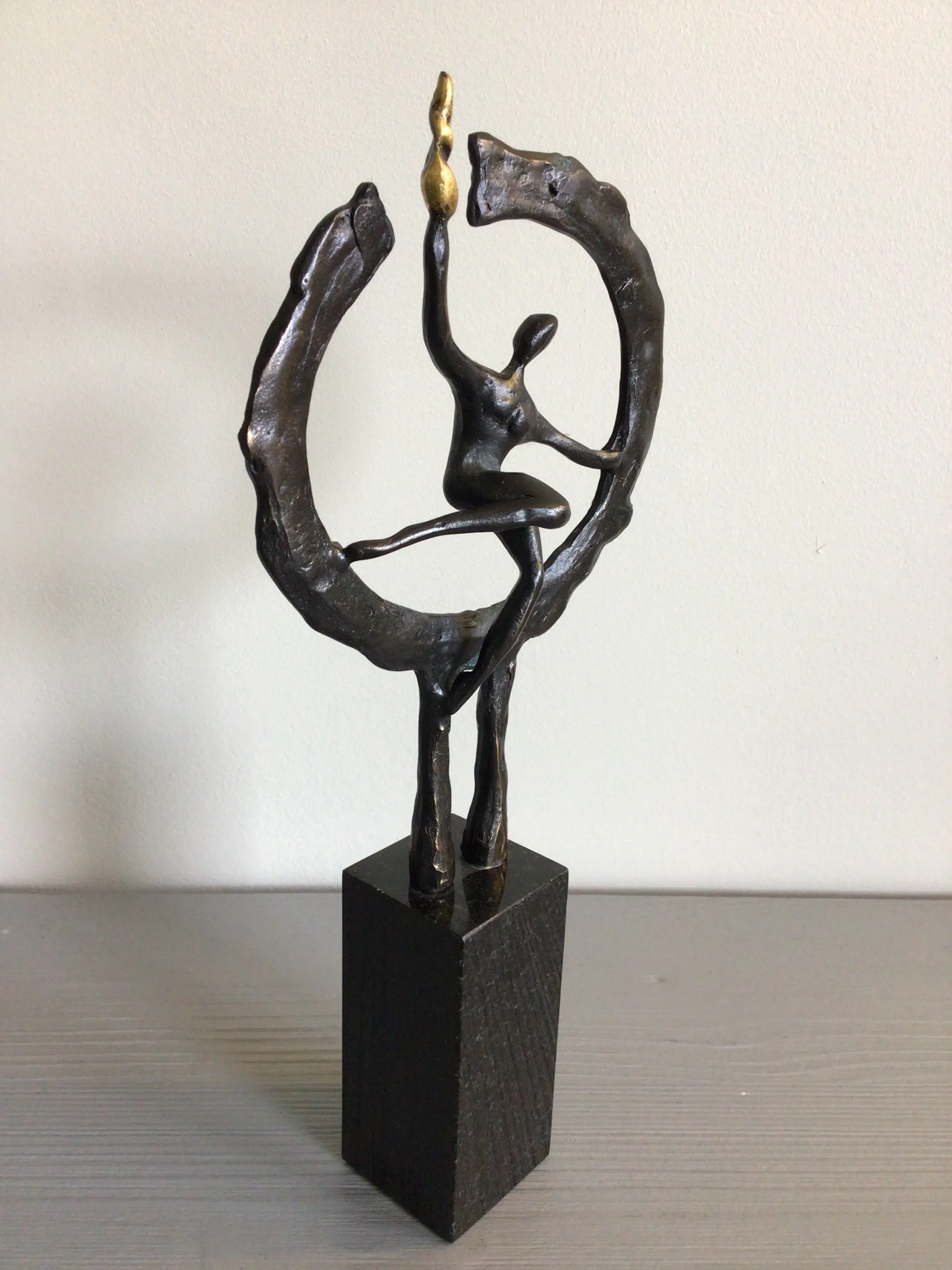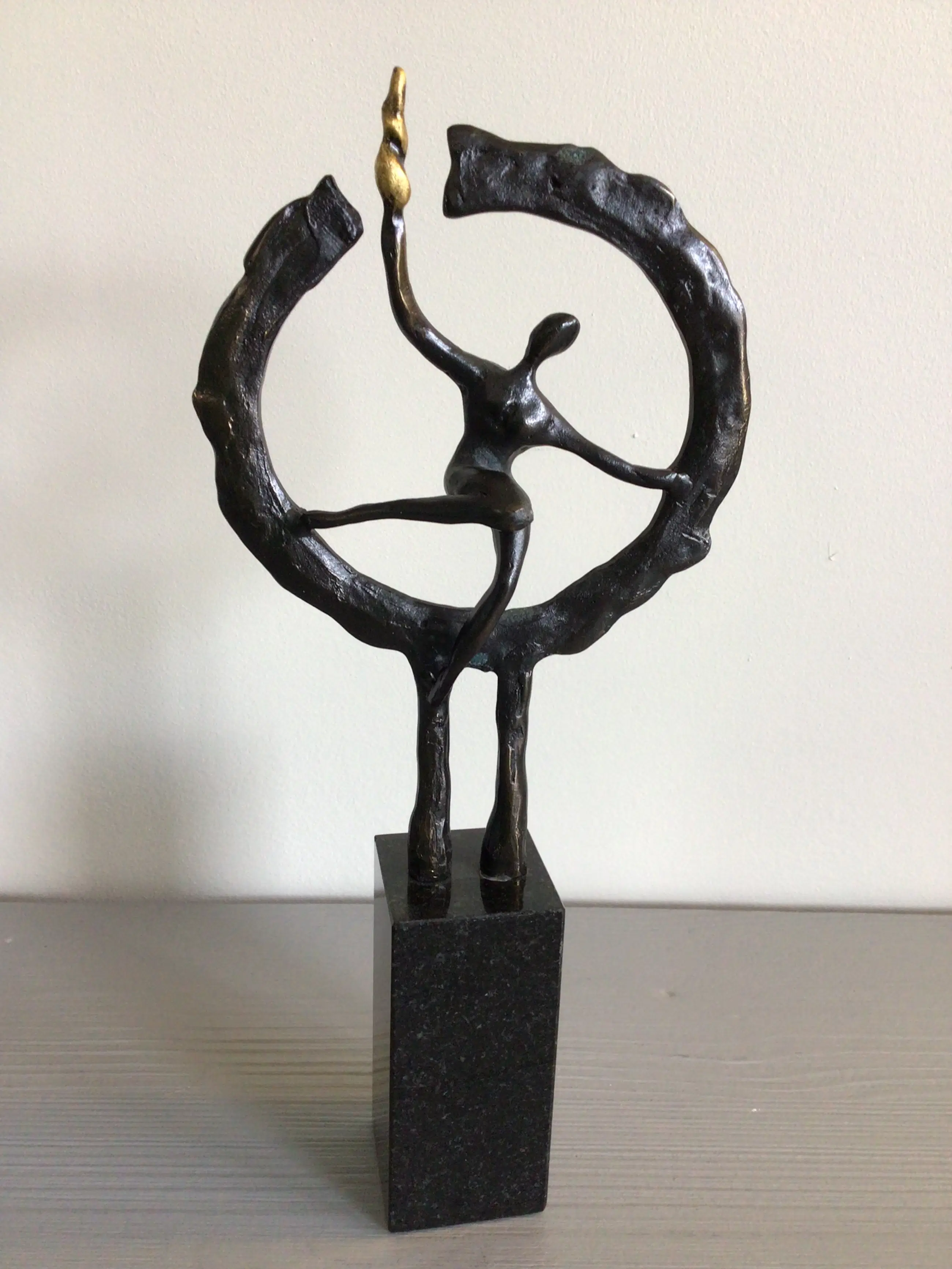 Zeer fraai vormgegeven sculptuur van een mensfiguur in een cirkel met in zijn rechterhand een brandende fakkel. Titel “ Op weg naar het nieuwe “ Kunstenaar: Hans Kuyper Hoogte : 24 cm Het beeld verkeert in zeer goede staat en wordt zorgvuldig verpakt verzonden.