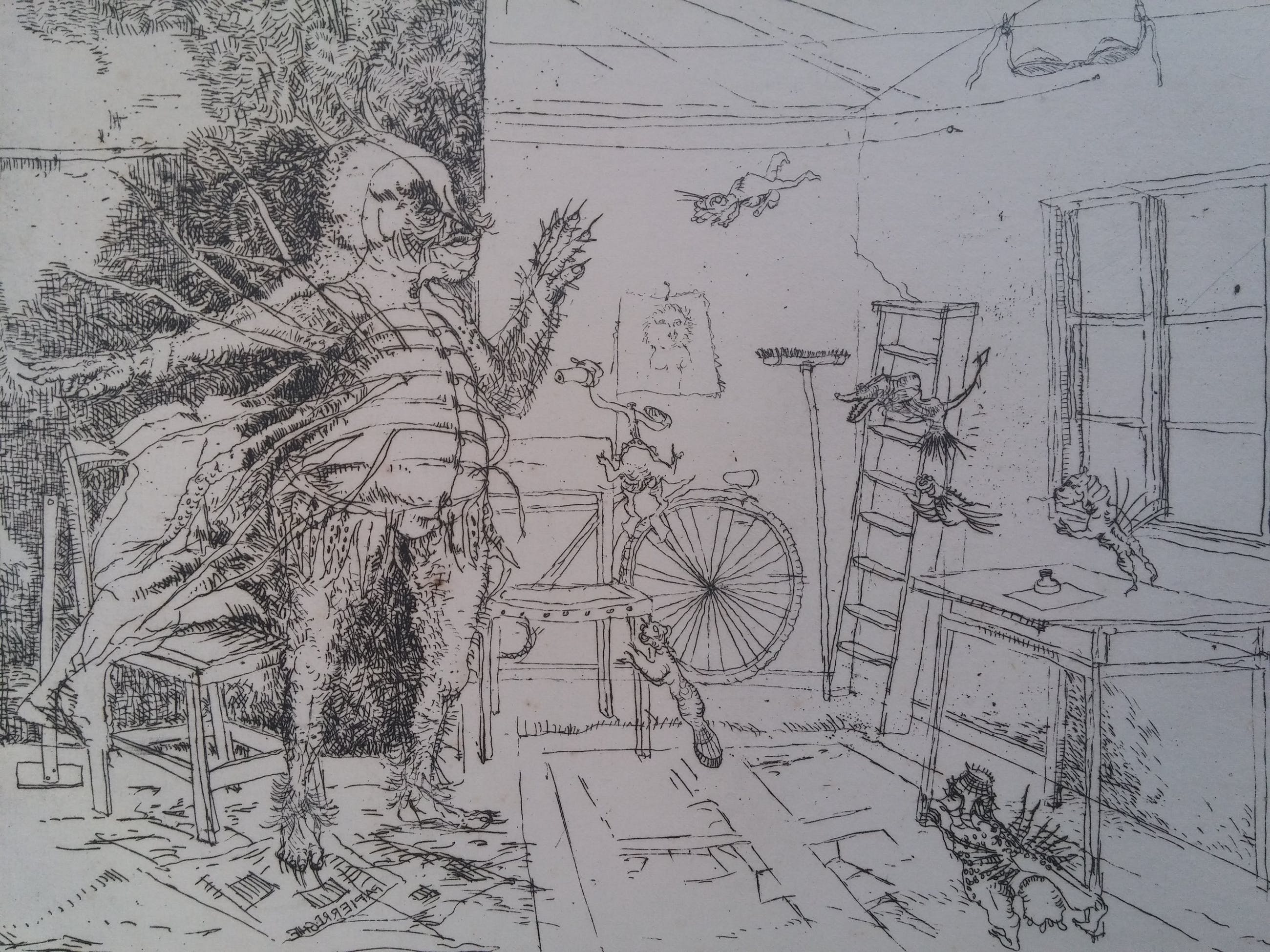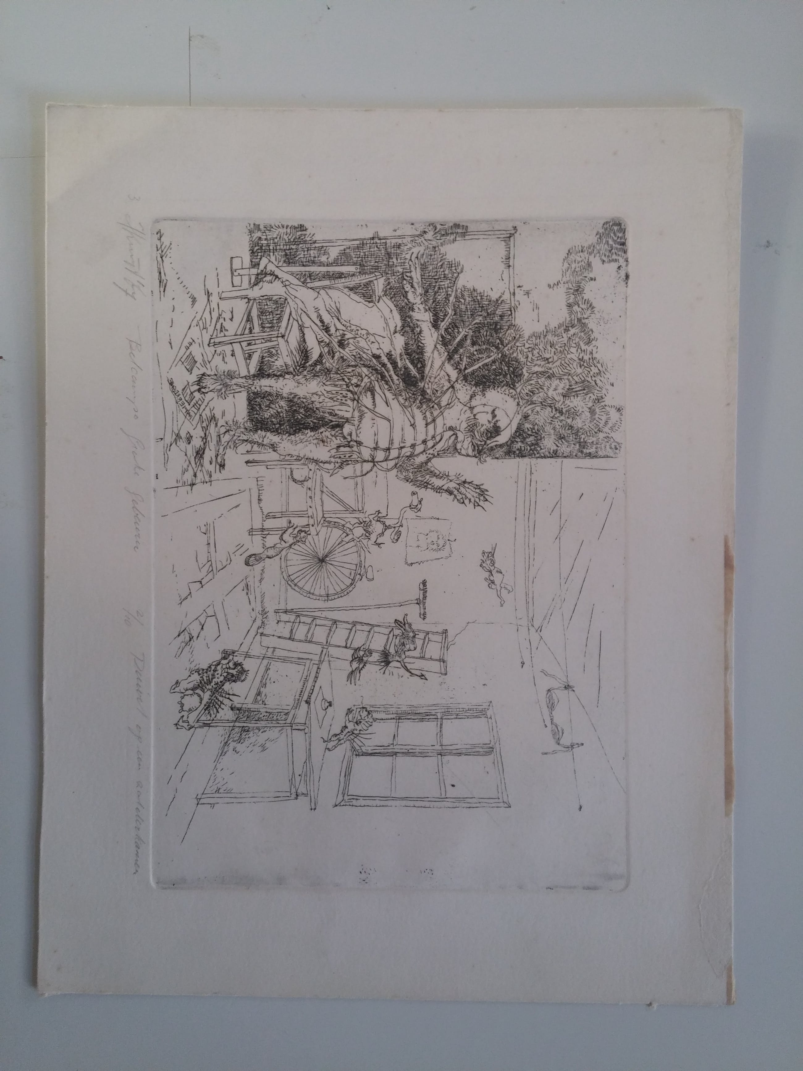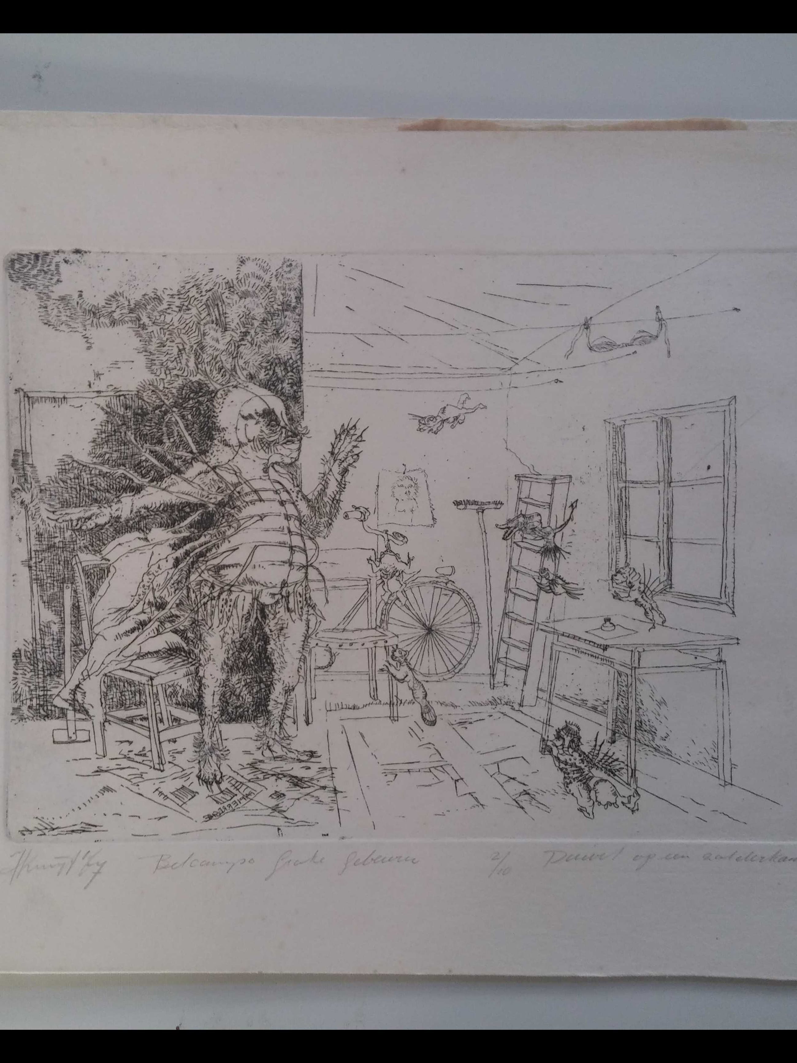 Belcampo Het grote gebeuren - Duivel op een zolderkamer 2/10 uit collectie van kunstenaar zelf. 23 en 24 februari is werk te zien tijdens een overzichtstentoonstelling bij Zaansgroen in Zaandam.