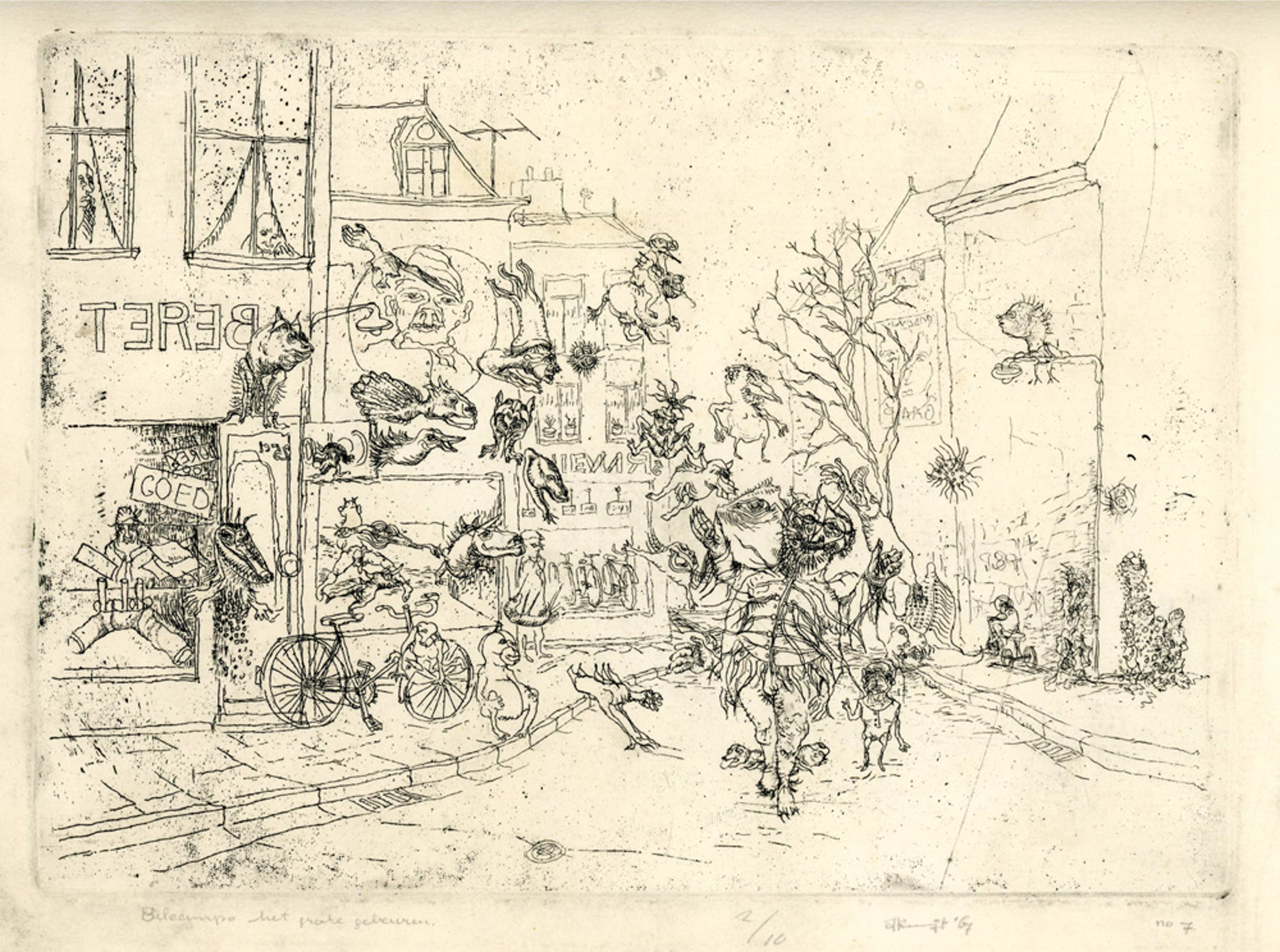 Maat is die van de etsplaat. Vel is 25(h) x 33 cm. Bij verzending wordt het werk verzekerd verzonden in een stevige koker. Afhalen verdient de voorkeur. Bekijken in de galerie in Zaandam alvorens een bod uit te brengen is mogelijk.