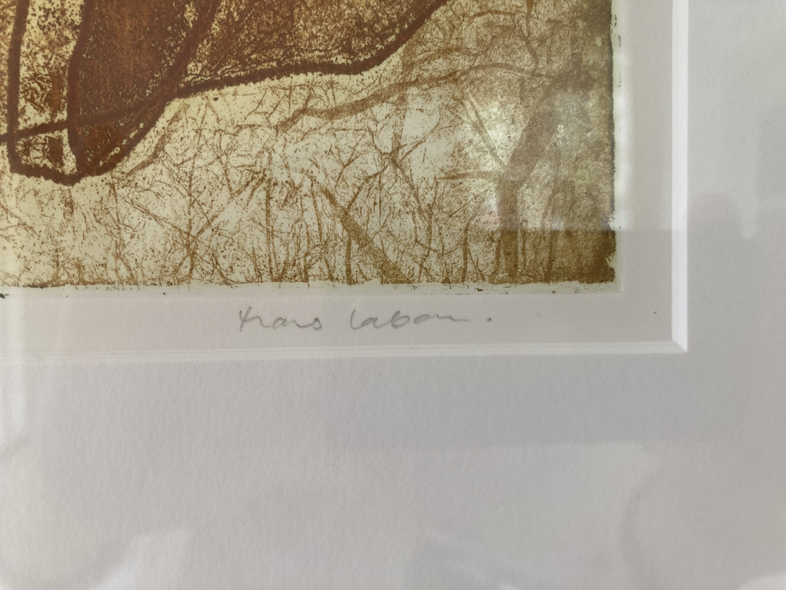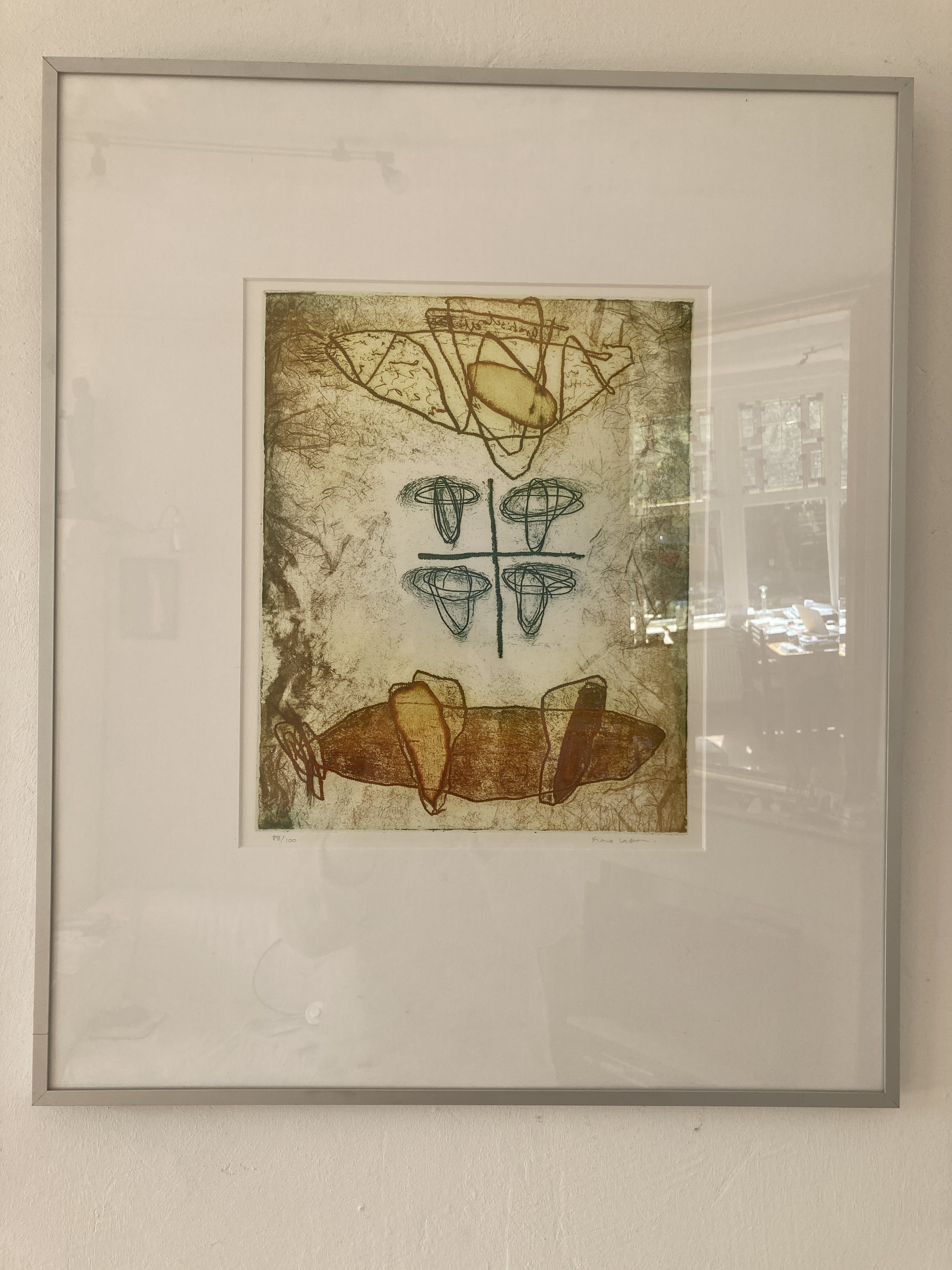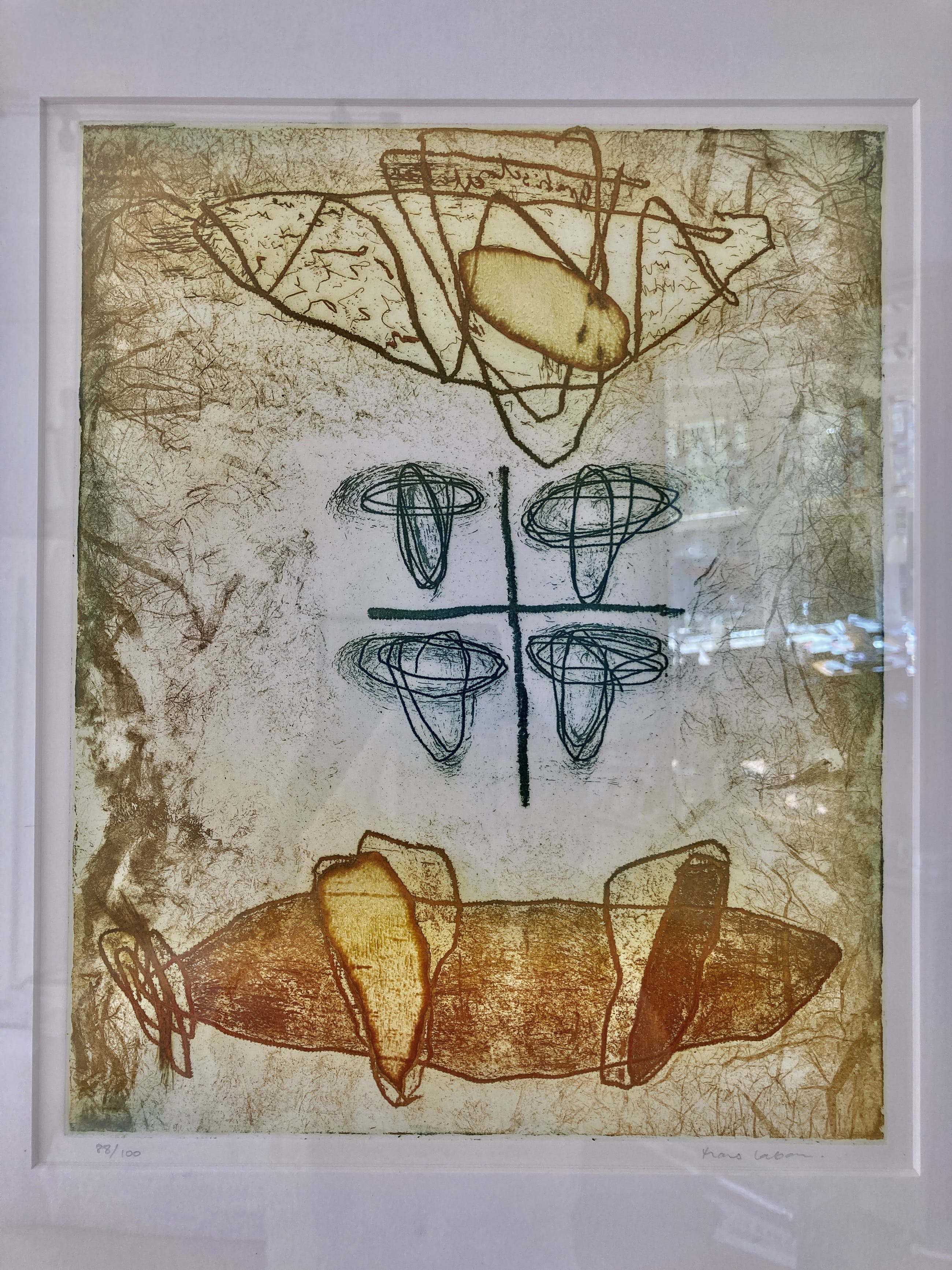 Ingelijste abstracte kleurenets van Hans Laban in de in gele, oranje en zeegroene tinten.