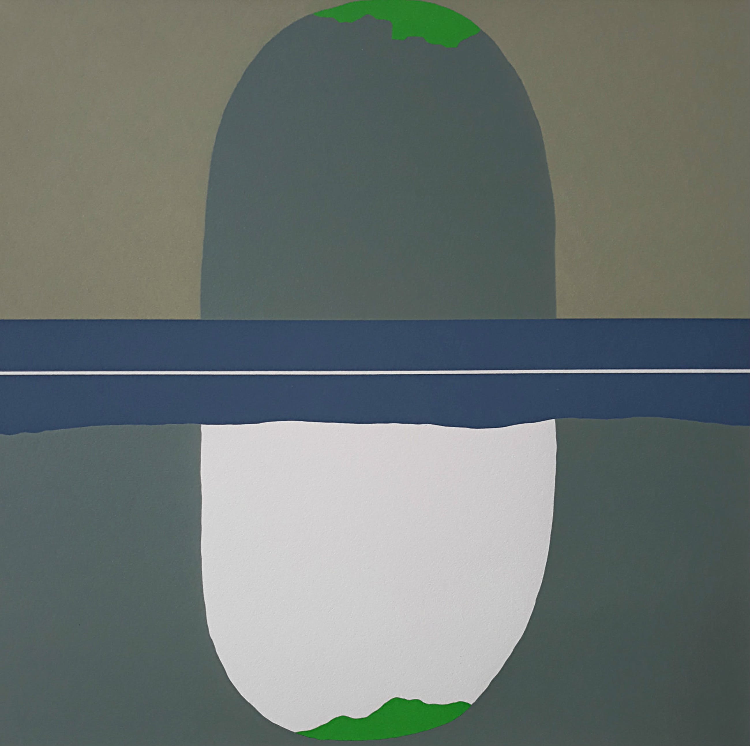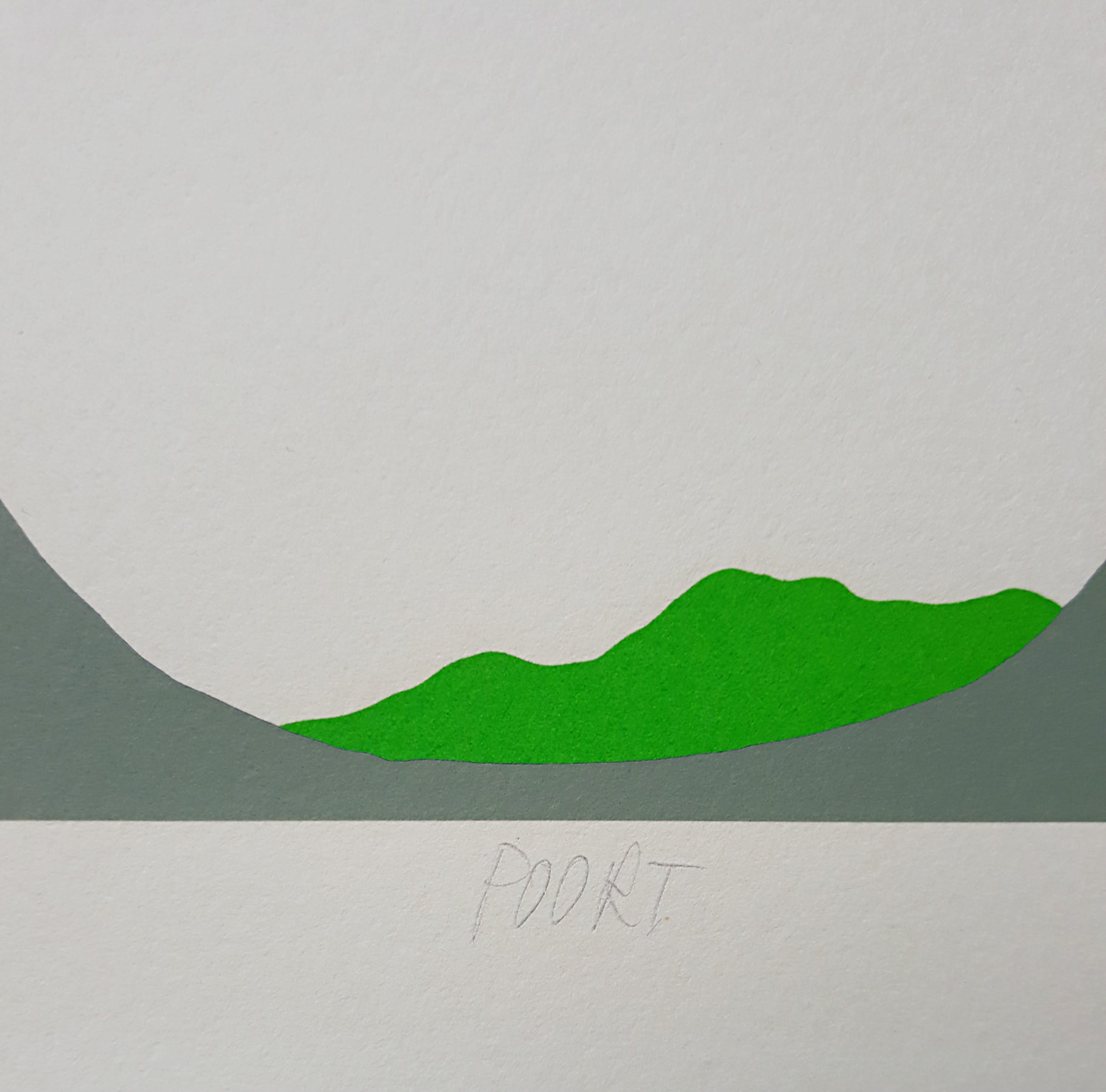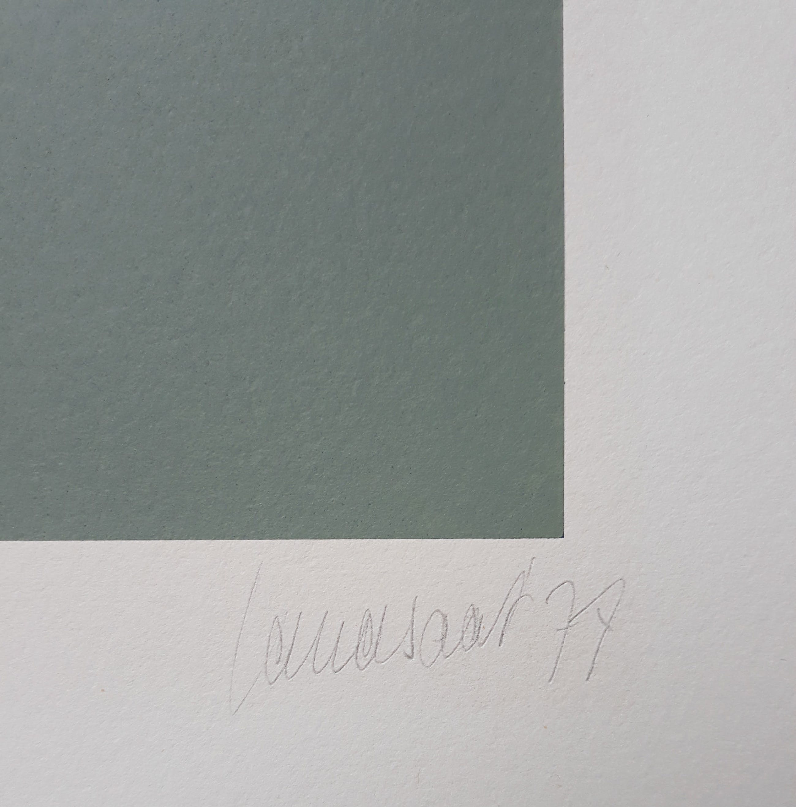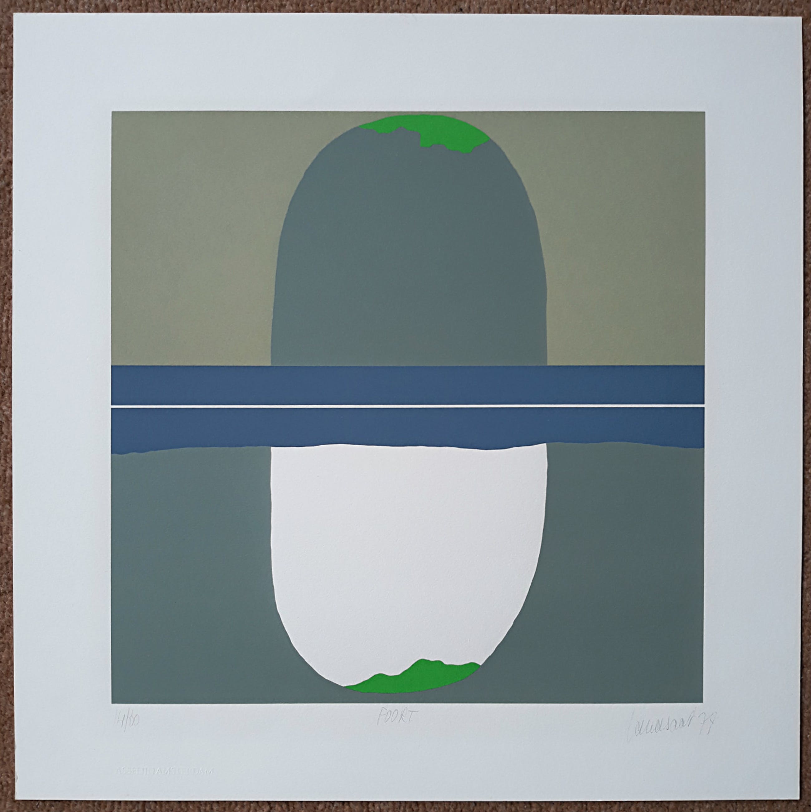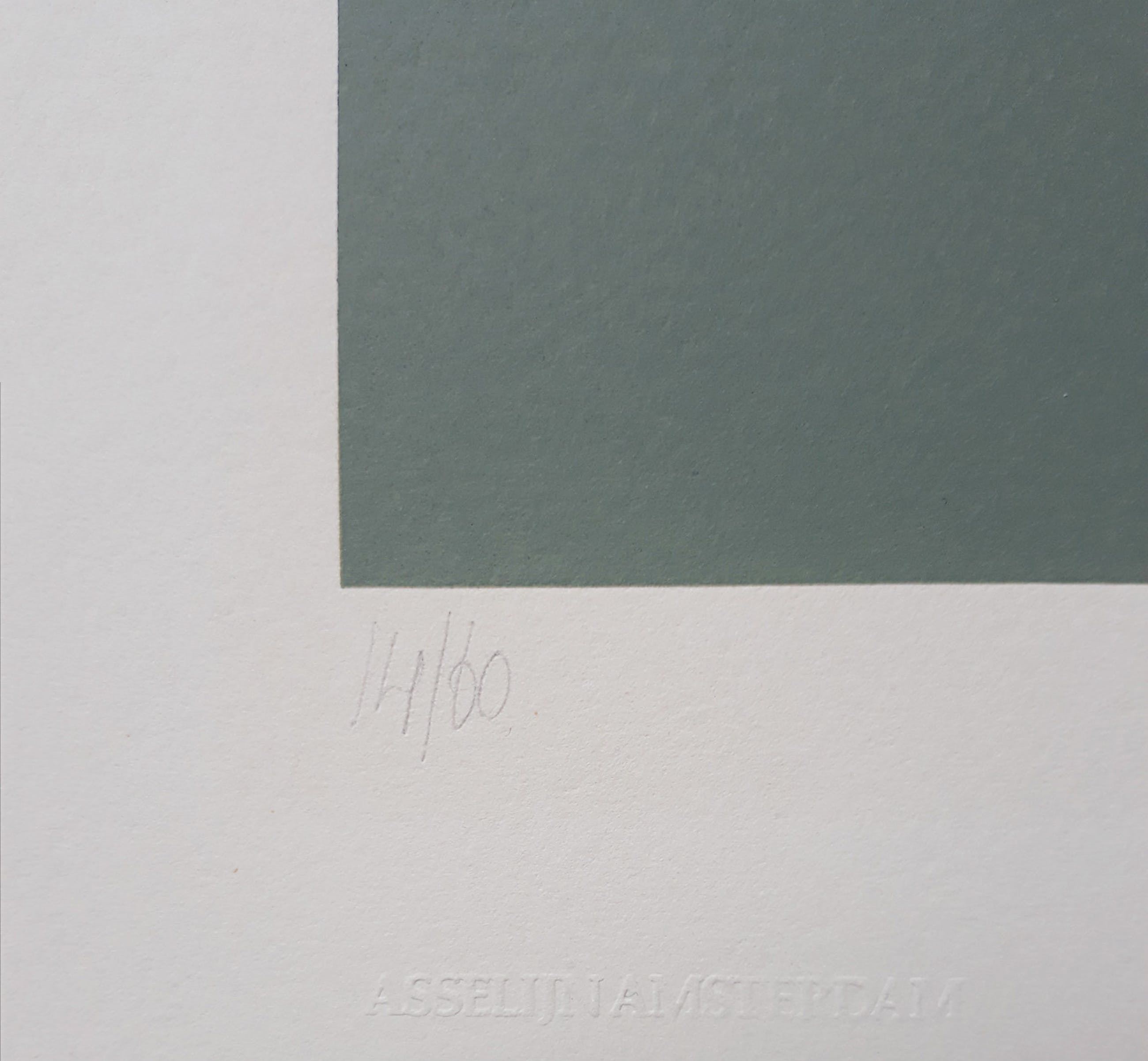Mooie compositie van Hans Landsaat uit de serie “Eilanden” (1977). Zeefdruk op papier, met potlood gesigneerd, gedateerd en genummerd (14/60) en met blindstempel “Asselijn Amsterdam”. Afkomstig uit de kunstcollectie van ABNAMRO, in uitstekende conditie. Deze zeefdruk is ook opgenomen in de collectie van het Rijksmuseum en zelfs te vinden op de website van de Tate Gallery in Engeland.