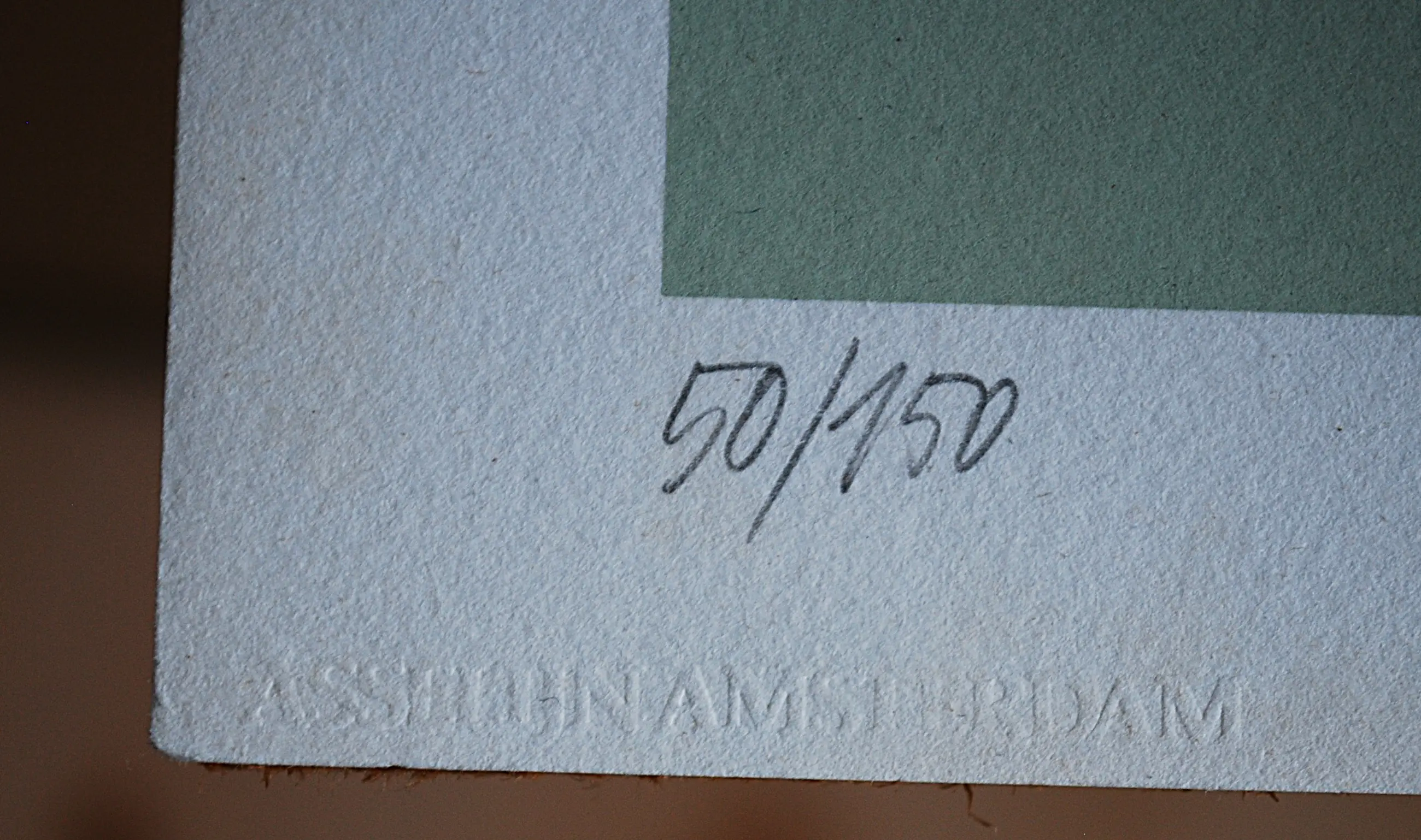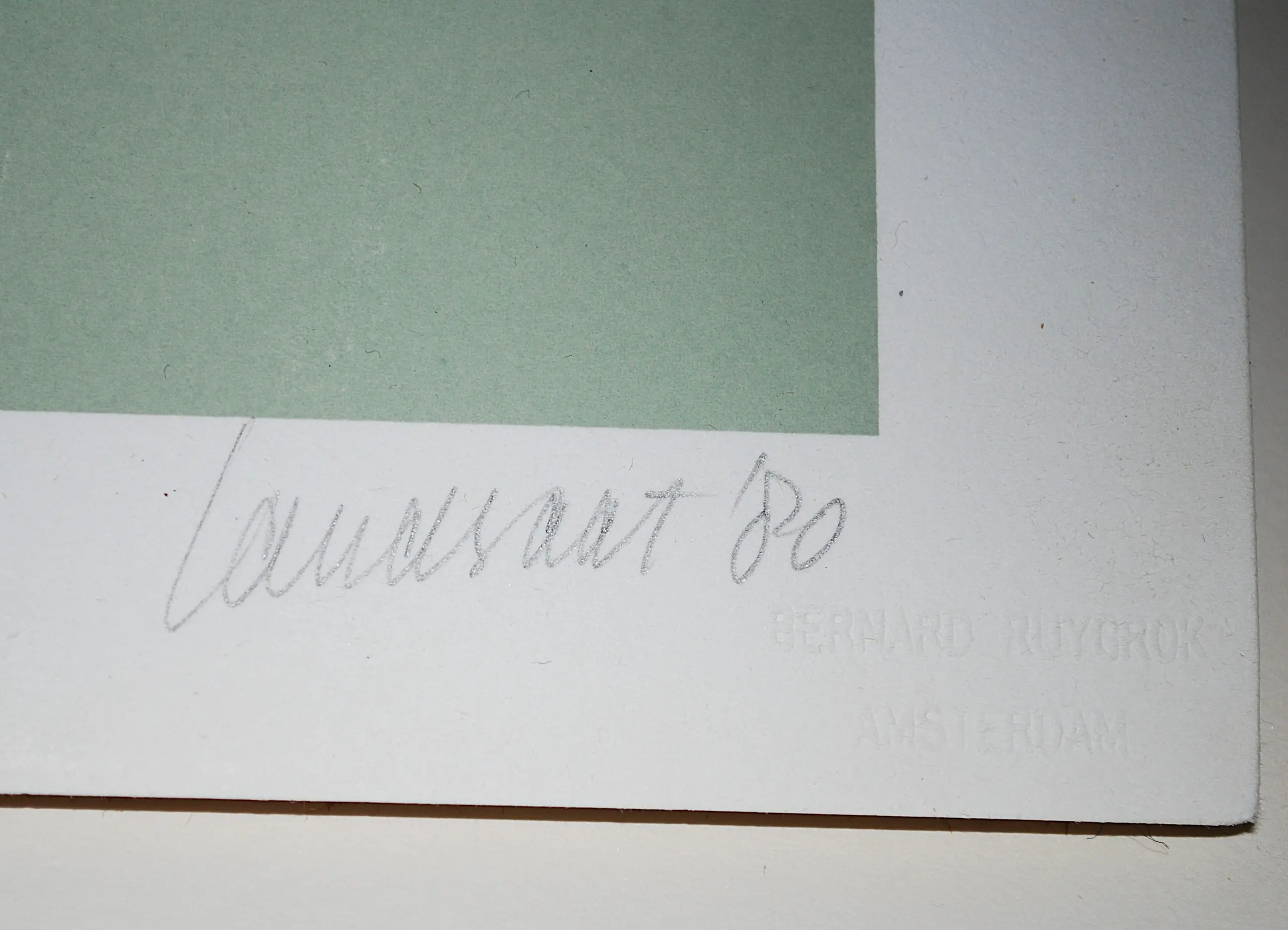 Het blad is los geplaatst achter glas, in een alu lijst. R,o. een preegdruk van de zeefdrukker Bernard Ruijgrok en l.o. van Galerie Asselijn in Amsterdam. Met potlood gesigneerd en genummerd.