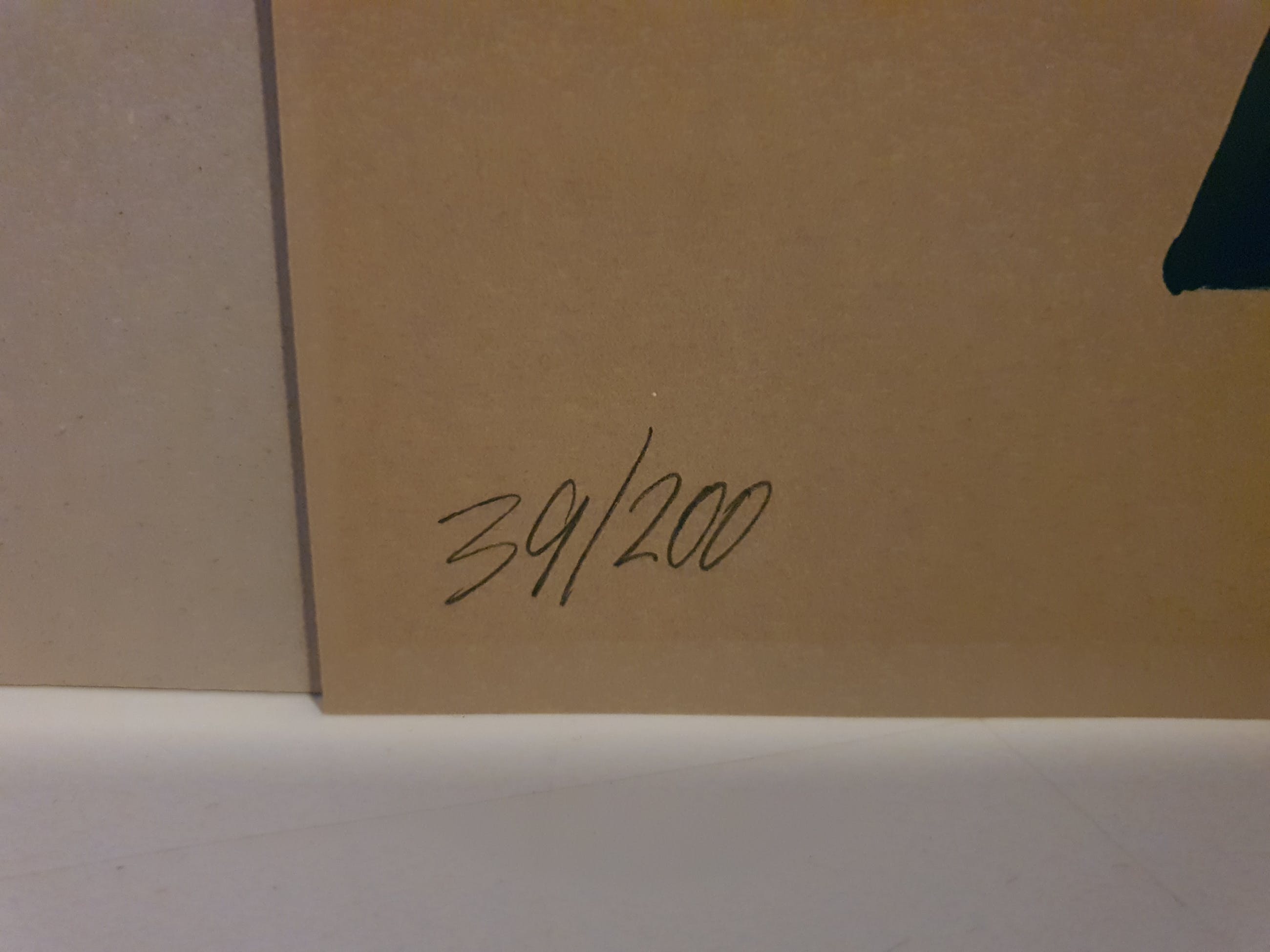 Jaartal: 1989 Afmetingen blad: 65 cm x 50 cm Oplage: 200 (oplage nummer kan afwijken van de fotos) Gesigneerd: Ja, handgeschreven met potlood Materiaal: Zeefdruk op papier Ingelijst: Nee Conditie: in goede staat