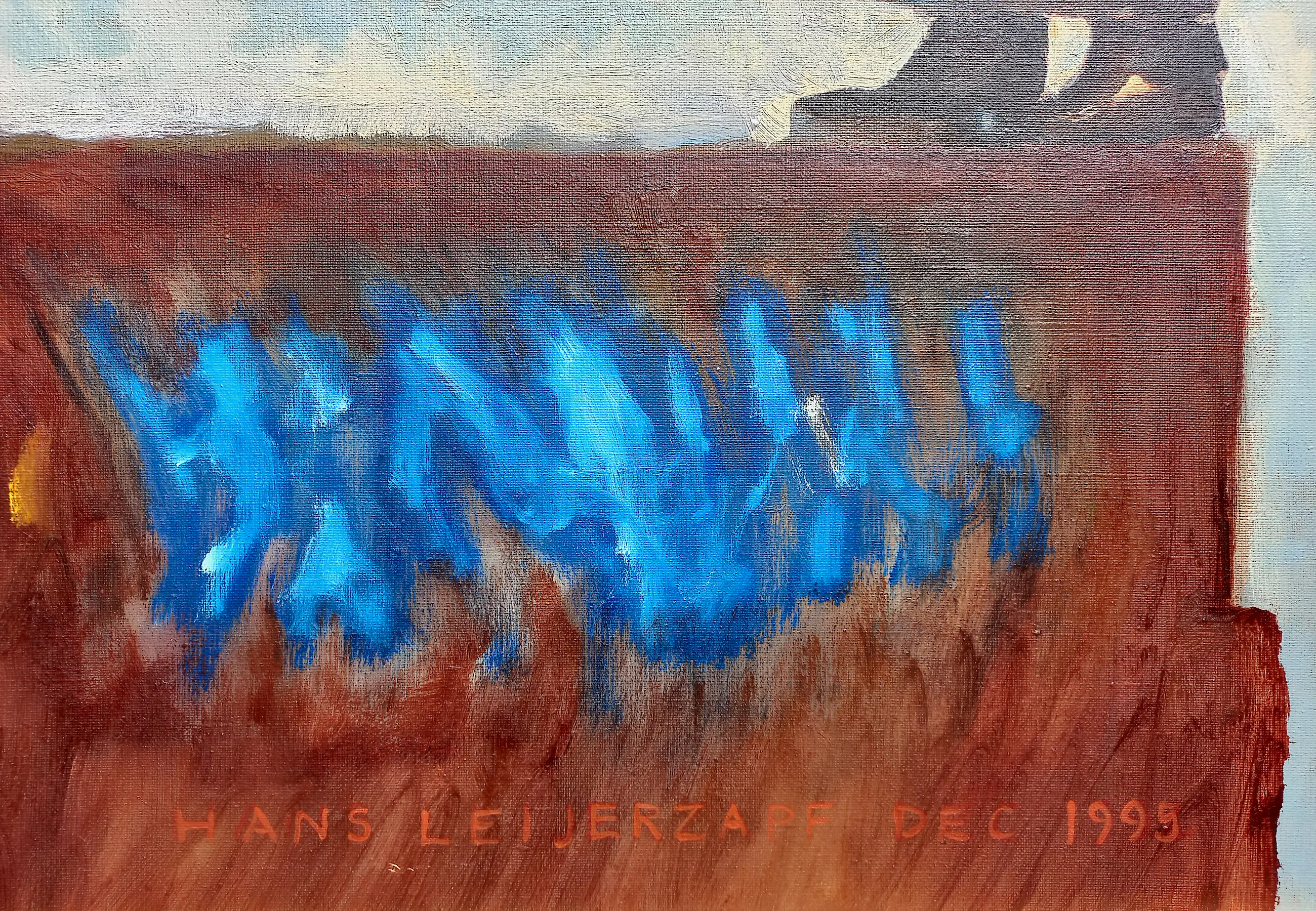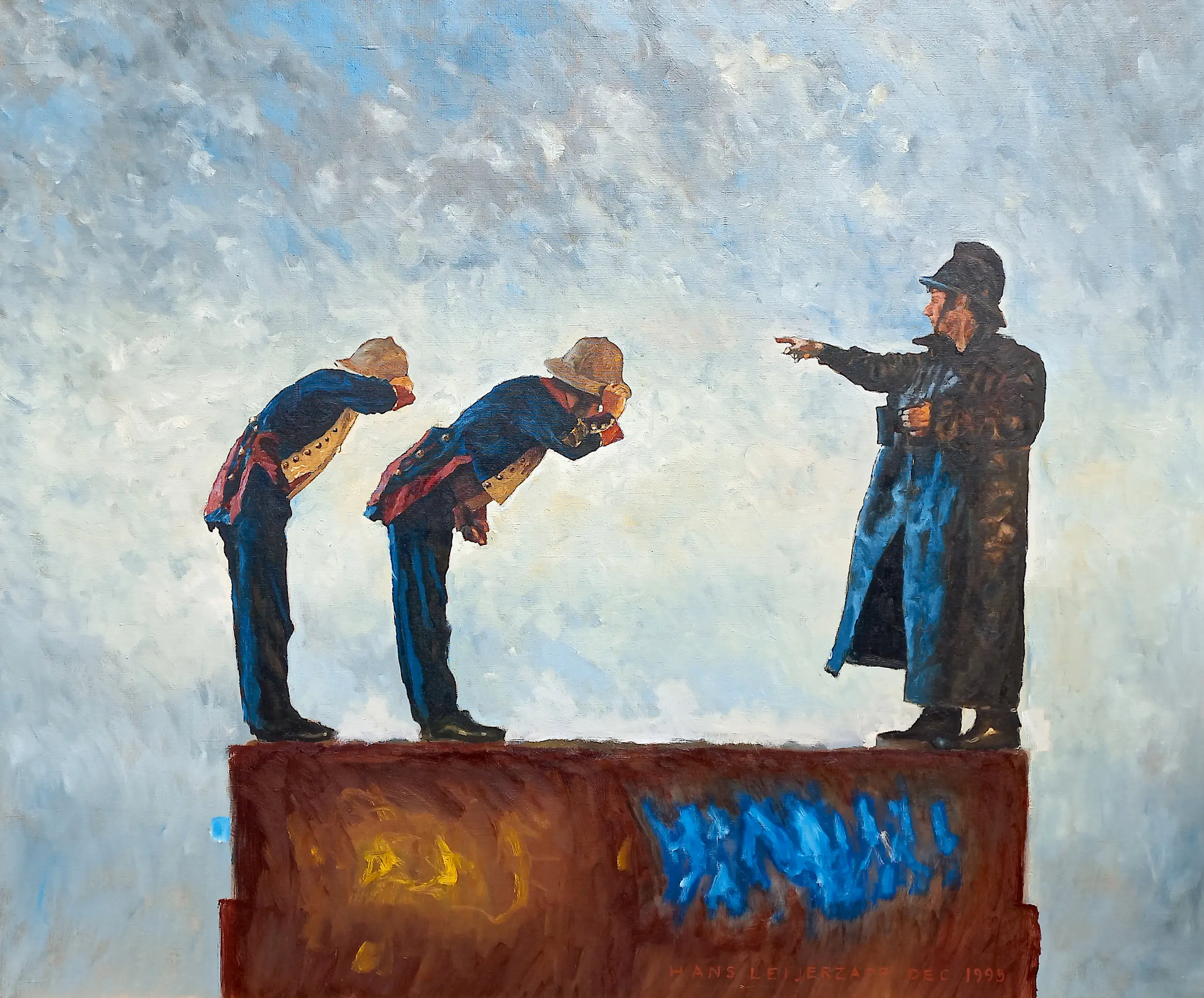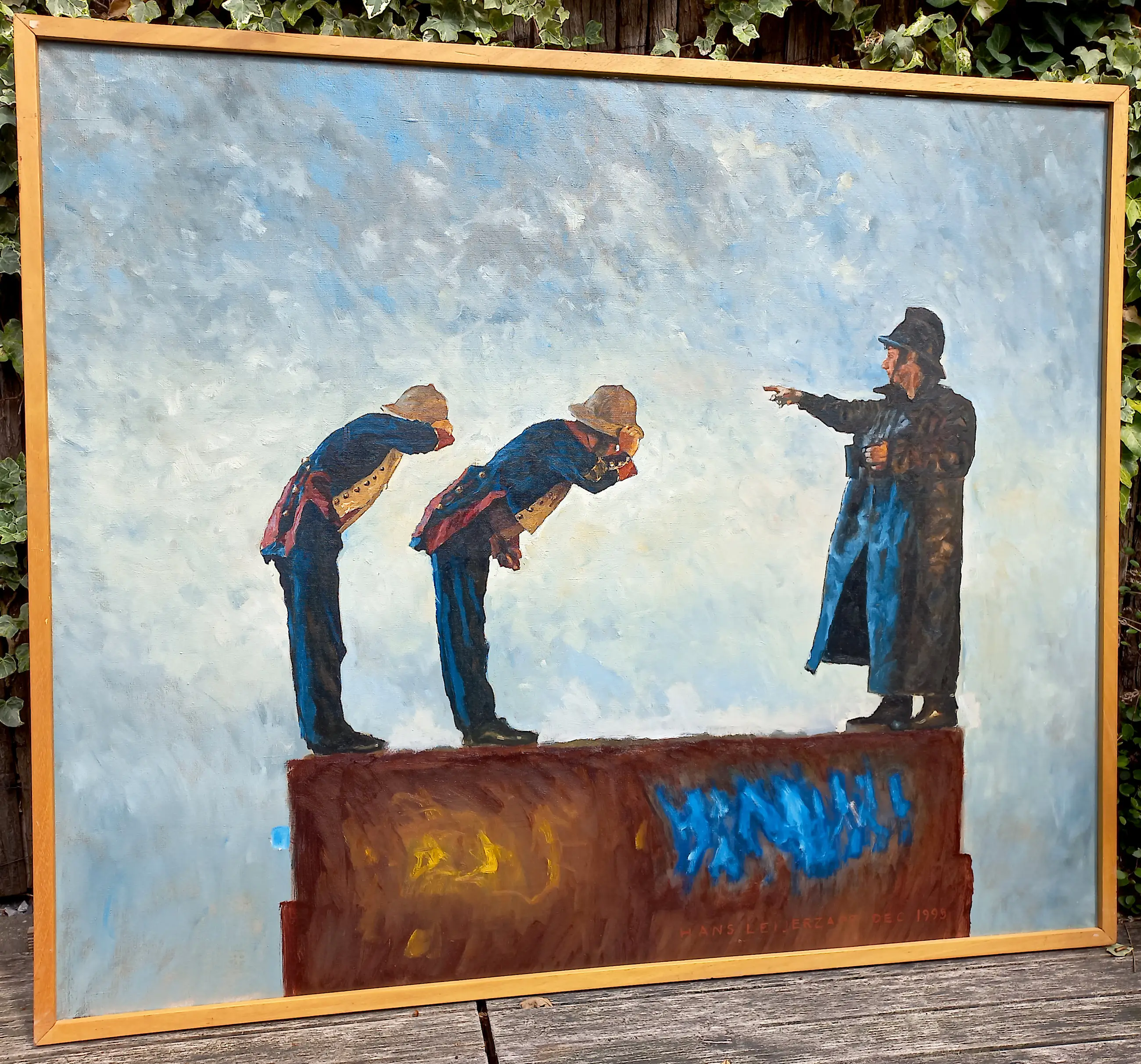 Groot, anekdotisch figuratief werk van Hans Leyerzapf. Olieverf op doek, gesigneerd en gedateerd (1994) rechtsonder, in verso getiteld op het spieraam. In eenvoudige houten lijst. Alles in zeer goede conditie. Oorspronkelijke galerieprijs: 5500 euro.