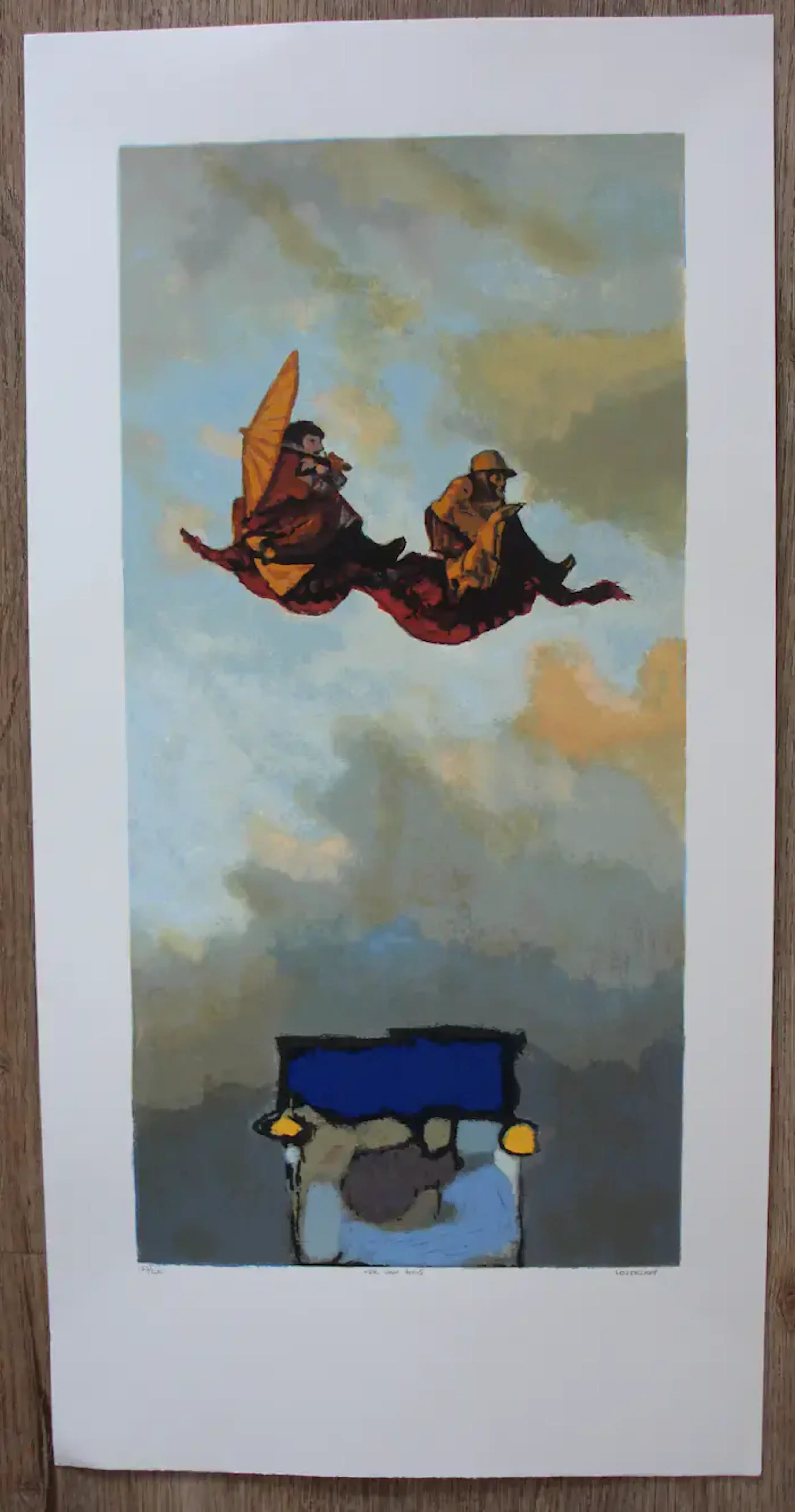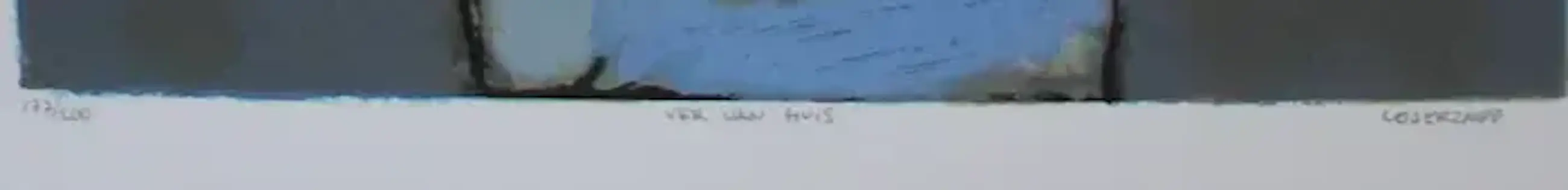 Zeefdruk van Hans Leyerzapf. Titel: Ver van huis. Nummer: 177/200. Afmetingen blad: H65 x b32.5cm. Afmetingen voorstelling: H50 x b24.5cm. Het werk is rechtsonder gesigneerd door de kunstenaar.