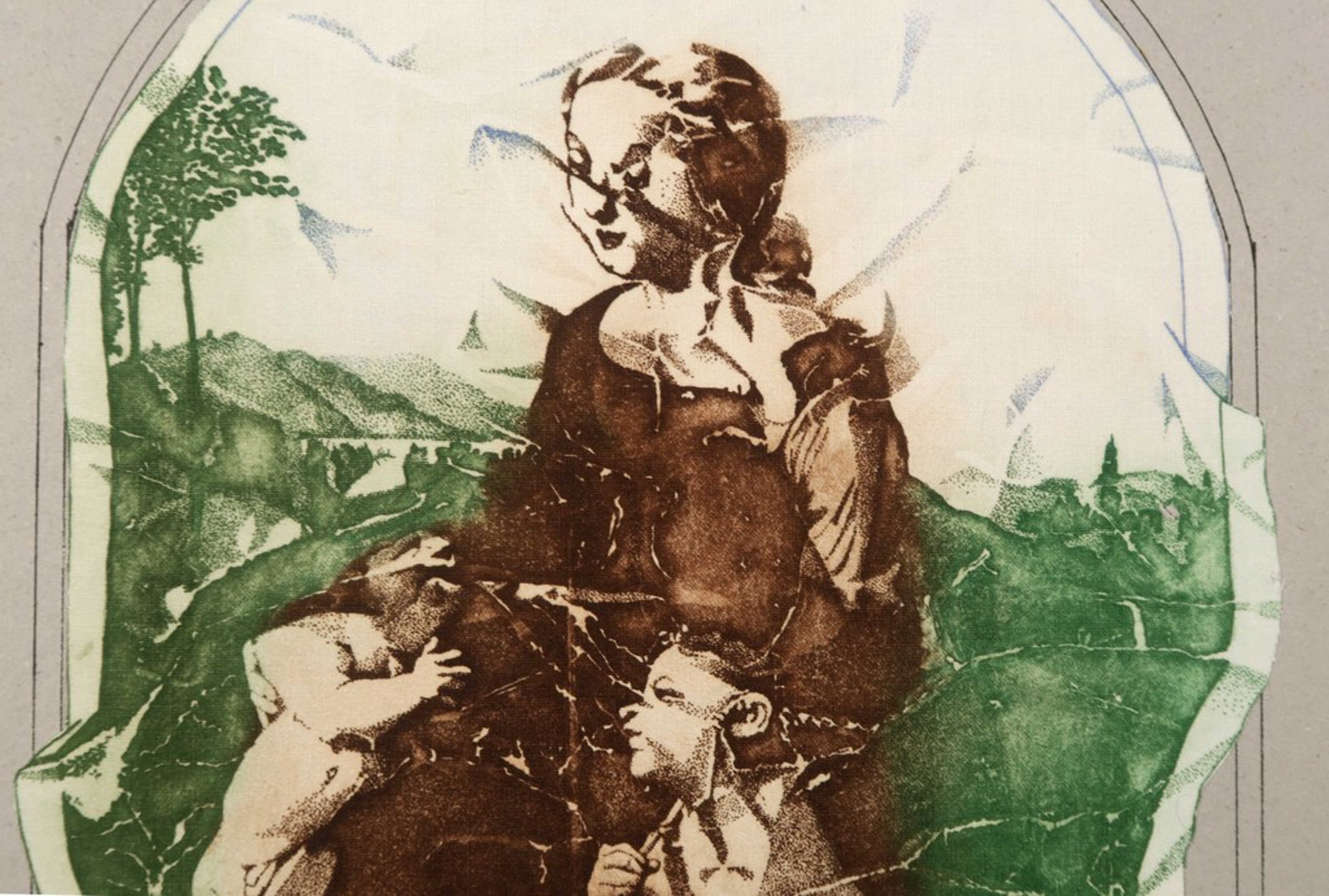 Materiaal: Zeefdruk op katoen, bevestigd op grijs karton met pen bewerkt