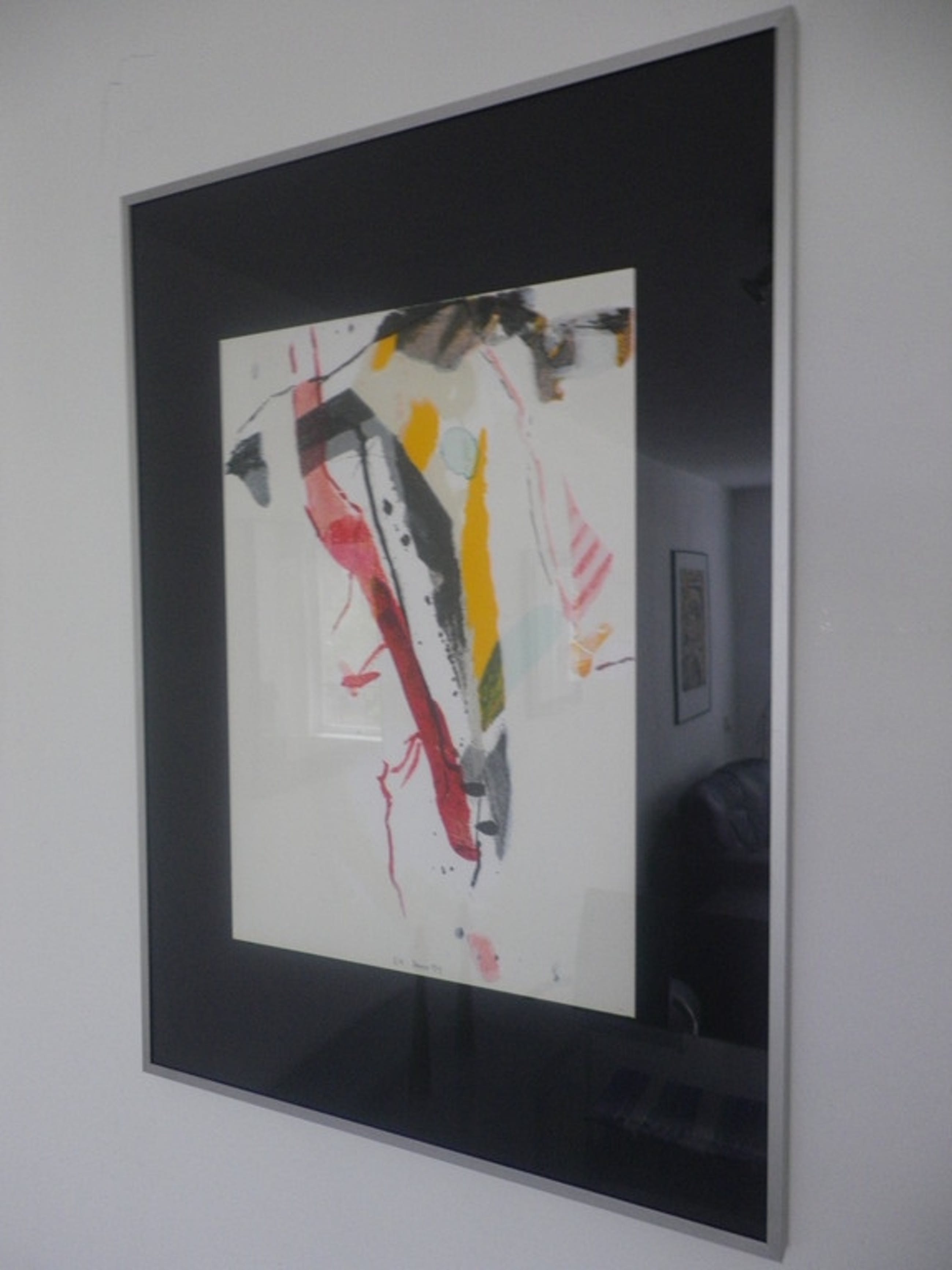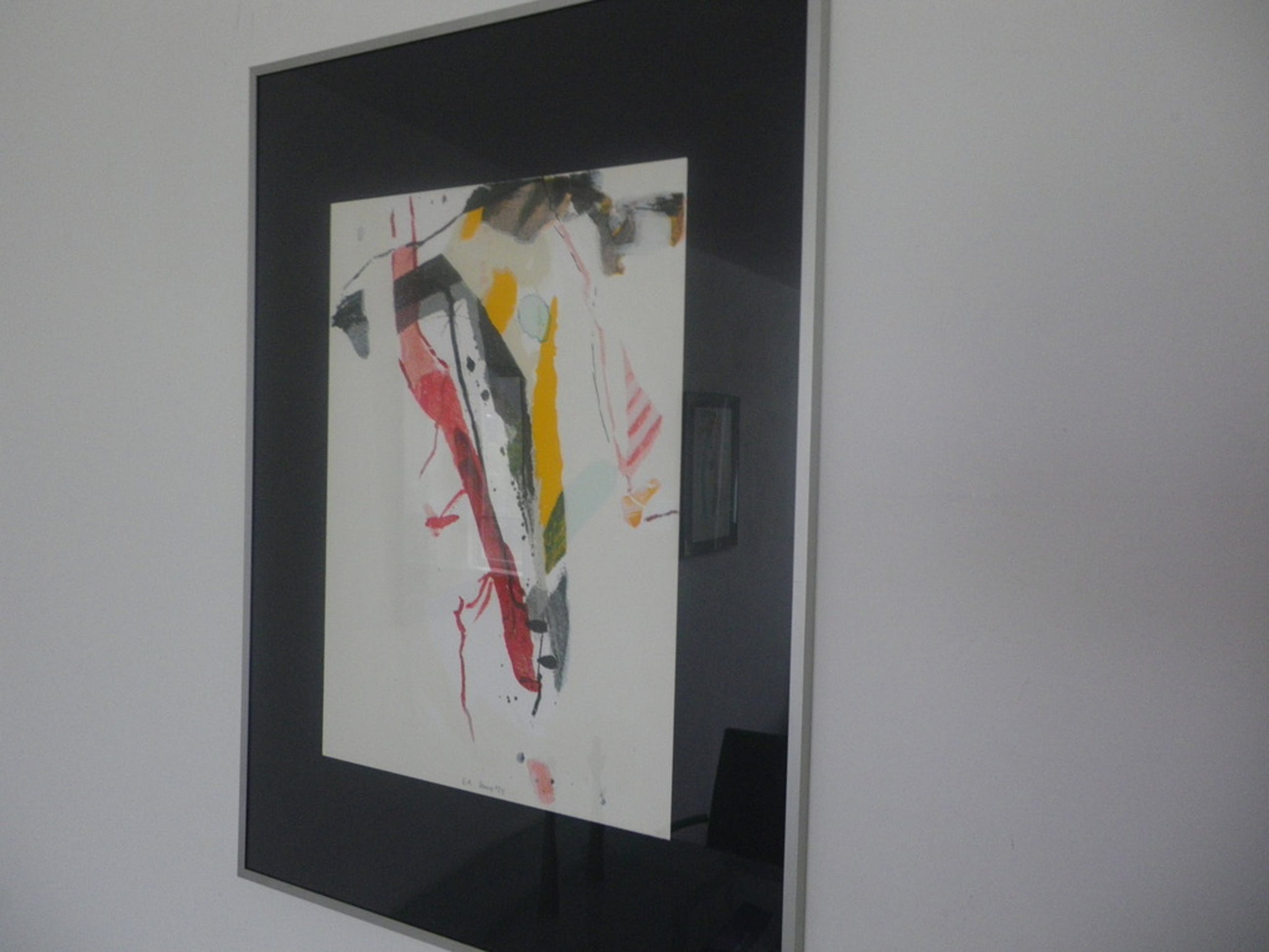 prachtige abstracte zeefdruk ingelijst maten 70x50 cm , genummerd en gesigneerd.