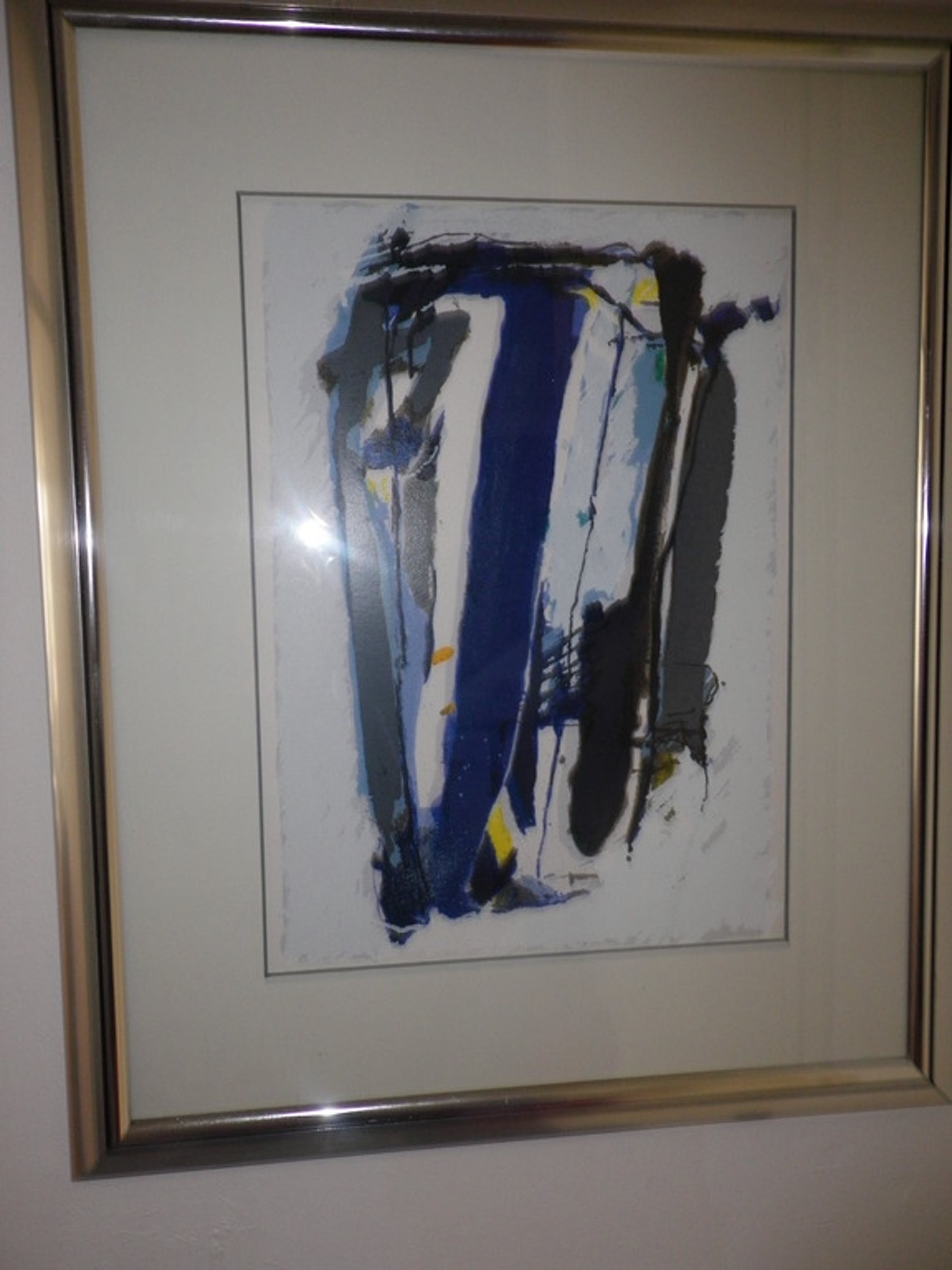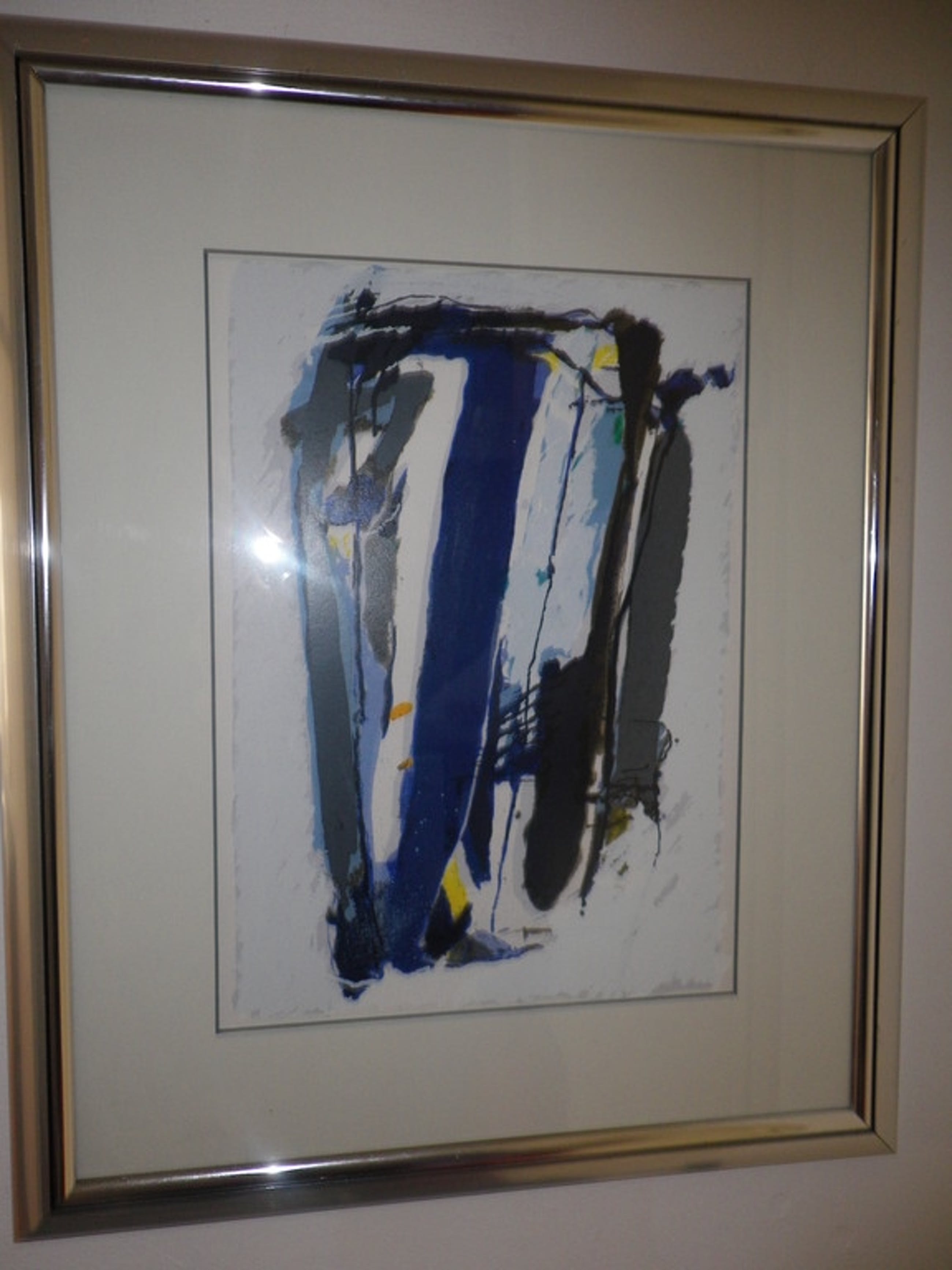 prachtige abstracte zeefdruk ,ingelijst maten 55x46 cm , genummerd en gesigneerd de nummering en de hand tekening staan net onder het passe partout .