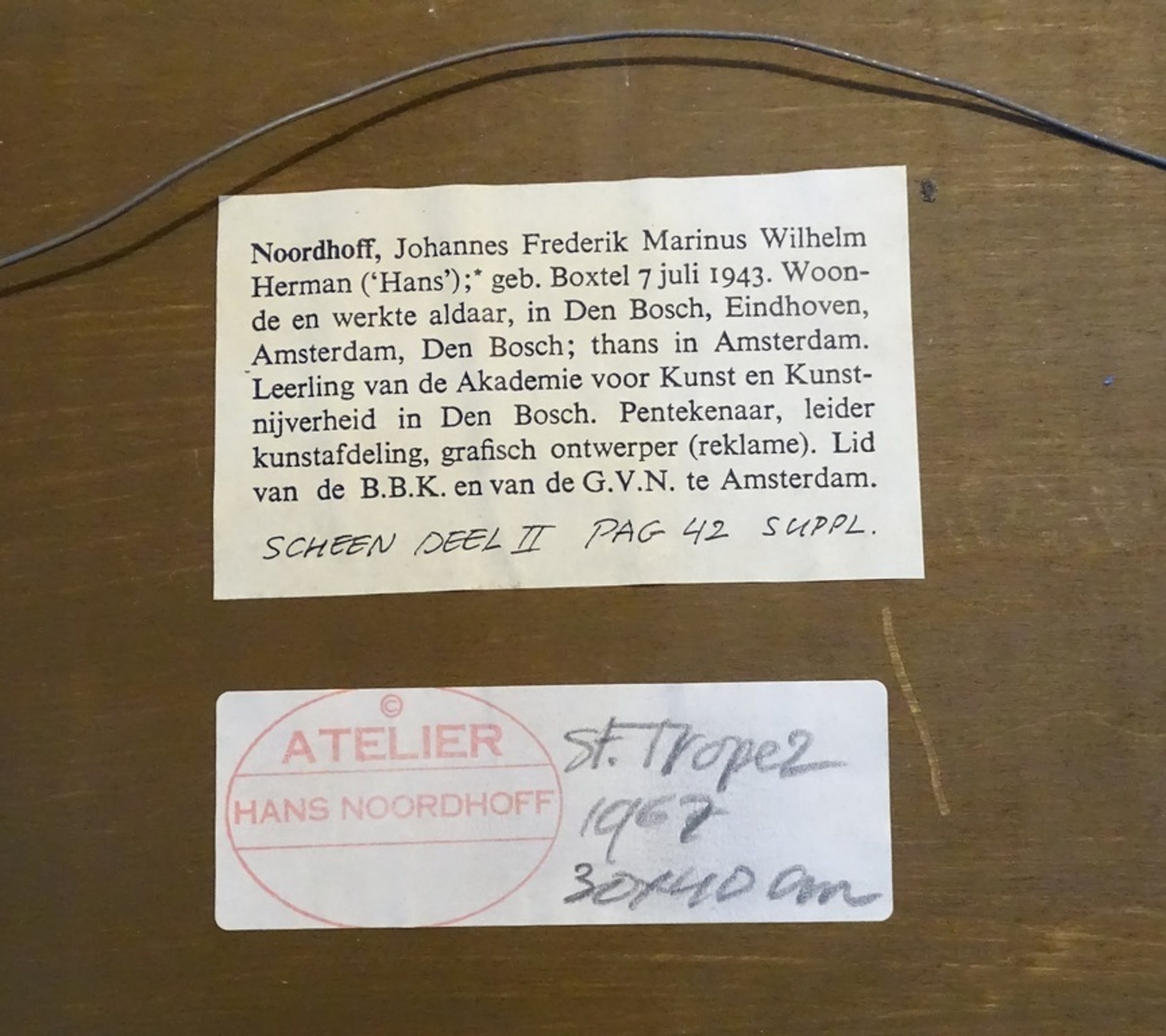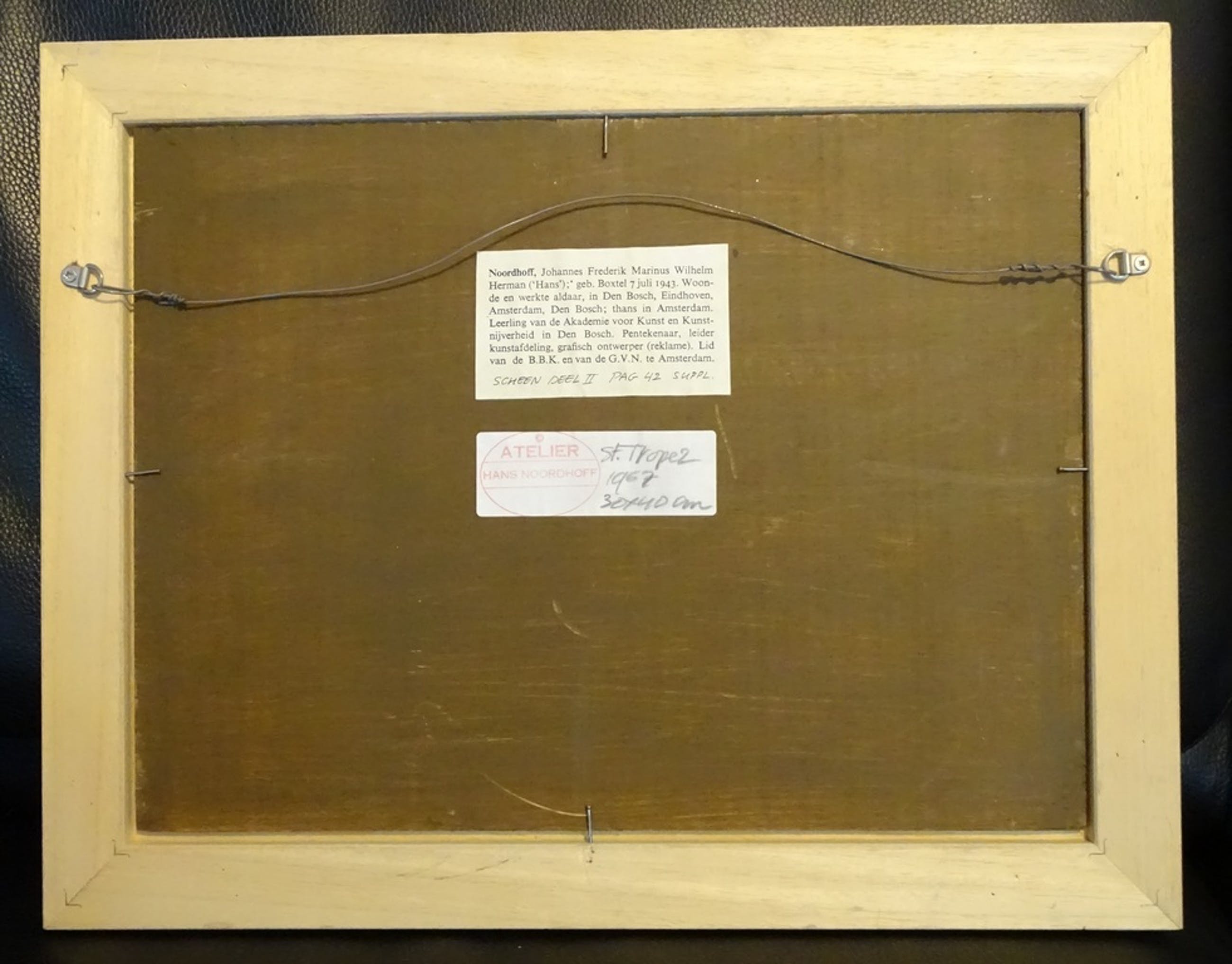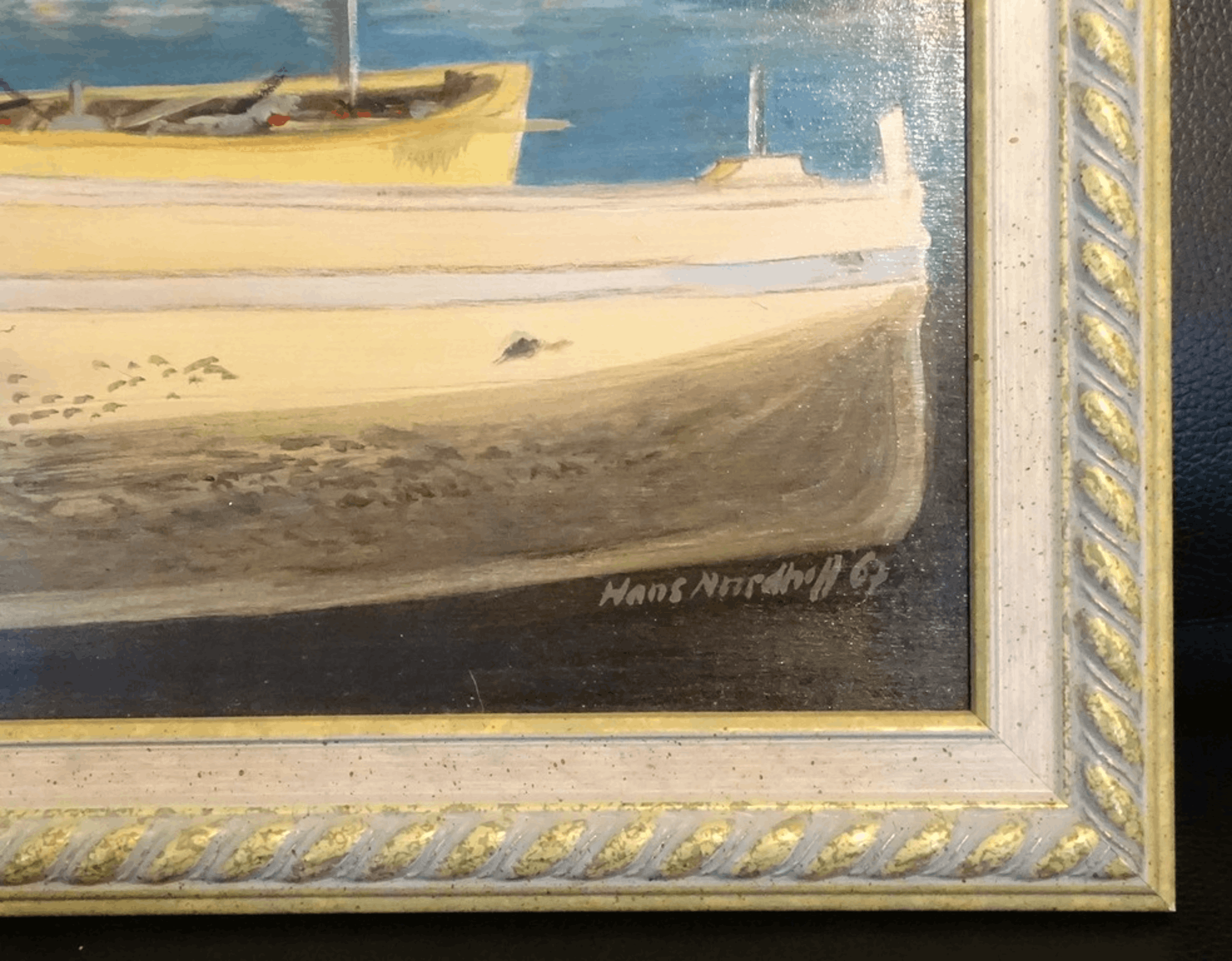 Mooi ingelijst havengezicht, olieverf op paneel, 40x30 cm, rechtsonder gesigneerd en gedateerd. Het betreft een vroeg werk van de kunstenaar Hans Noordhoff. Achterop het paneel informatie over de schilder, zoals vermeld in de Scheen. Zowel schilderij als lijst (48x38 cm) zijn in prima conditie en het werk kan meteen aan de muur.