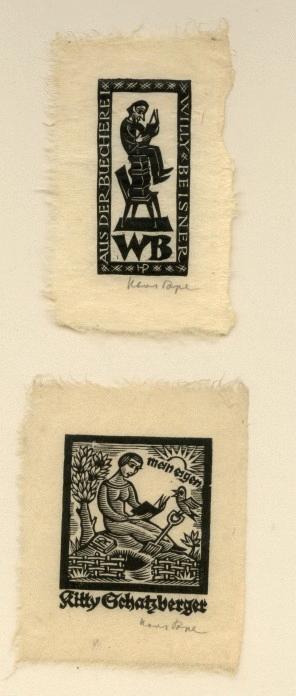Hans Pape Zwei kleine Exlibris.Kitty Schatzberger und Willy Beisner.Zwei Holzschnitte signiert. Rückseitig leider an der oberen Kante auf Karton befestigt.Privatverkauf.Versand 7 Euro.