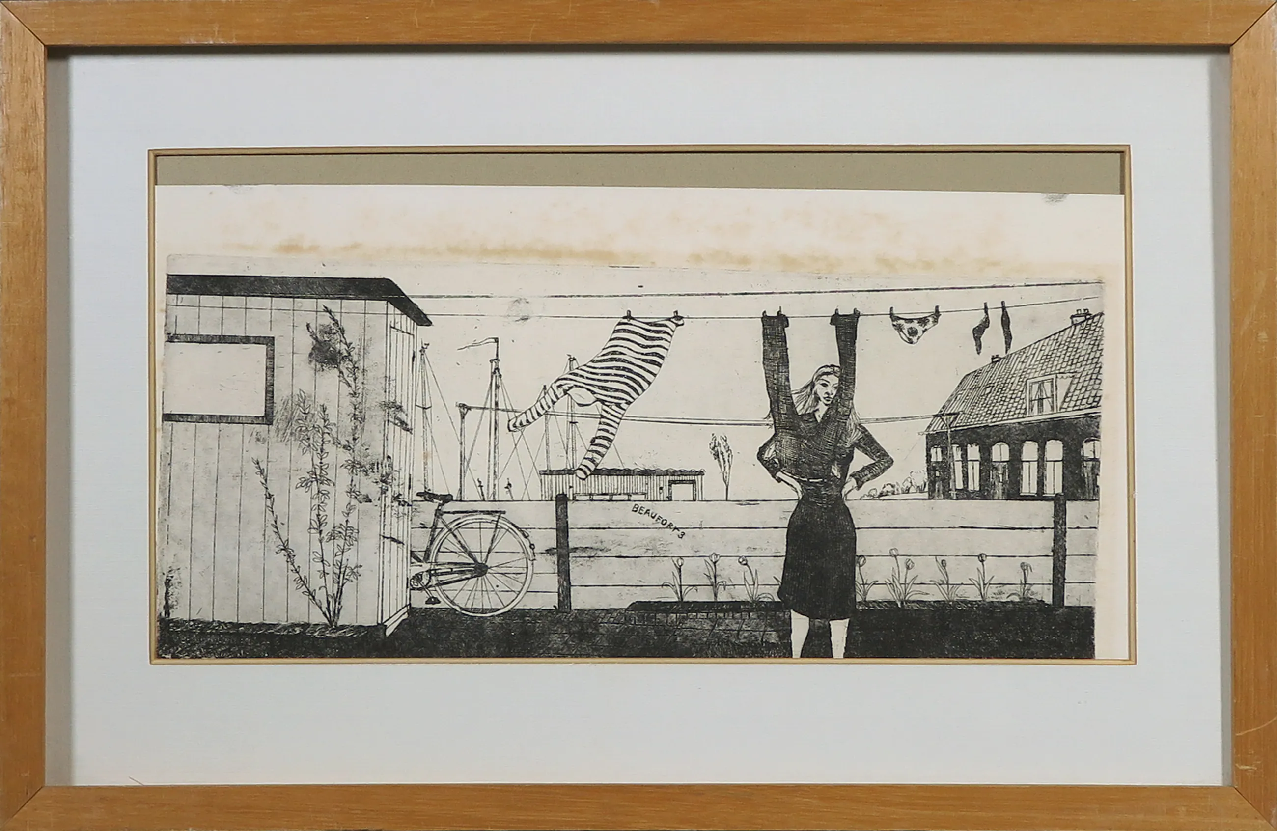 | Papier rond de druk heeft zuurschade. Werk is verschoven in lijst, glas zit los in lijst. | |