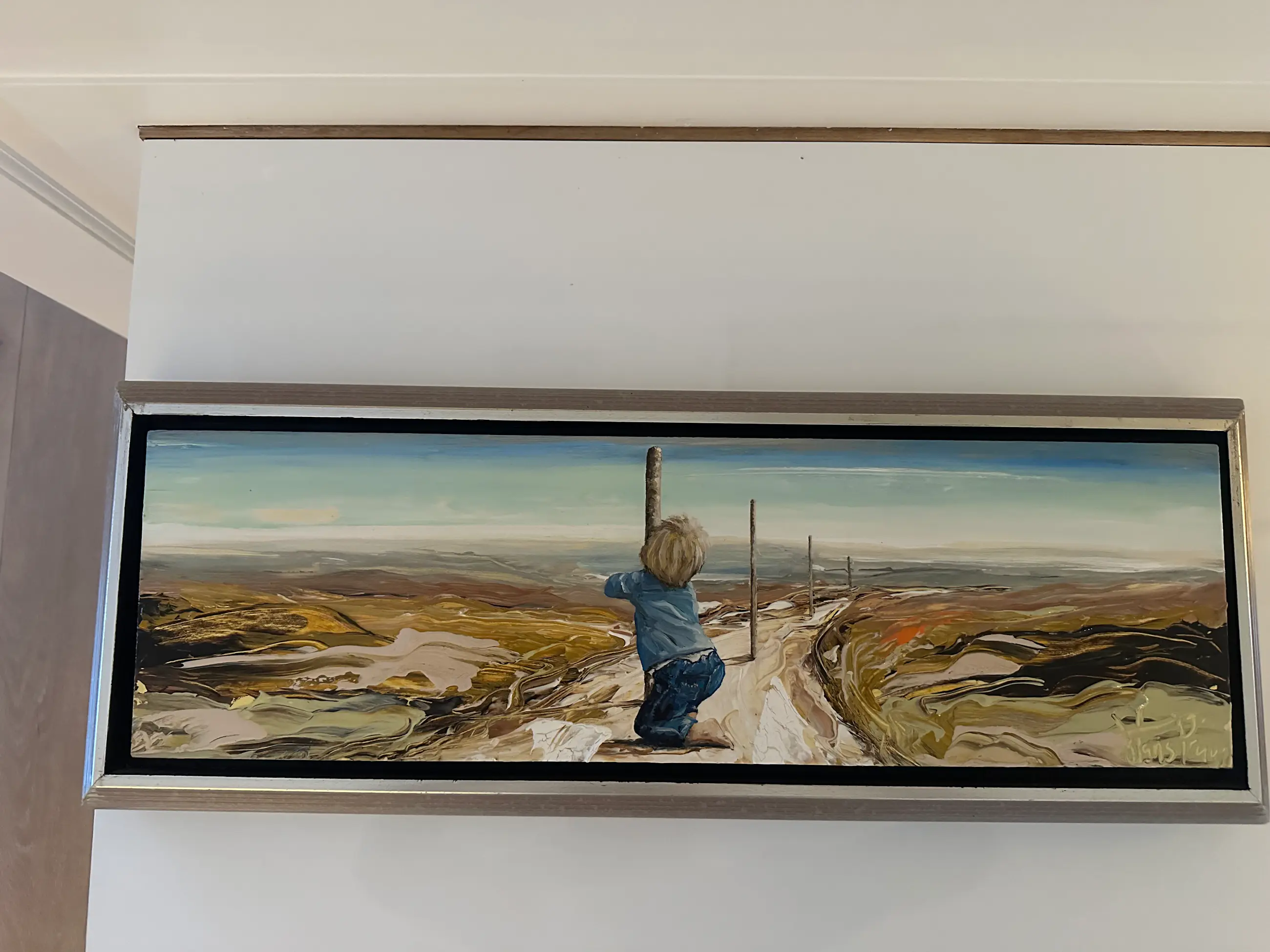 Prachtig symbolisch schilderij van een jongetje die zich optrekt aan paal en kijkt naar de weg/route die hij nog moet afleggen, weergegeven in prachtig landschap.