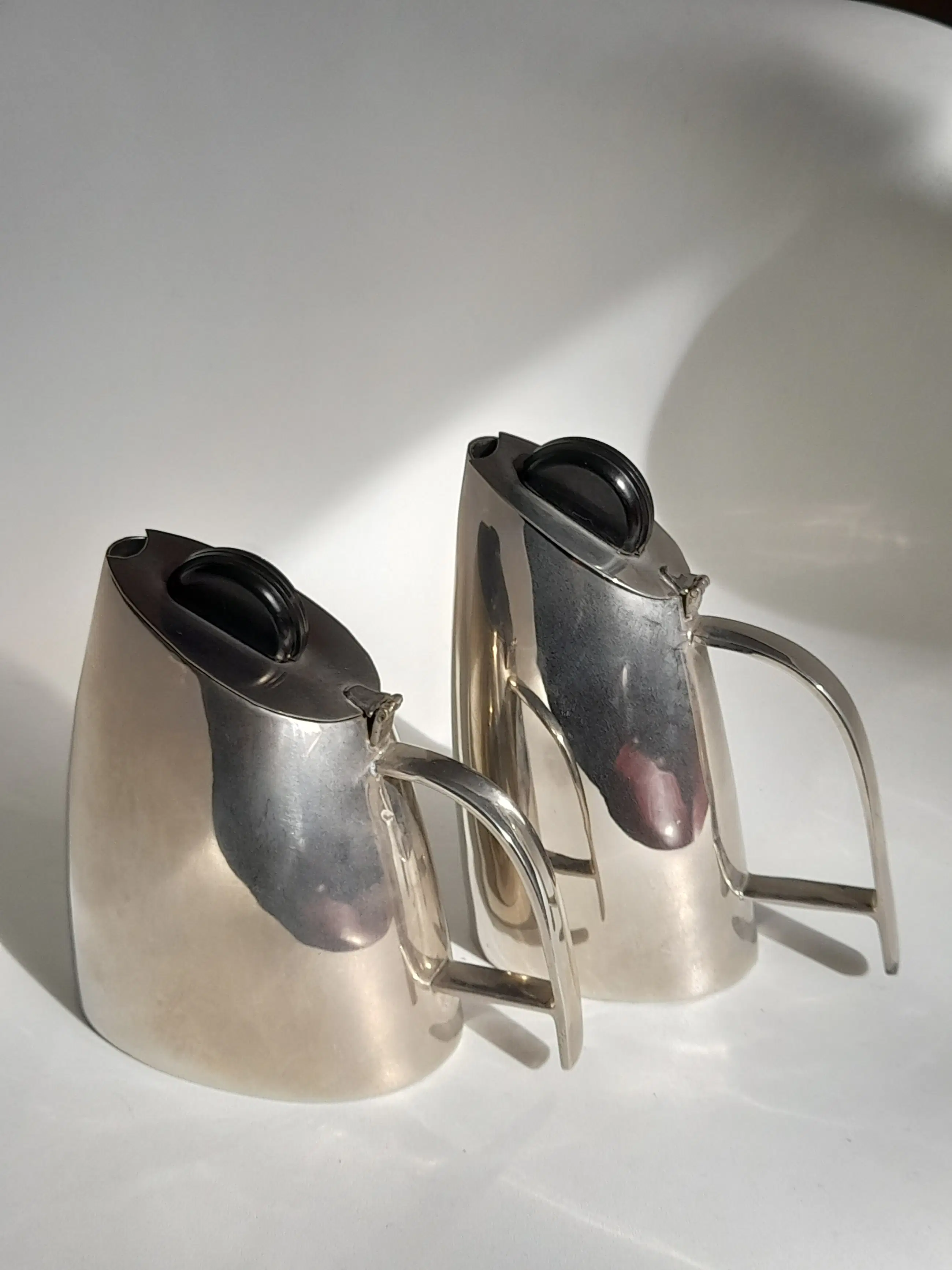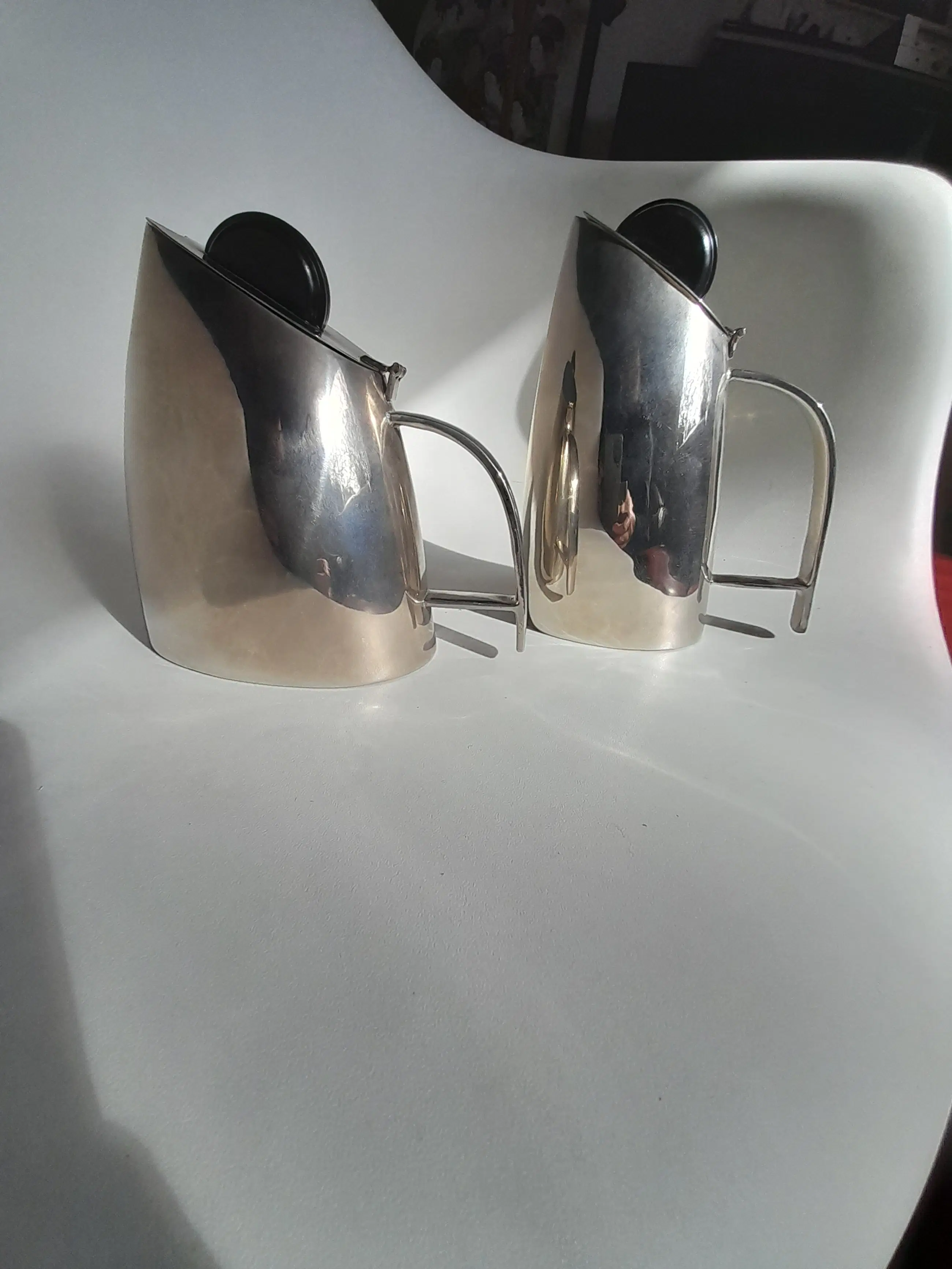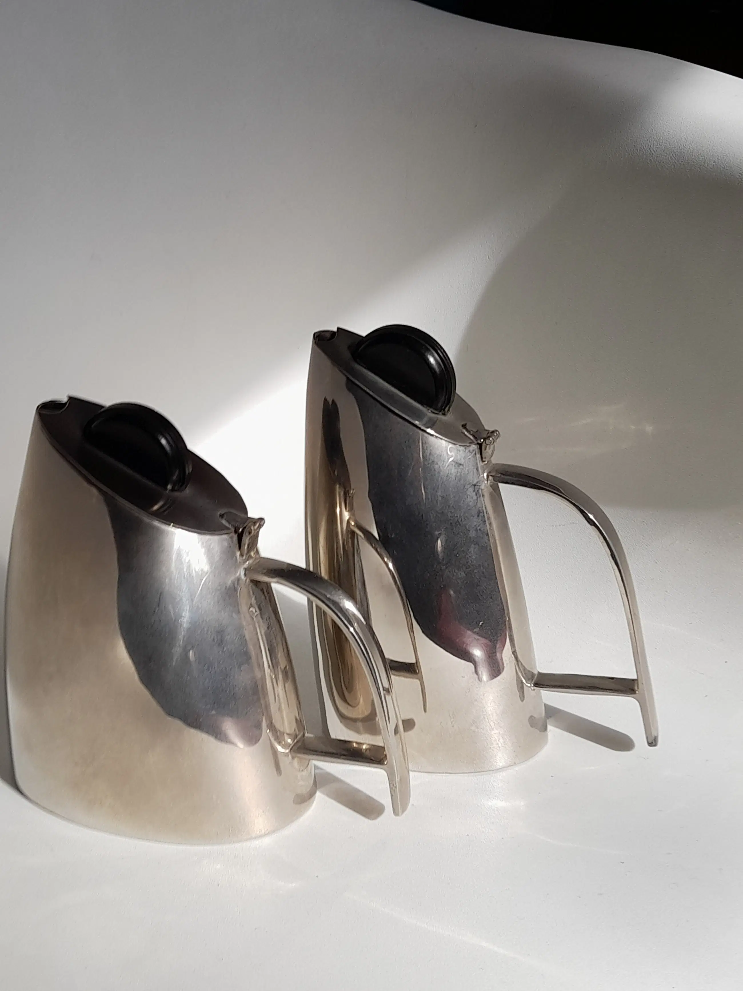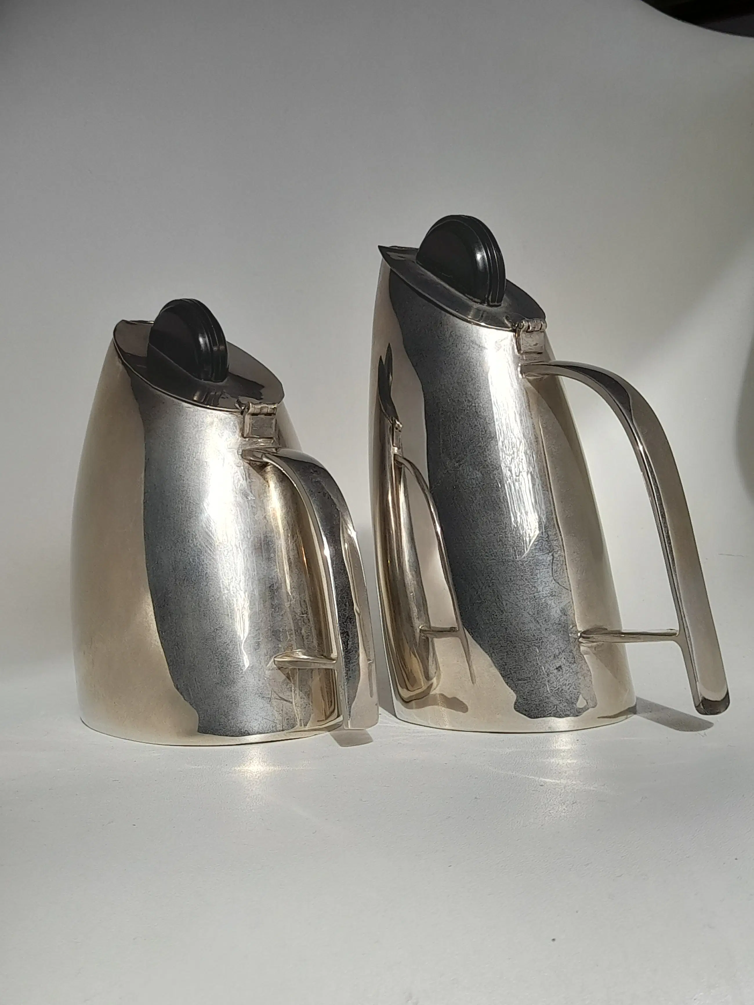 Twee prachtige Bauhaus kannen van staal. Gemaakt door Hans Przyrembel ca;1940. Deze verkeren in bijna perrfecte staat,een enkel licht krasje op de buik van de brede kan. Beide kannen hebben geen deukjes en de deksels scharnieren en sluiten optimaal. Alles heel solide, een prachtige set Bauhaus kannen.