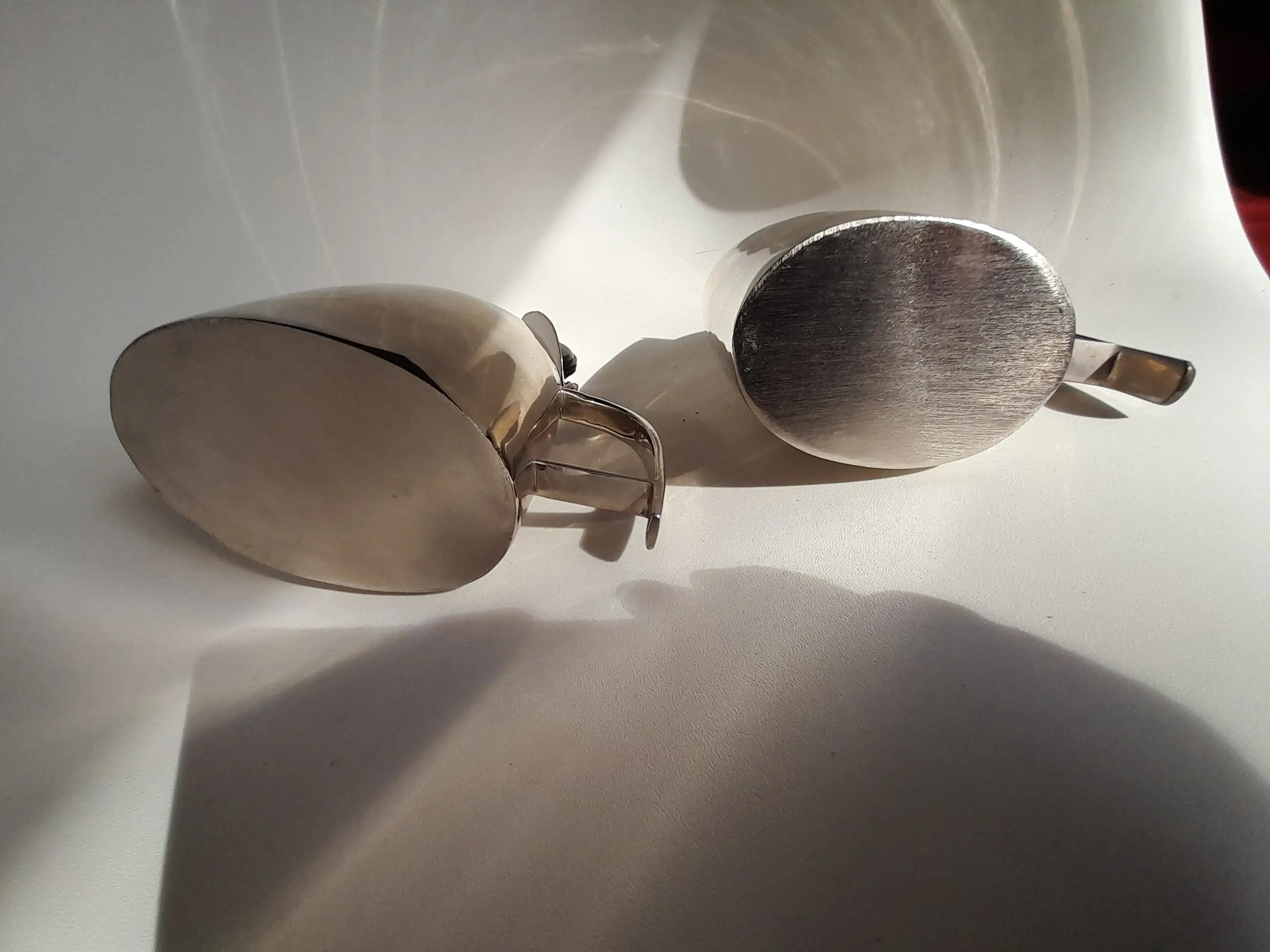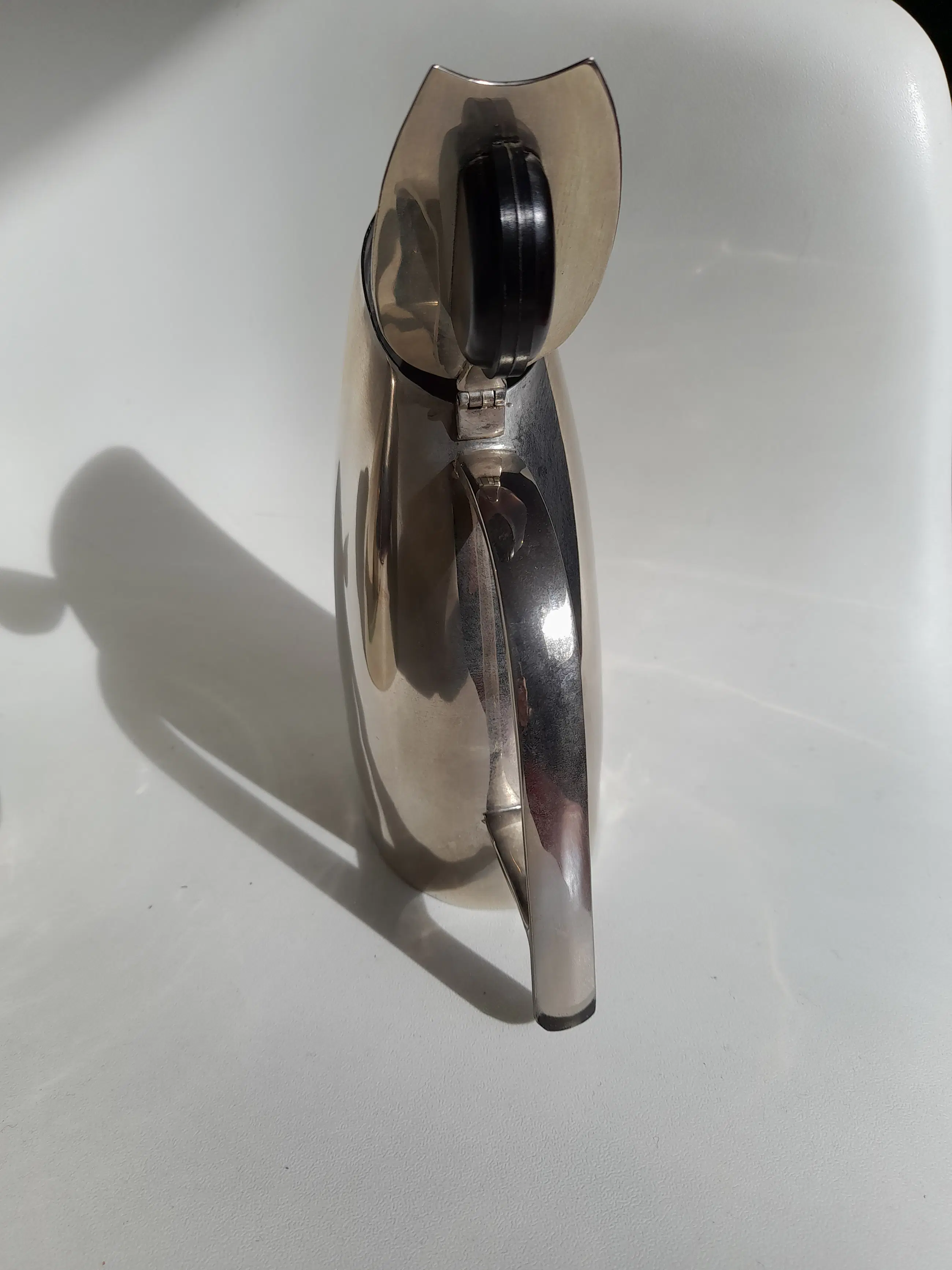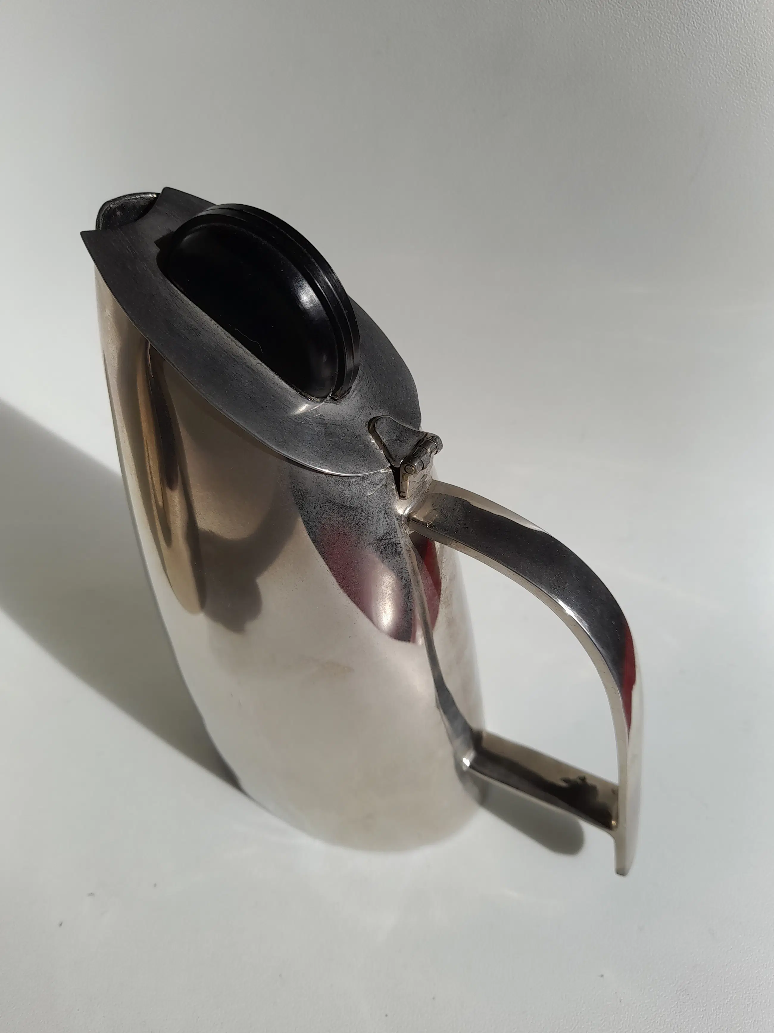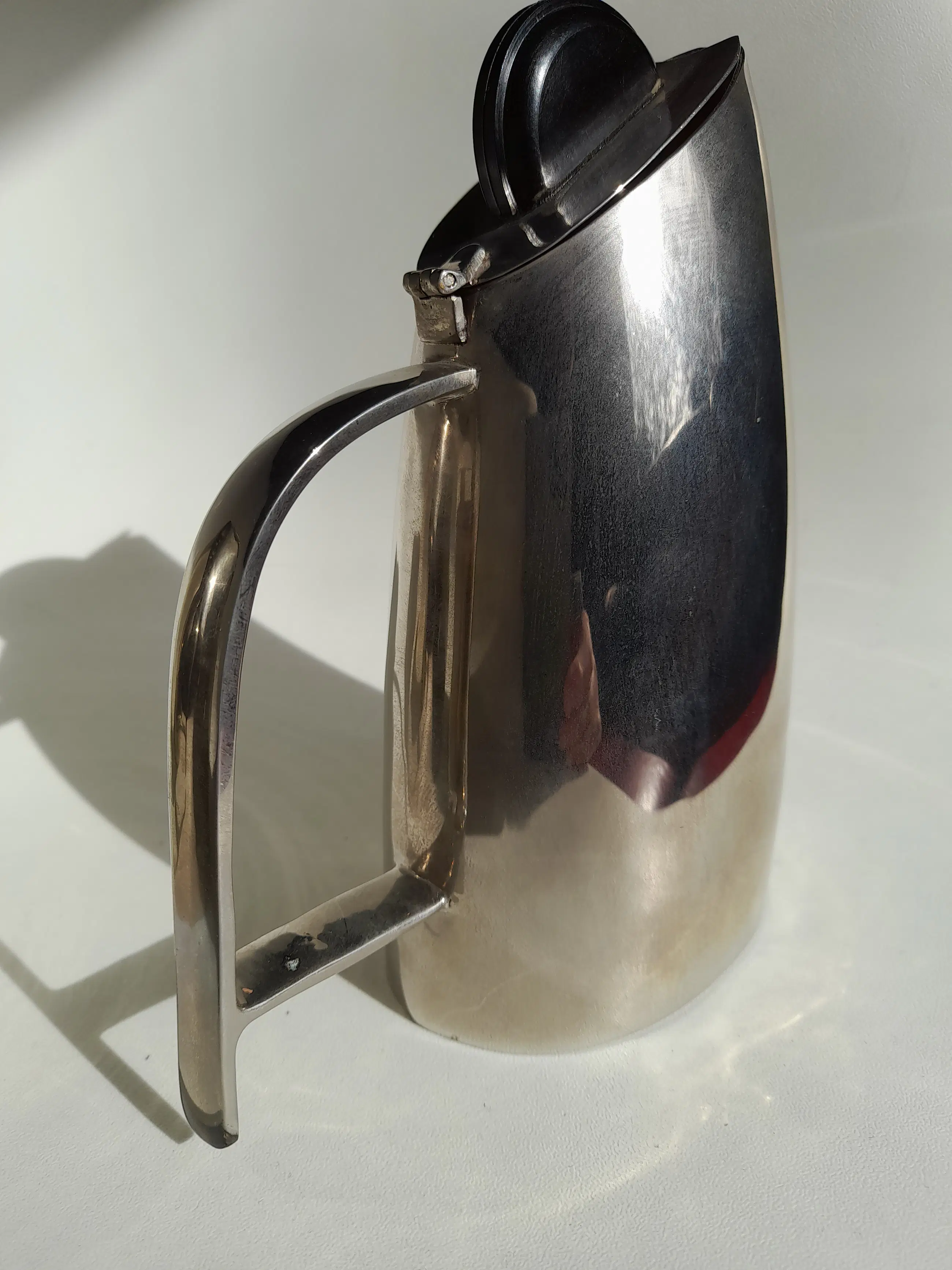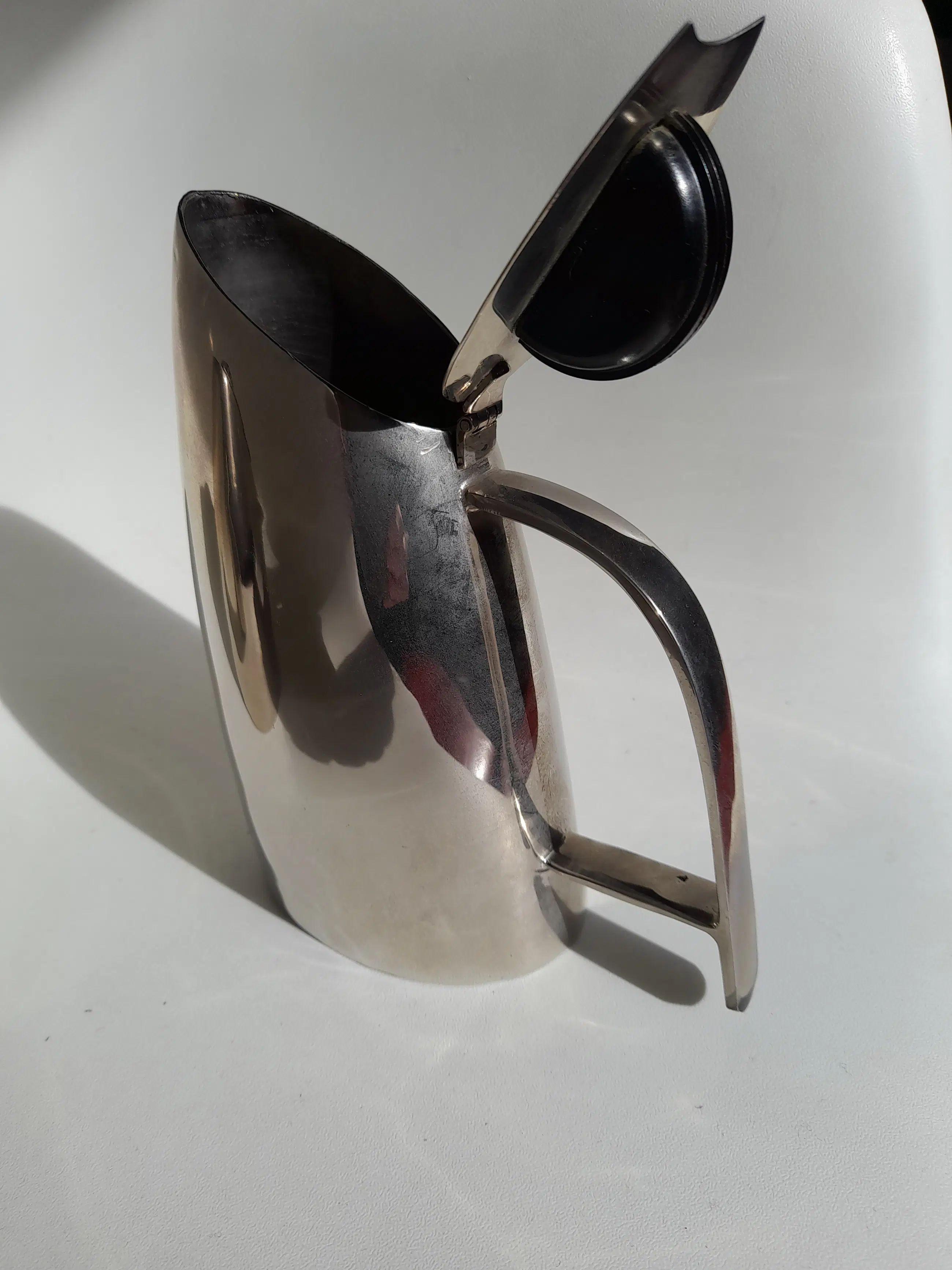 Twee prachtige Bauhaus kannen van staal. Gemaakt door Hans Przyrembel ca;1940. Deze verkeren in bijna perrfecte staat,een enkel licht krasje op de buik van de brede kan. Beide kannen hebben geen deukjes en de deksels scharnieren en sluiten optimaal. Alles heel solide, een prachtige set Bauhaus kannen.