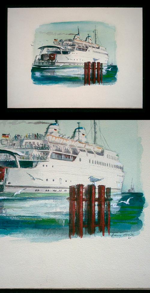 Hans Räde (* 1921). Schiff bei der Ausfahrt, Aquarell, 1961.