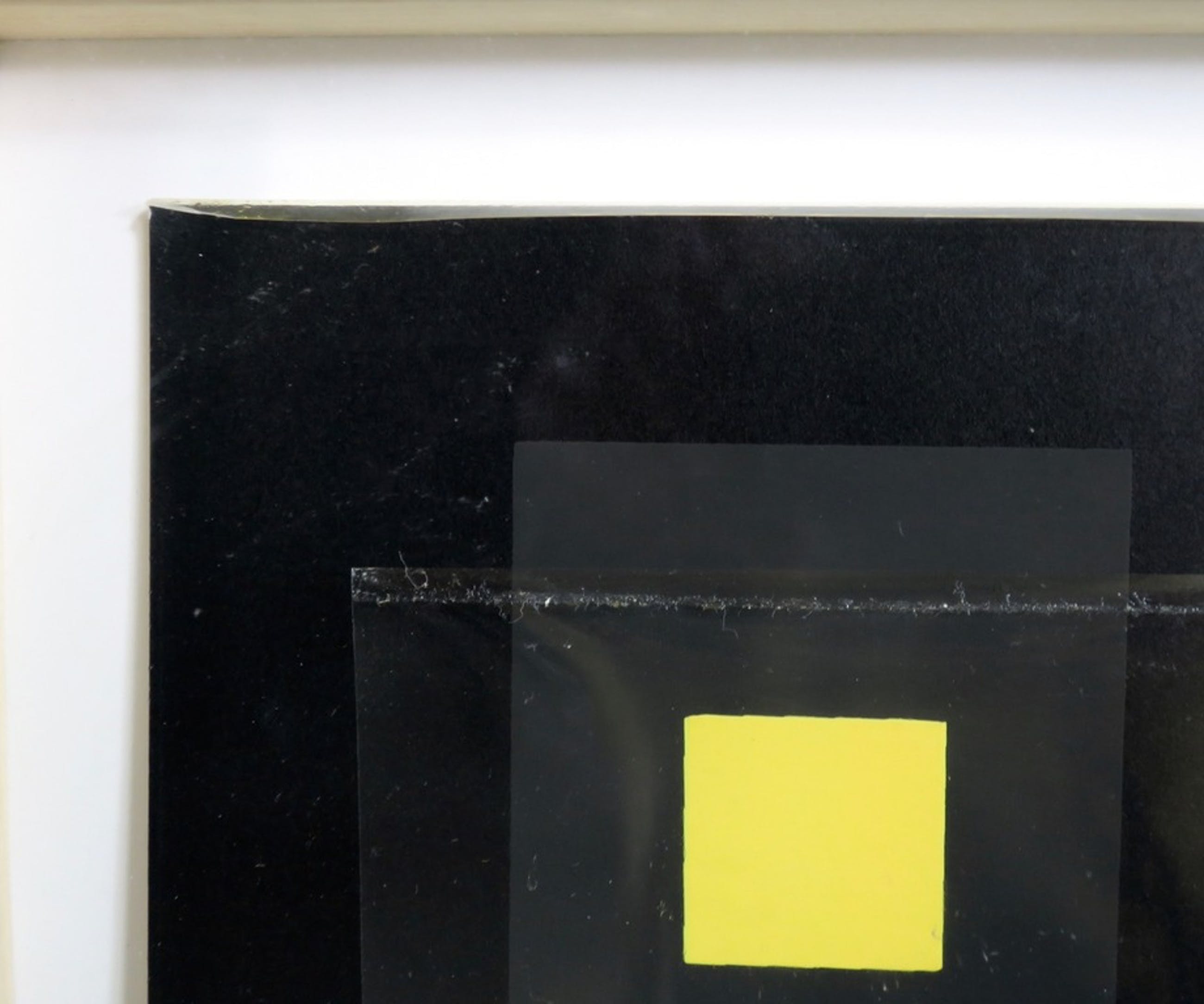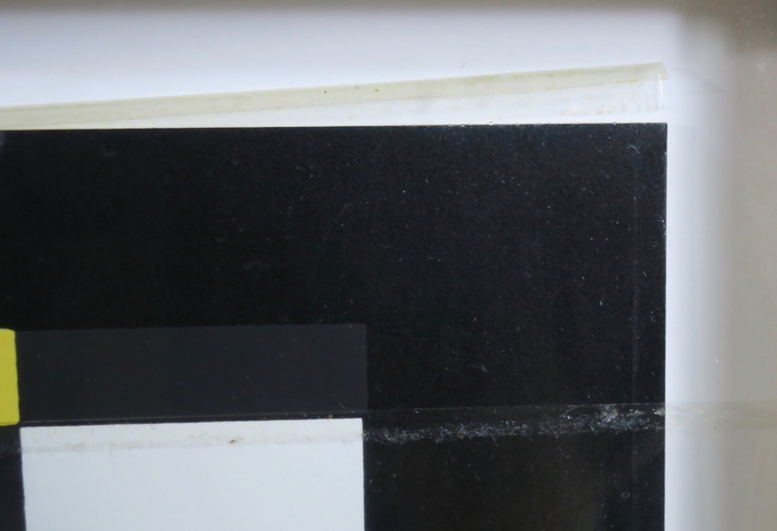 Conditie: Zowel de zeefdruk als de folie zijn in goede staat maar de bevestiging van de folie aan de zeefdruk (plakrand bovenin) heeft losgelaten en moet gerestaureerd worden (zie foto's)