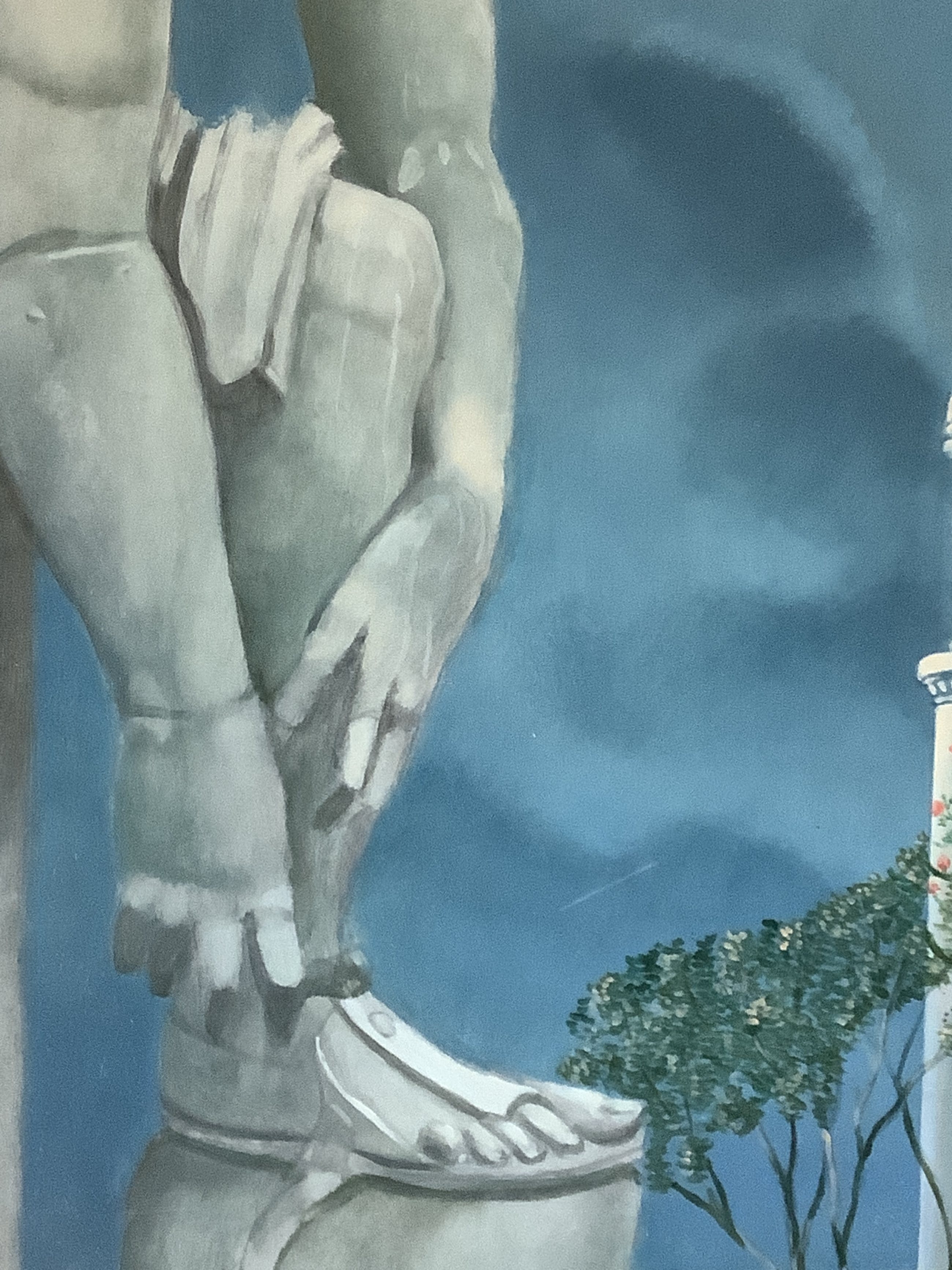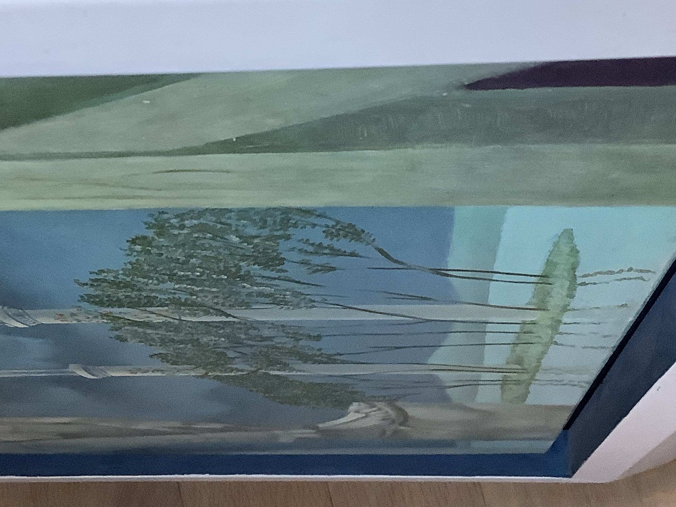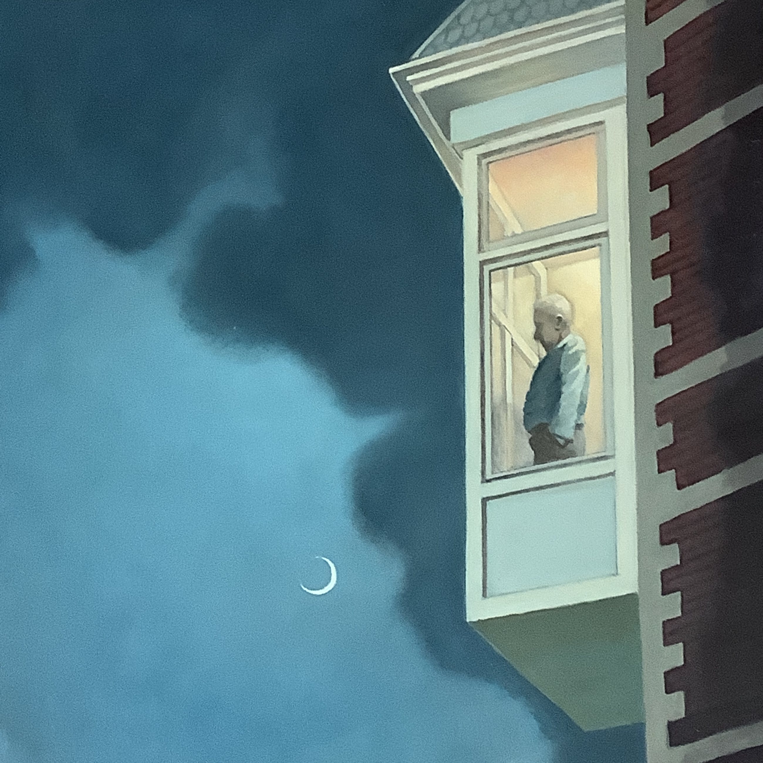 Mooi werk van de kunstenaar Hans Rombouts 1937- heden werk uit 1995 man starend vanuit een erker naar de beelden. Acryl/ olieverf op paneel in originelen lijst. Mooi Magisch Realistisch werk.