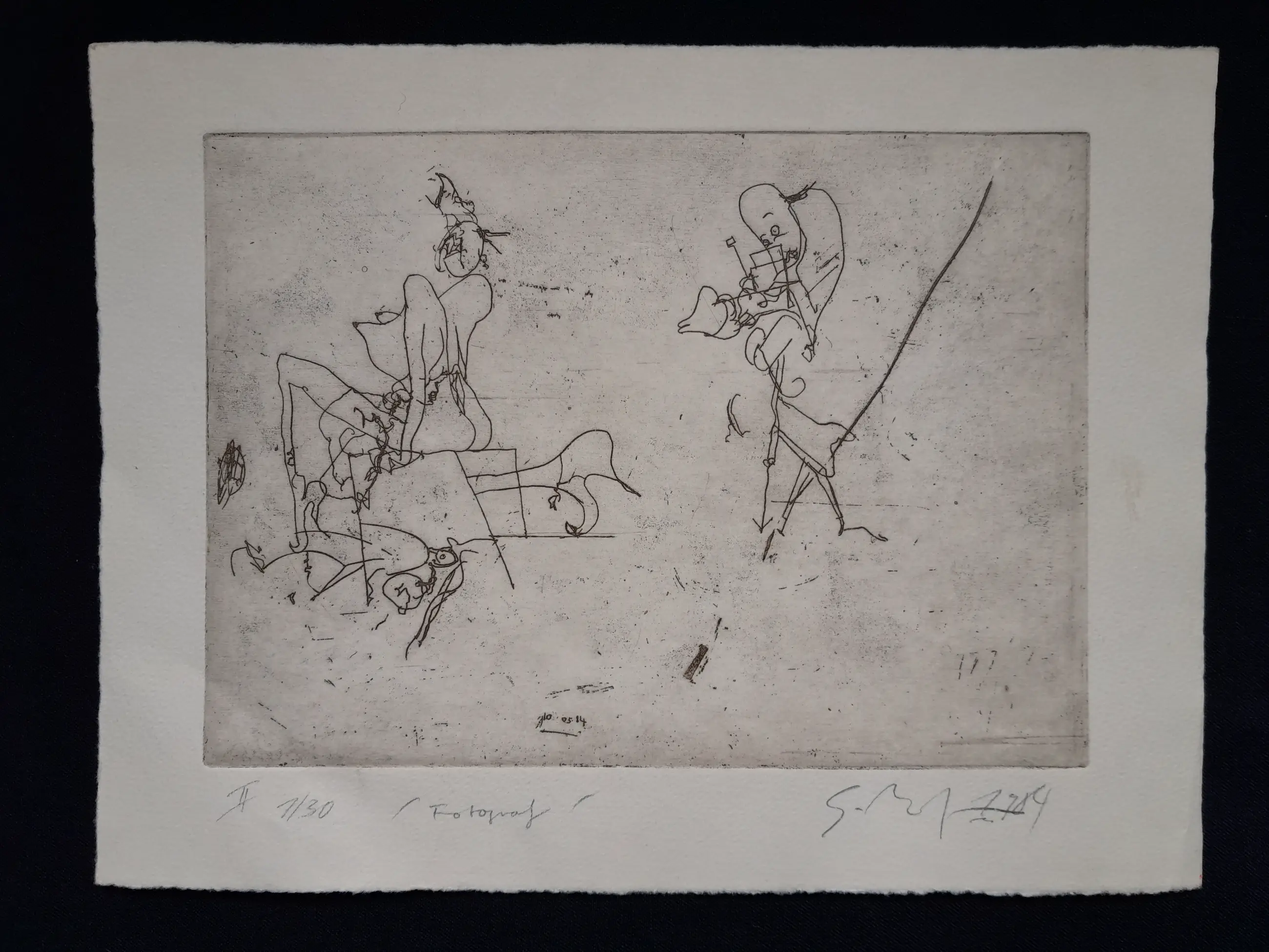 Eine pointierte, launige Arbeit von Scheib auf festem Bütten. Numeriert, bezeichnet und von Hand signiert.