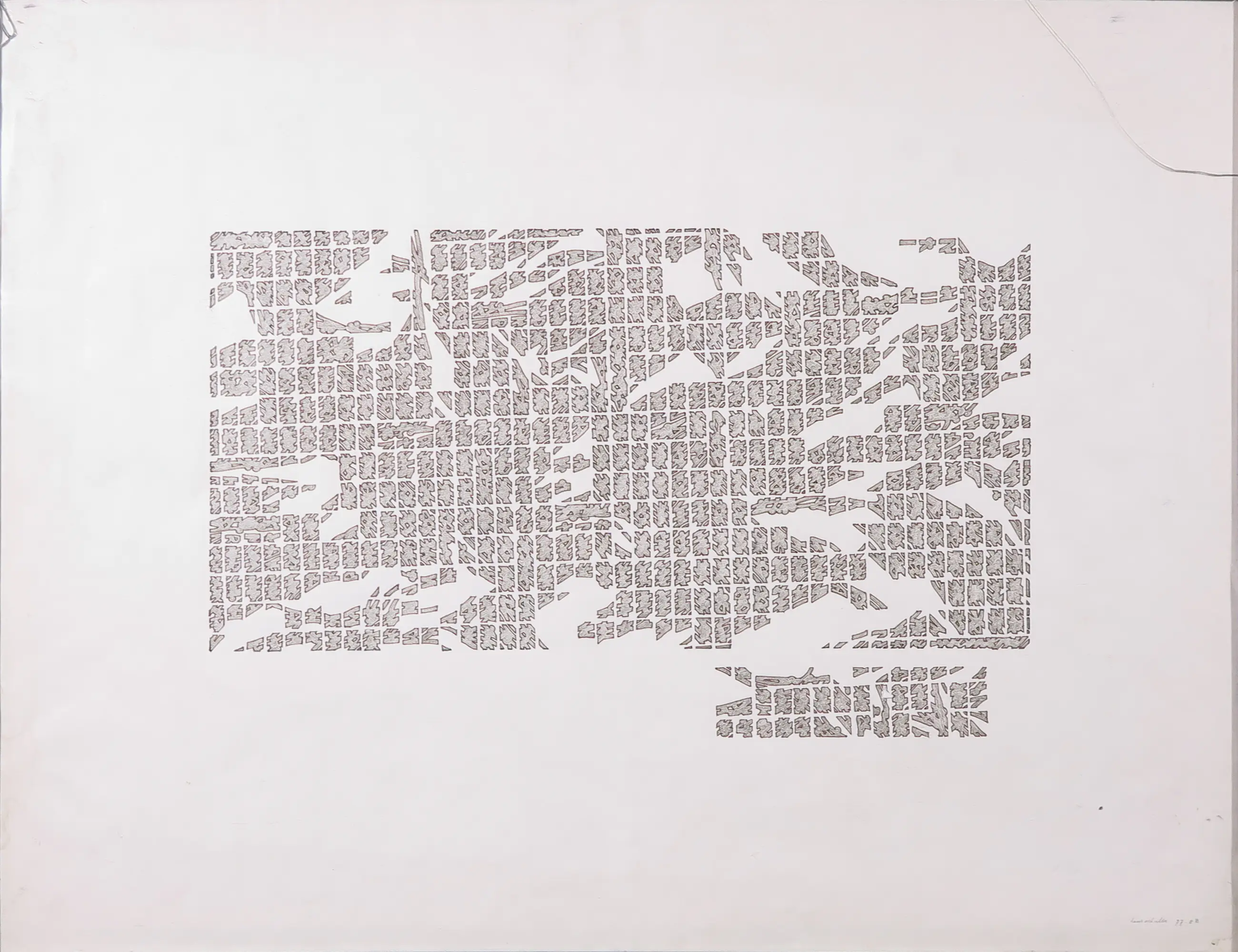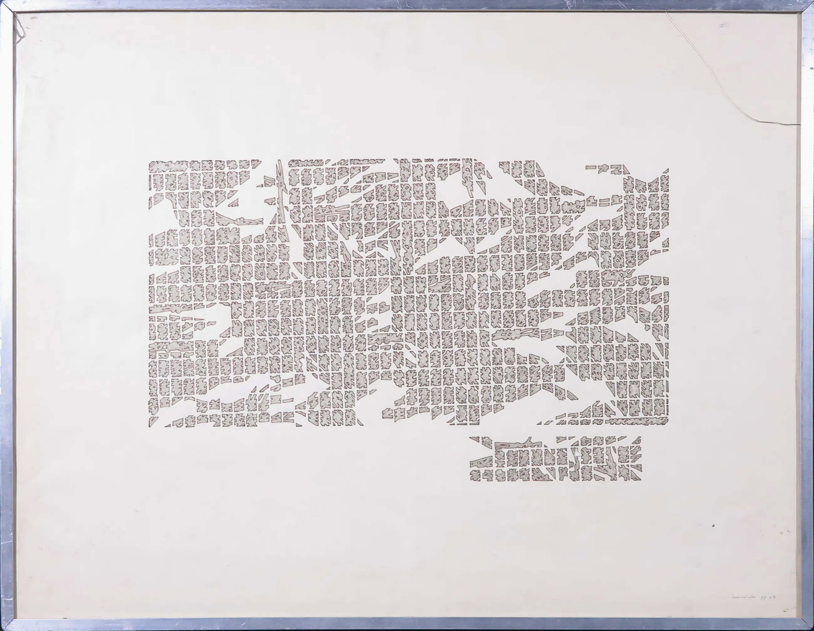 In de rechter bovenhoek is het glas van de lijst licht beschadigd. Ook in de linker bovenhoek zit een kleine beschadiging in het glas. Het papier en de voorstelling zelf zijn in goede conditie, ondanks kleine vlekjes en oneffeneden aan de randen. Als laatste is het werk ondersteboven ingelijst. | |