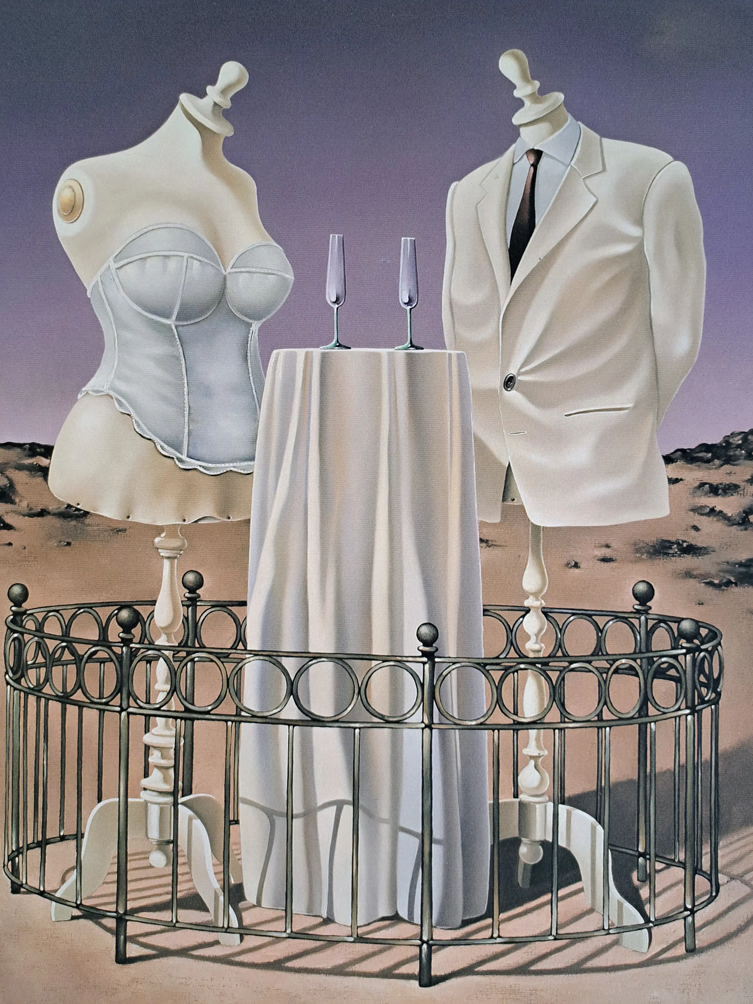 De zeefdruk verbeelt een sessie van personages die zich begeven binnen een verbindende omgeving.
