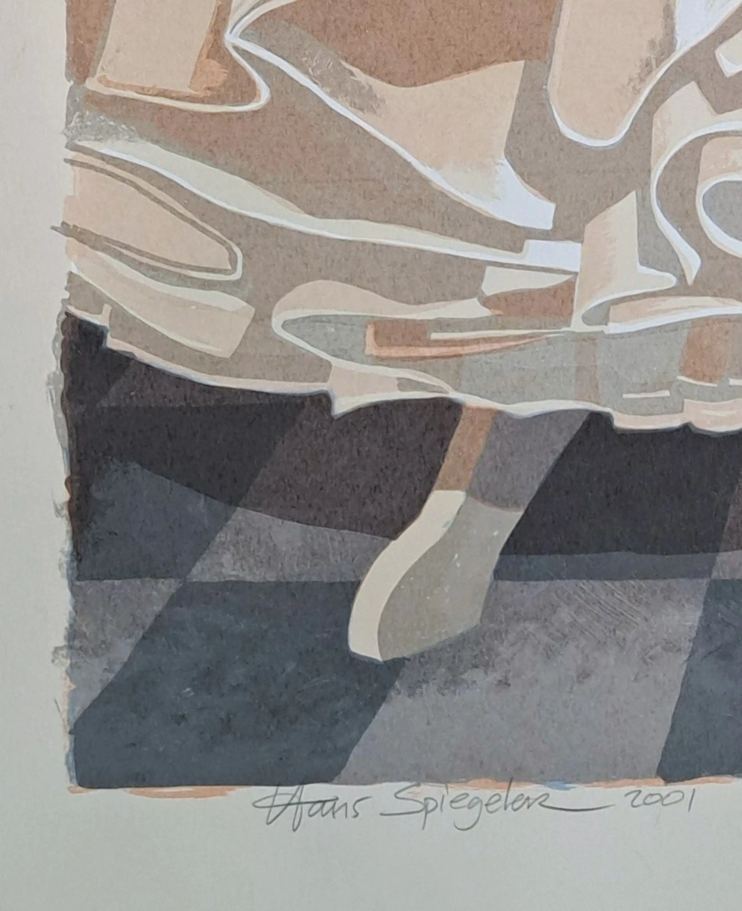 De zeefdruk verbeelt een ontmoeting tussen twee personages na opening van de deuren. Een uitnodiging hangt in de lucht.
