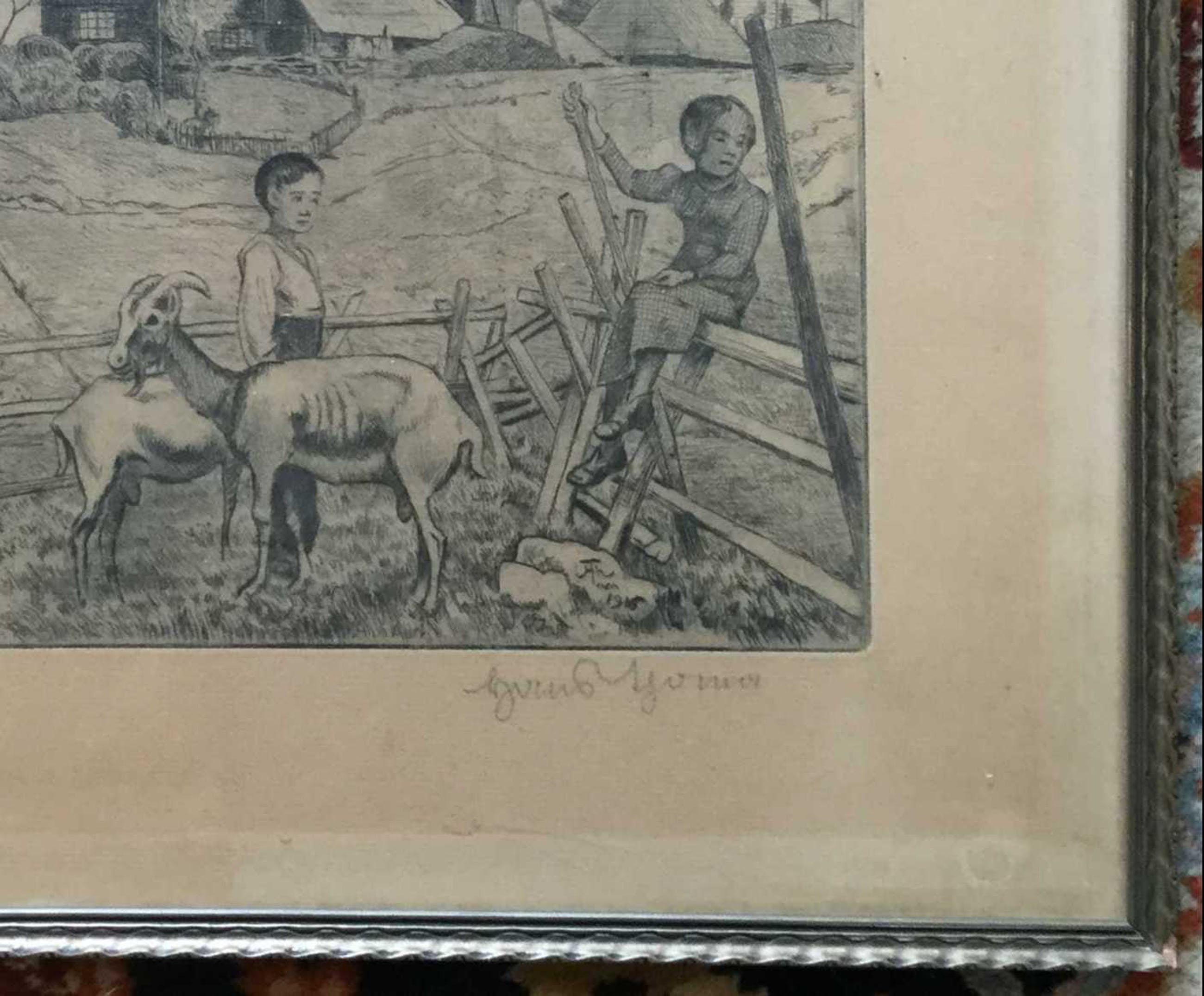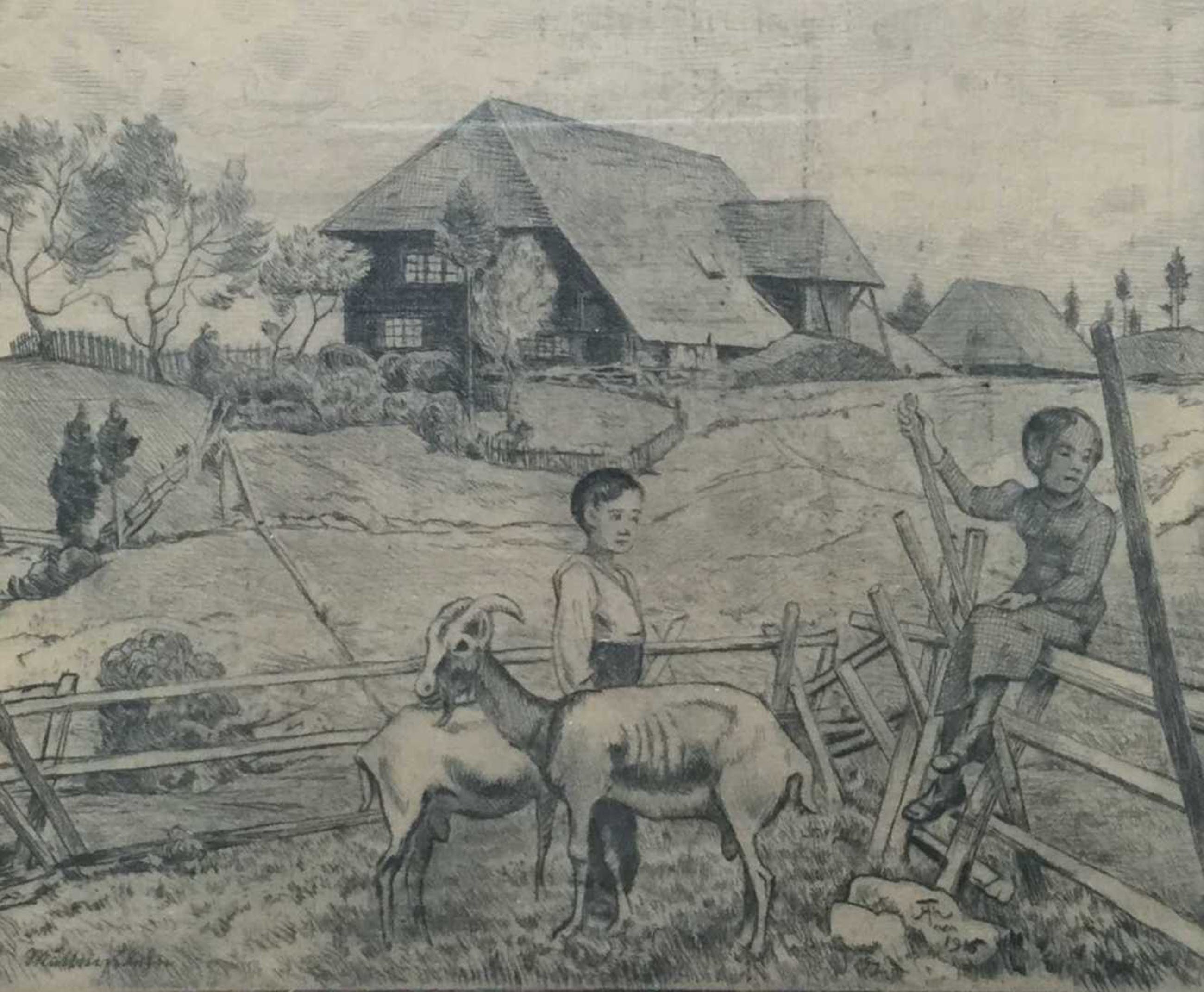 C4483-50 , Hans Thoma kinderen met geitjes ets, r.o. gesigneerd, in de ets gedateerd 1916 beeldmaat 20x23, lijstmaat 32x35