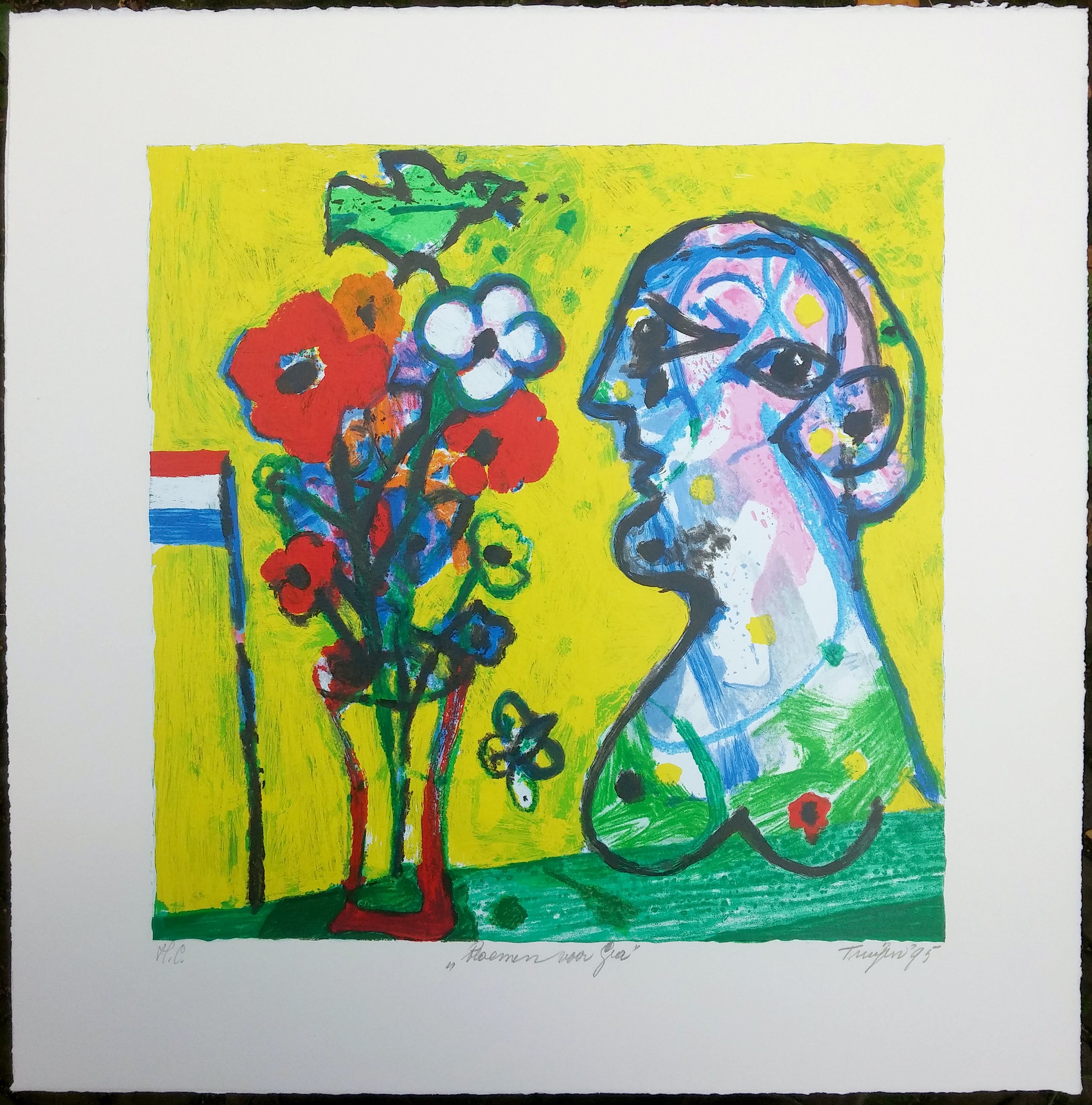 Het beeld is zo’n 39 x 39 cm. Nooit ingelijst geweest. Rechtstreeks van de kunstenaar verworven. Wordt verzekerd verzonden in een stevige kartonnen koker.