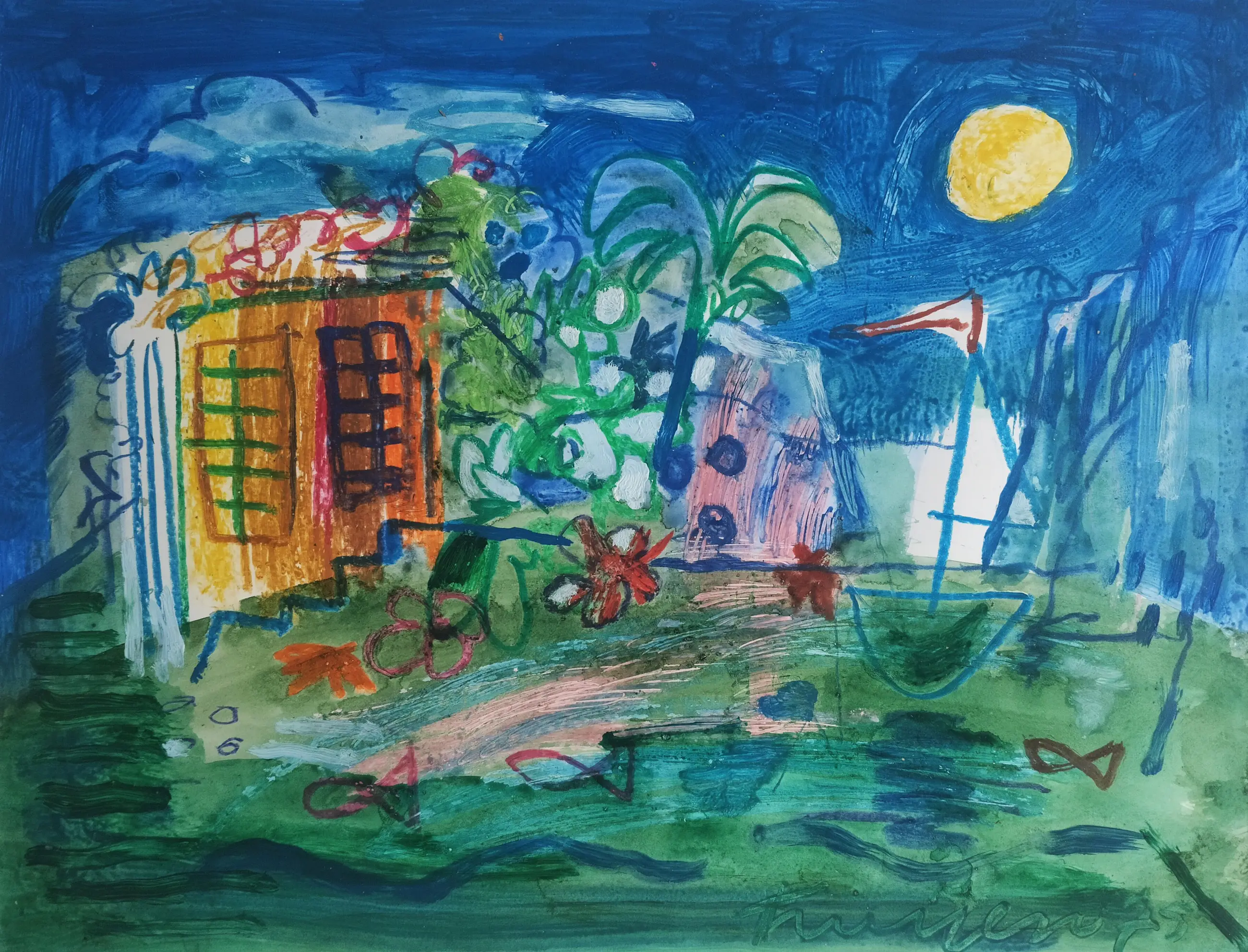 Ingelijste gouache op papier van Hans Truijen (1928-2005) uit 1975. Rechts onder is het werk gesigneerd en gedateerd 75. Afmeting werk 48.5 x 63.5 cm (hxb) Afmeting rode houten lijst 70 x 85 cm. (hxb) Het werk en de lijst zijn in prima staat.