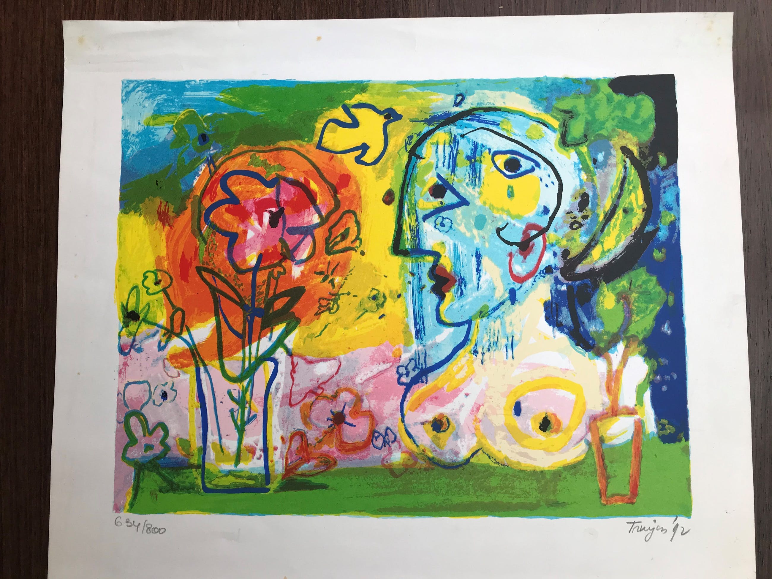 Kleurrijke, sterk figuratieve litho van een vrouw en een vaas