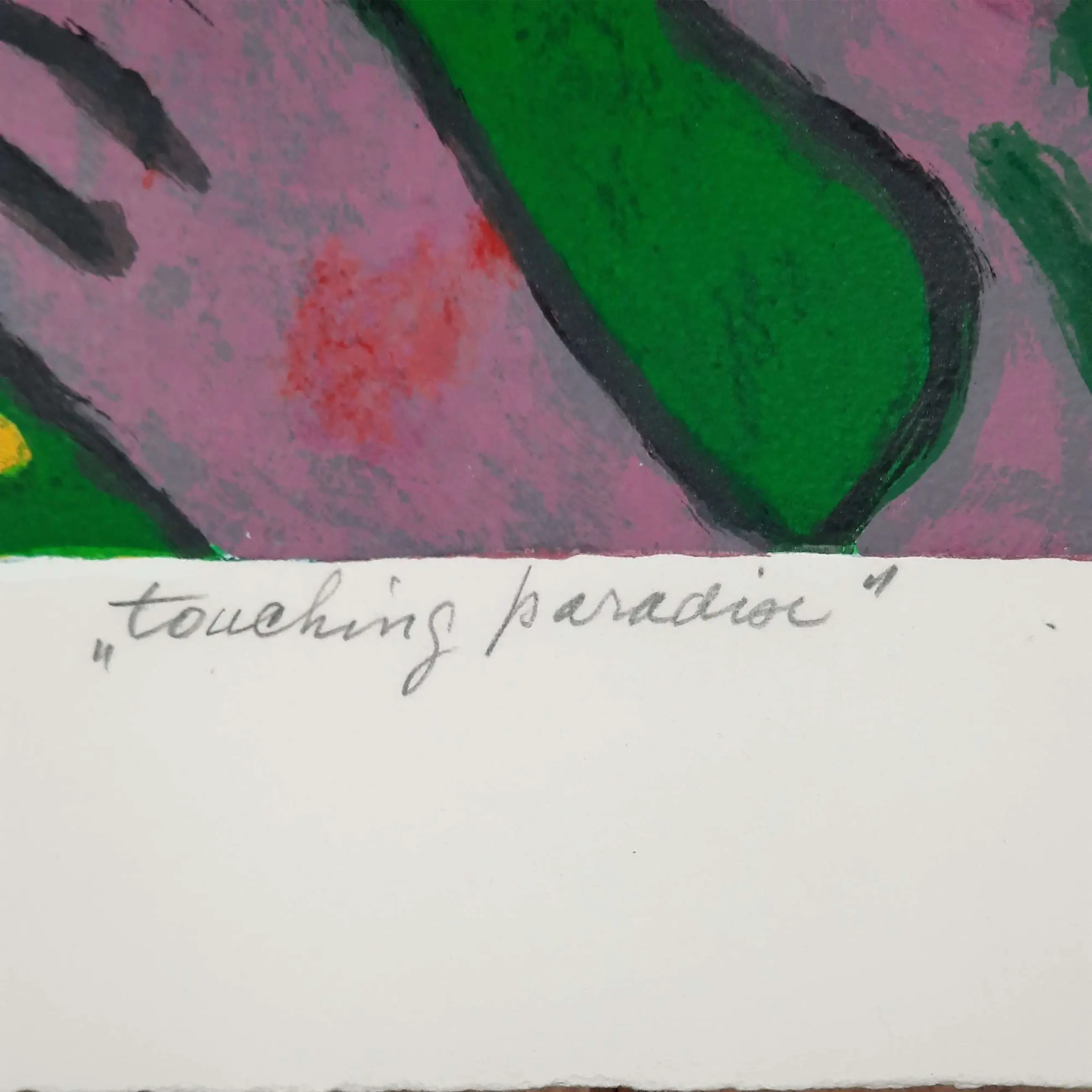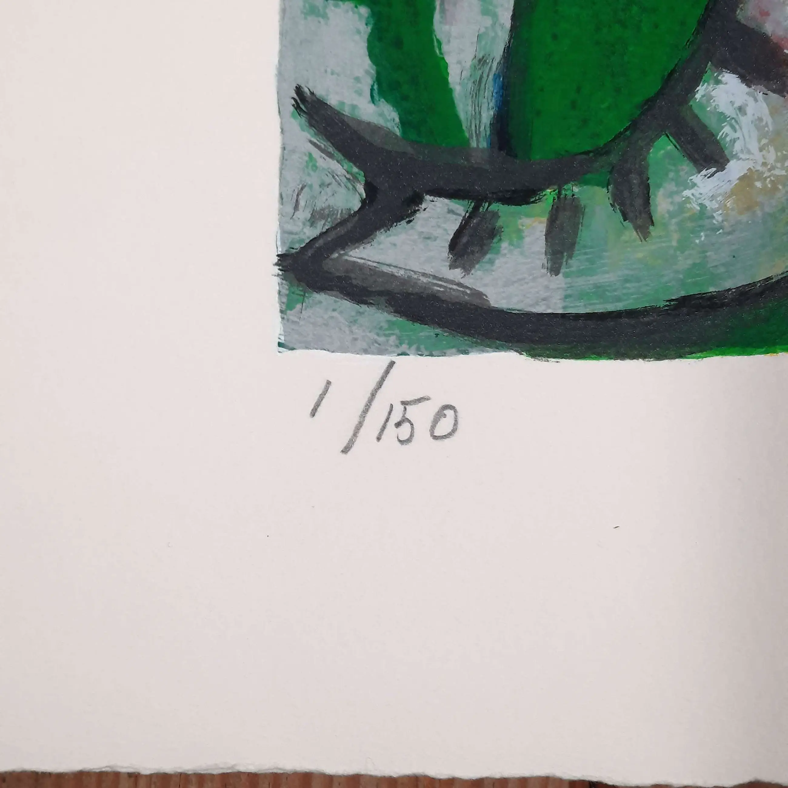 Eerste afdruk van deze serie. Nooit ingelijst geweest. Kleurrijk werk. Het werk van Hans Truijen (1928-2005) toont verwantschap met Cobra door de speelse figuratie en het felle kleurgebruik. Kenmerkend is de poëtische instelling en de virtuositeit. Vooral echter de oorspronkelijke spontaniteit is typisch voor het werk van Truijen.