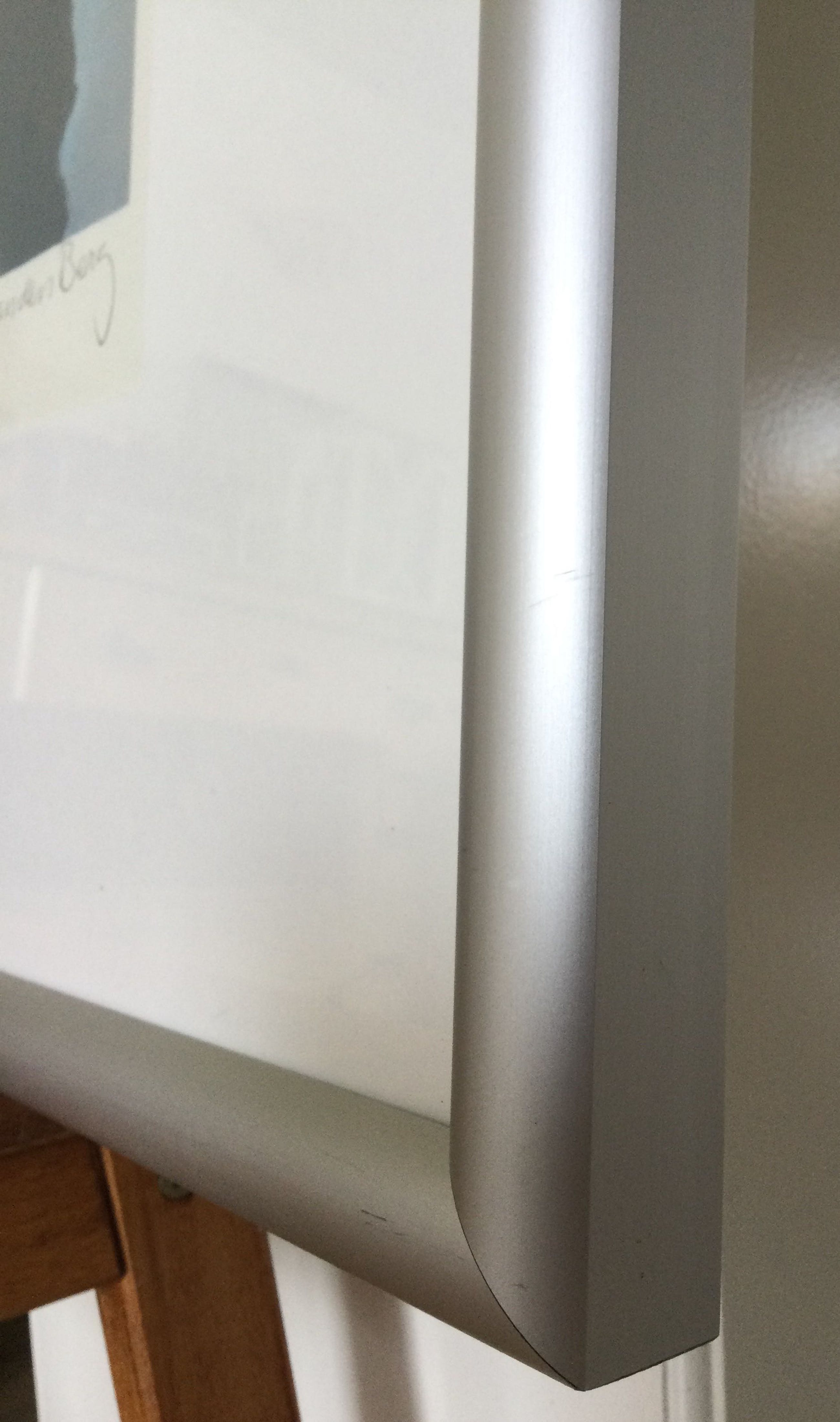 In fraaie 'dikke' aluminium lijst (2,5 cm breed); kan zo aan de muur!