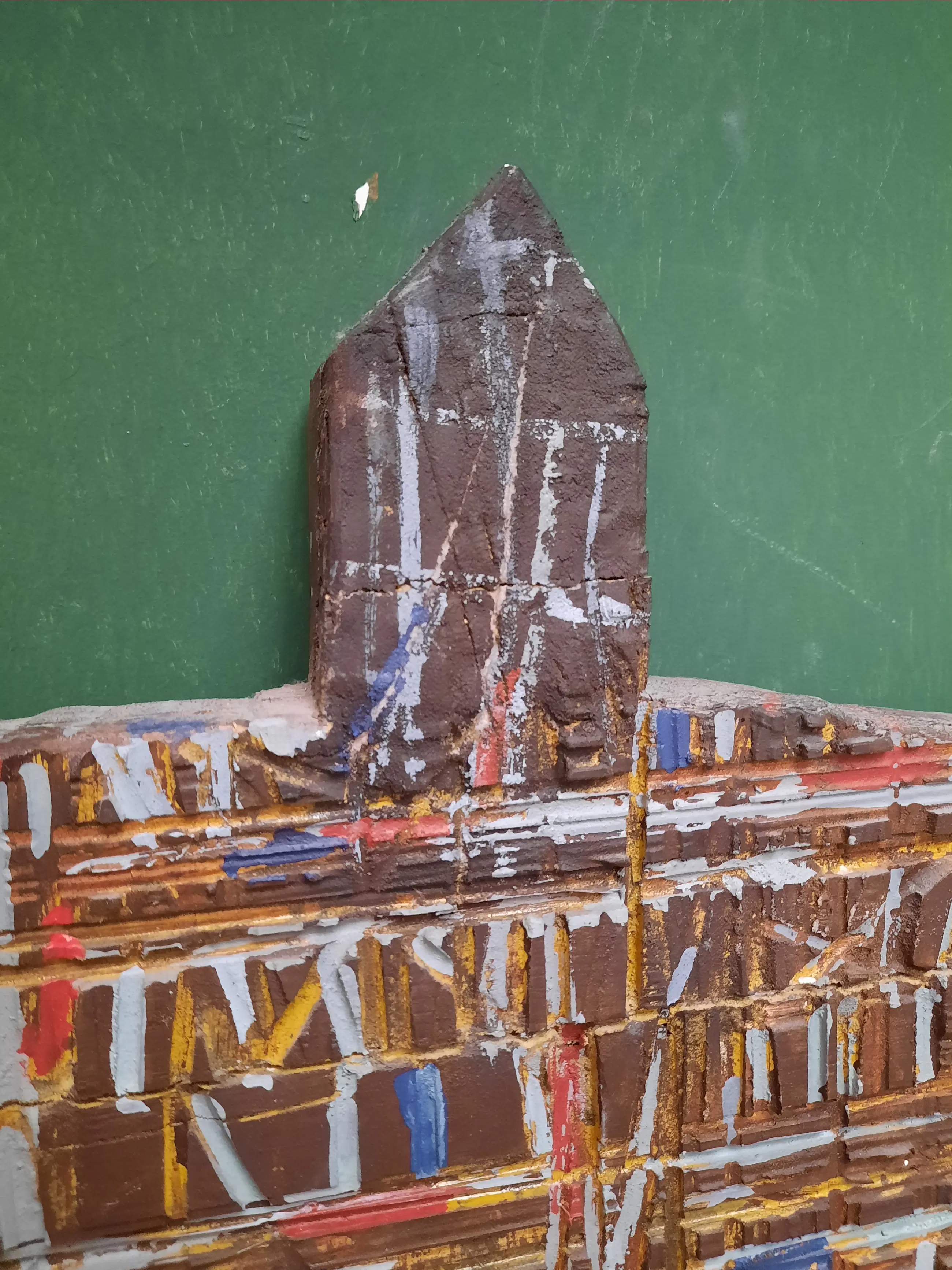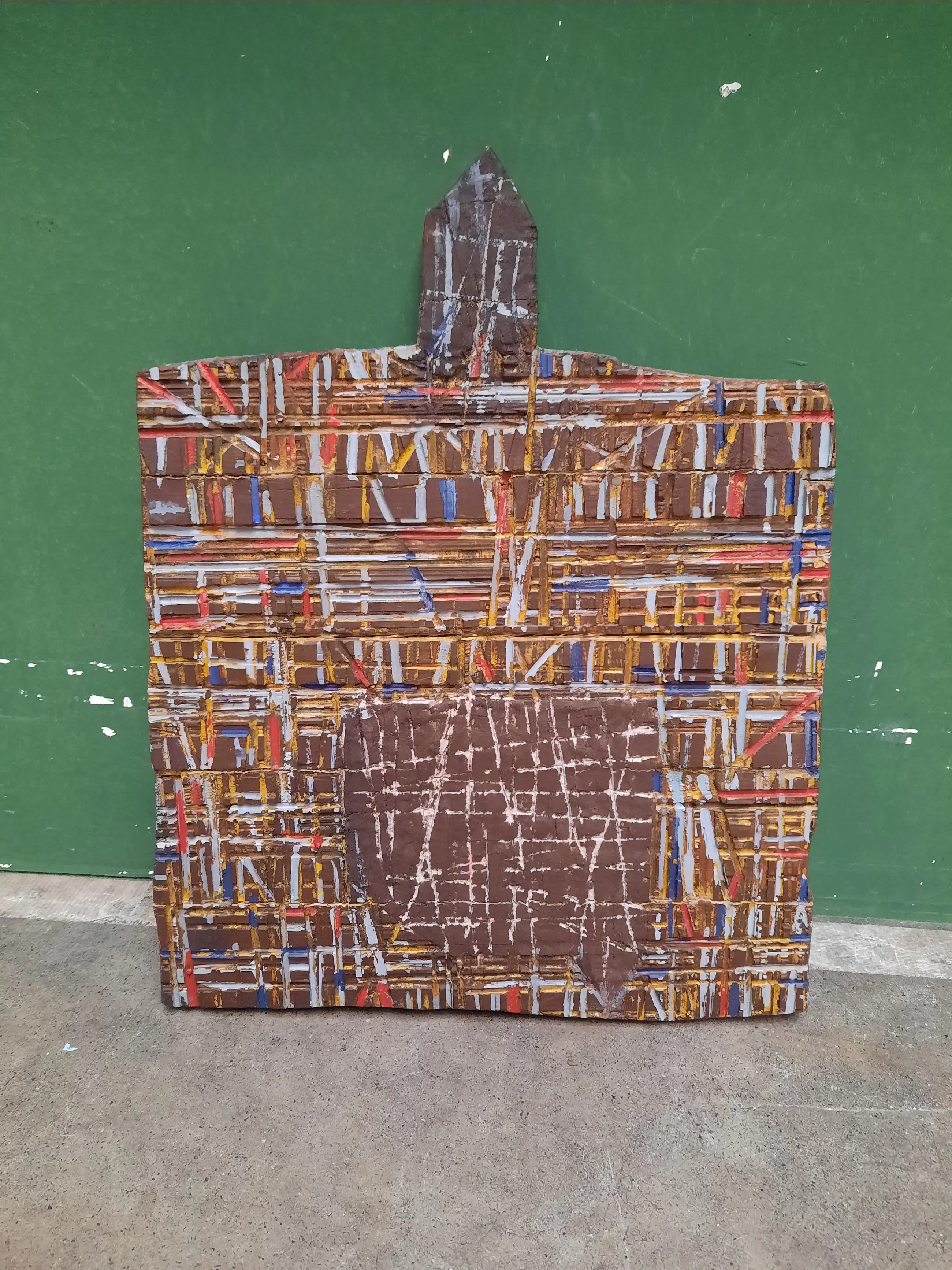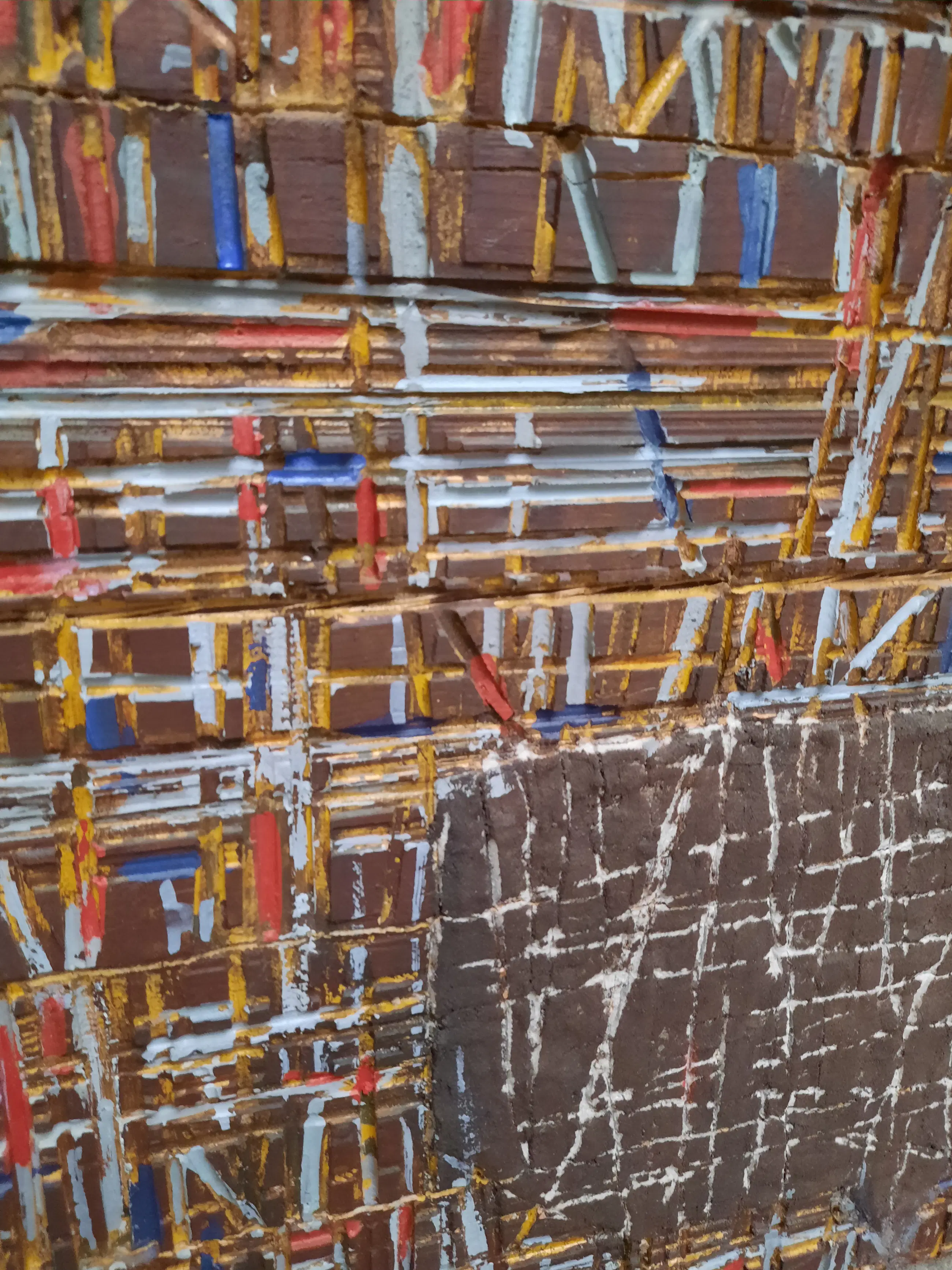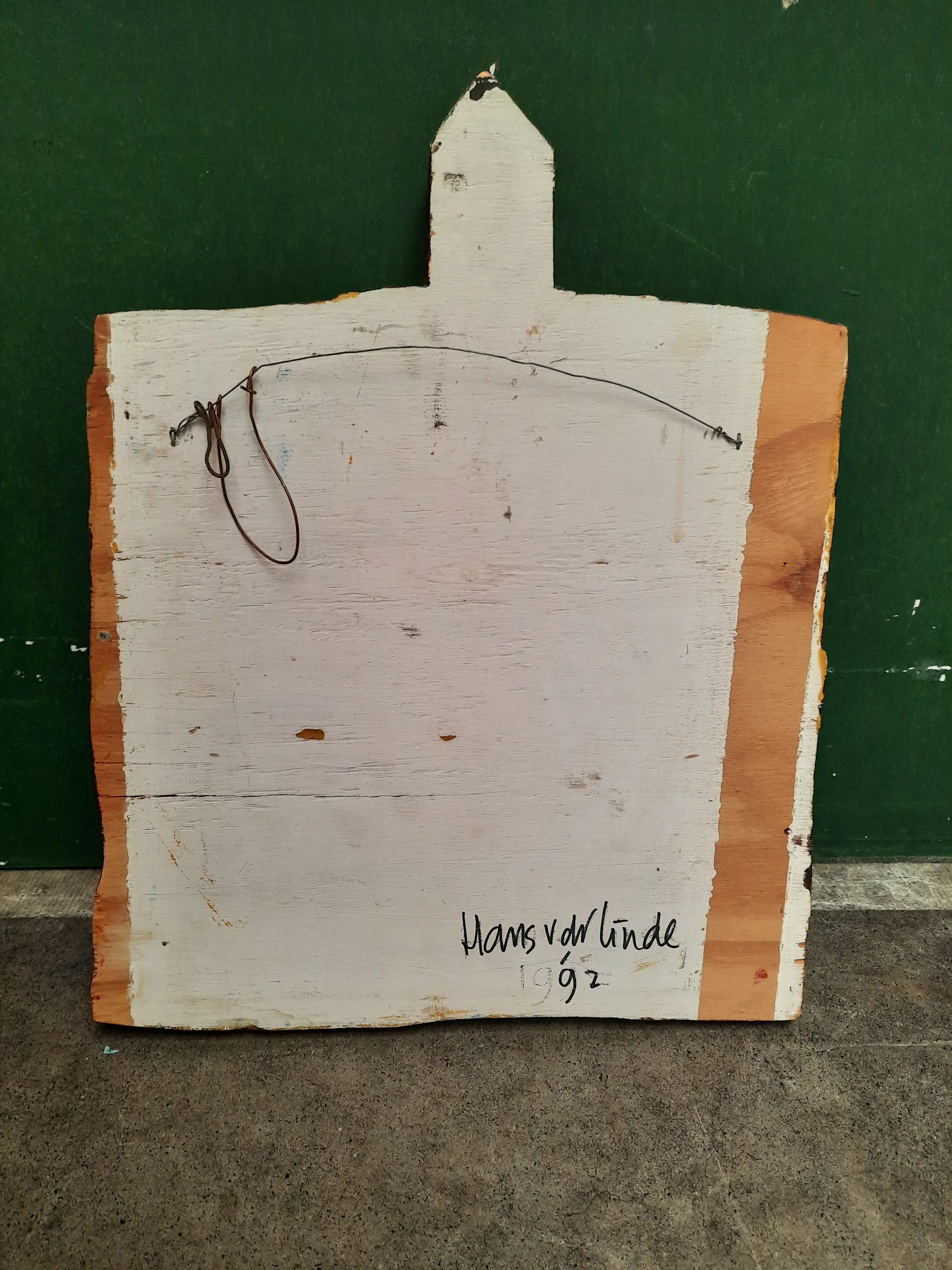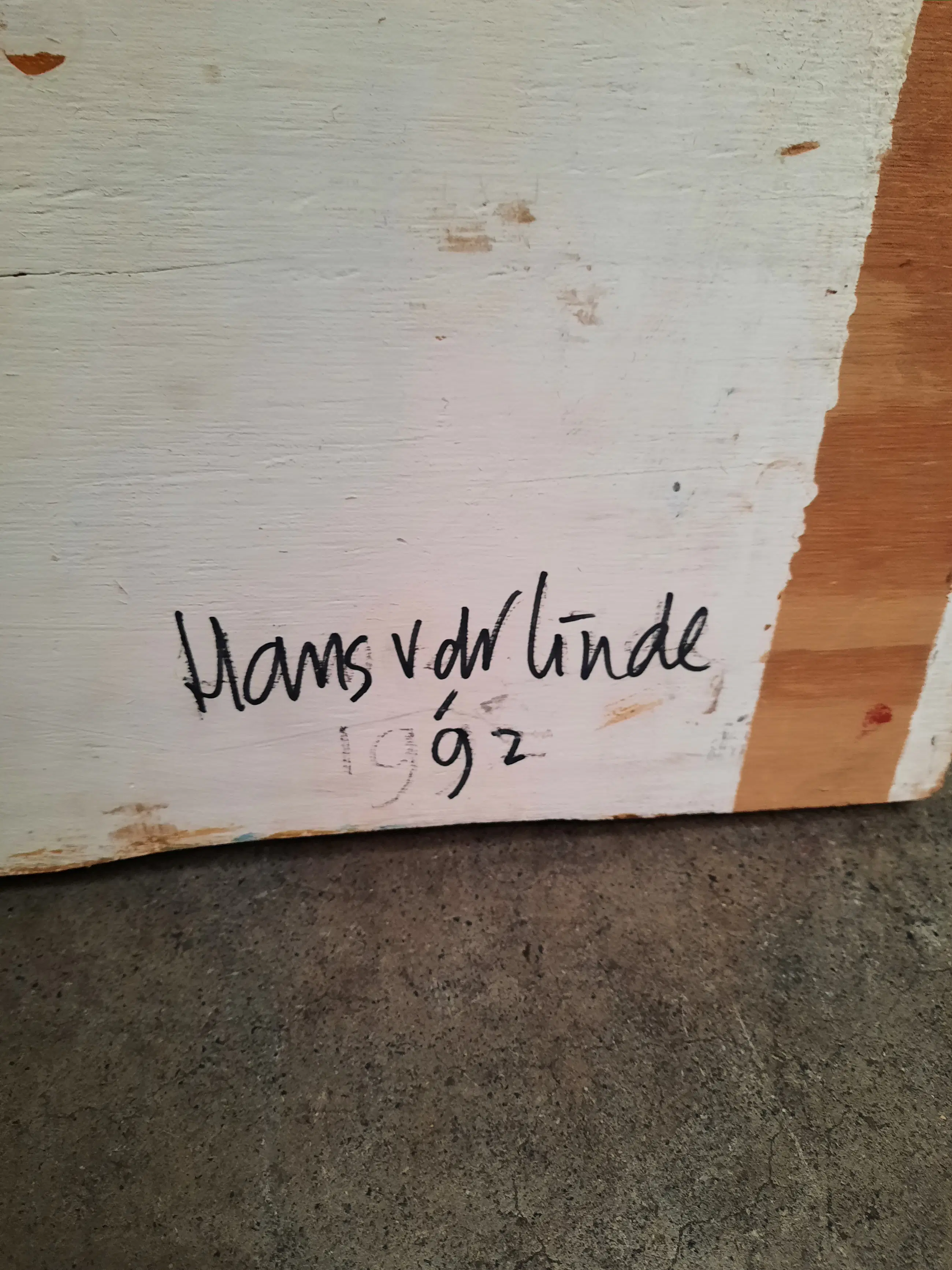 Werk van Hans van der Linde uit 1992. Houten plaat met ingekerfde groeven voorzien van diverse kleuren verf