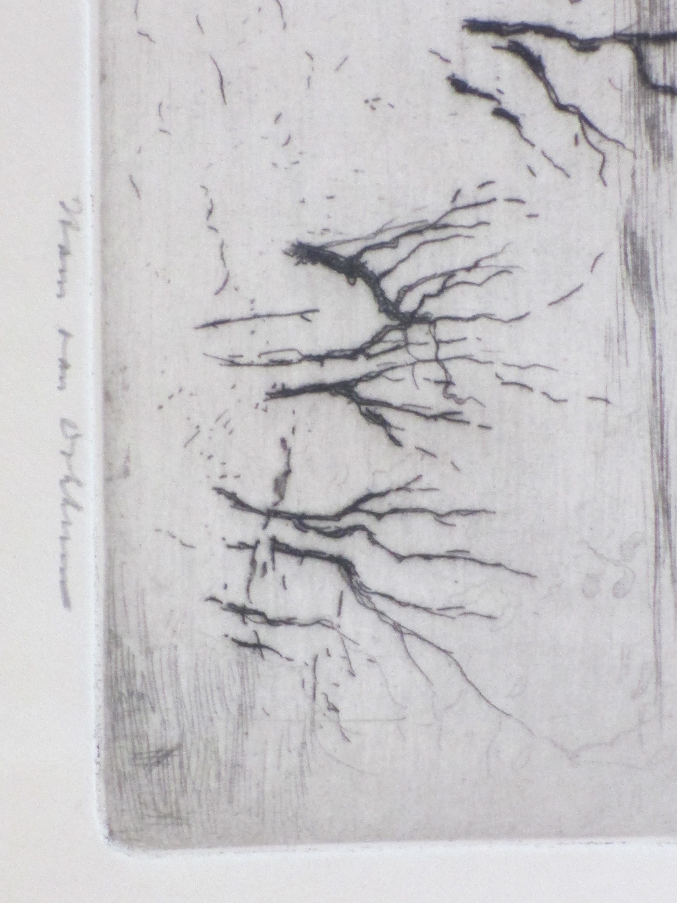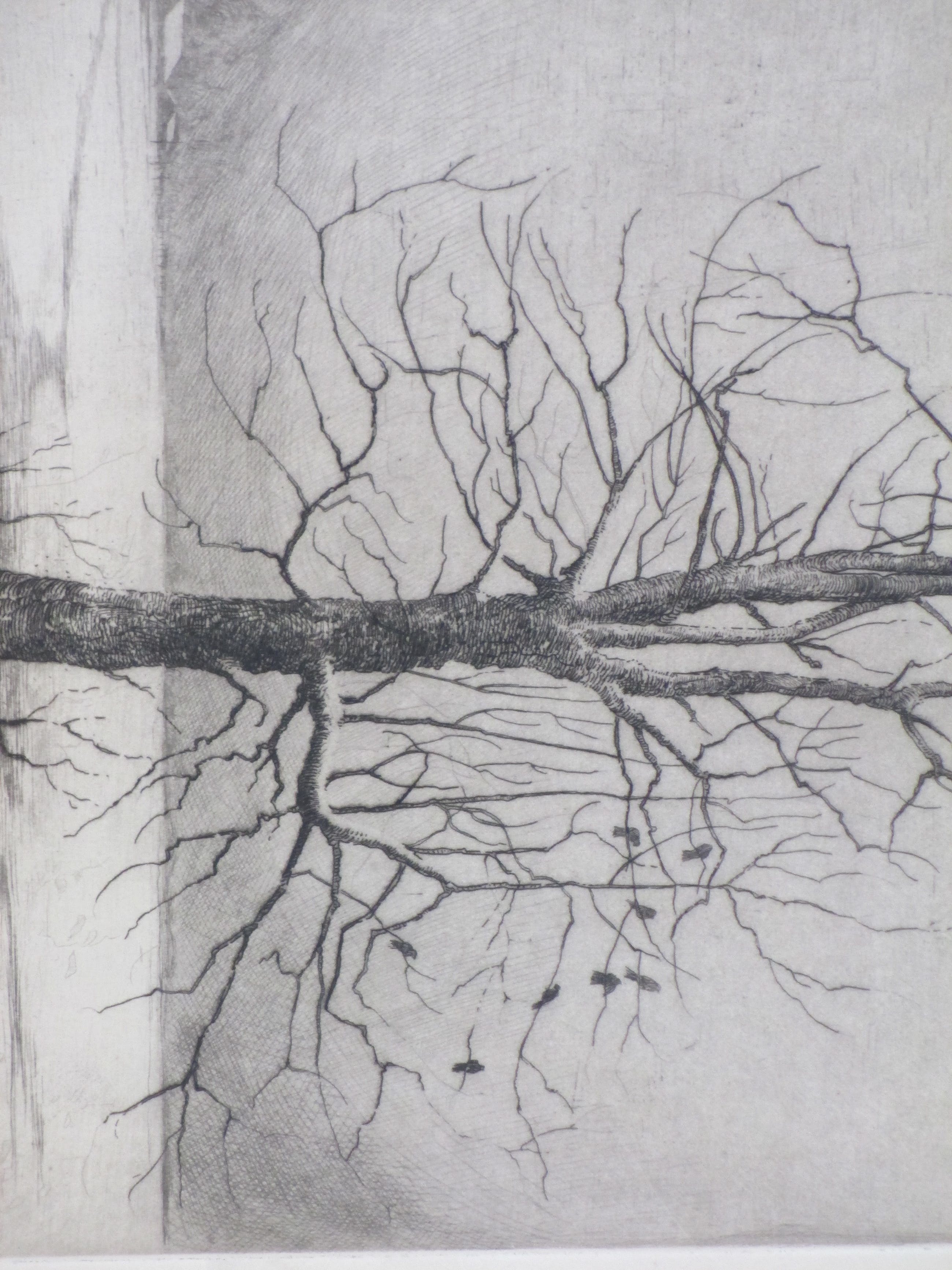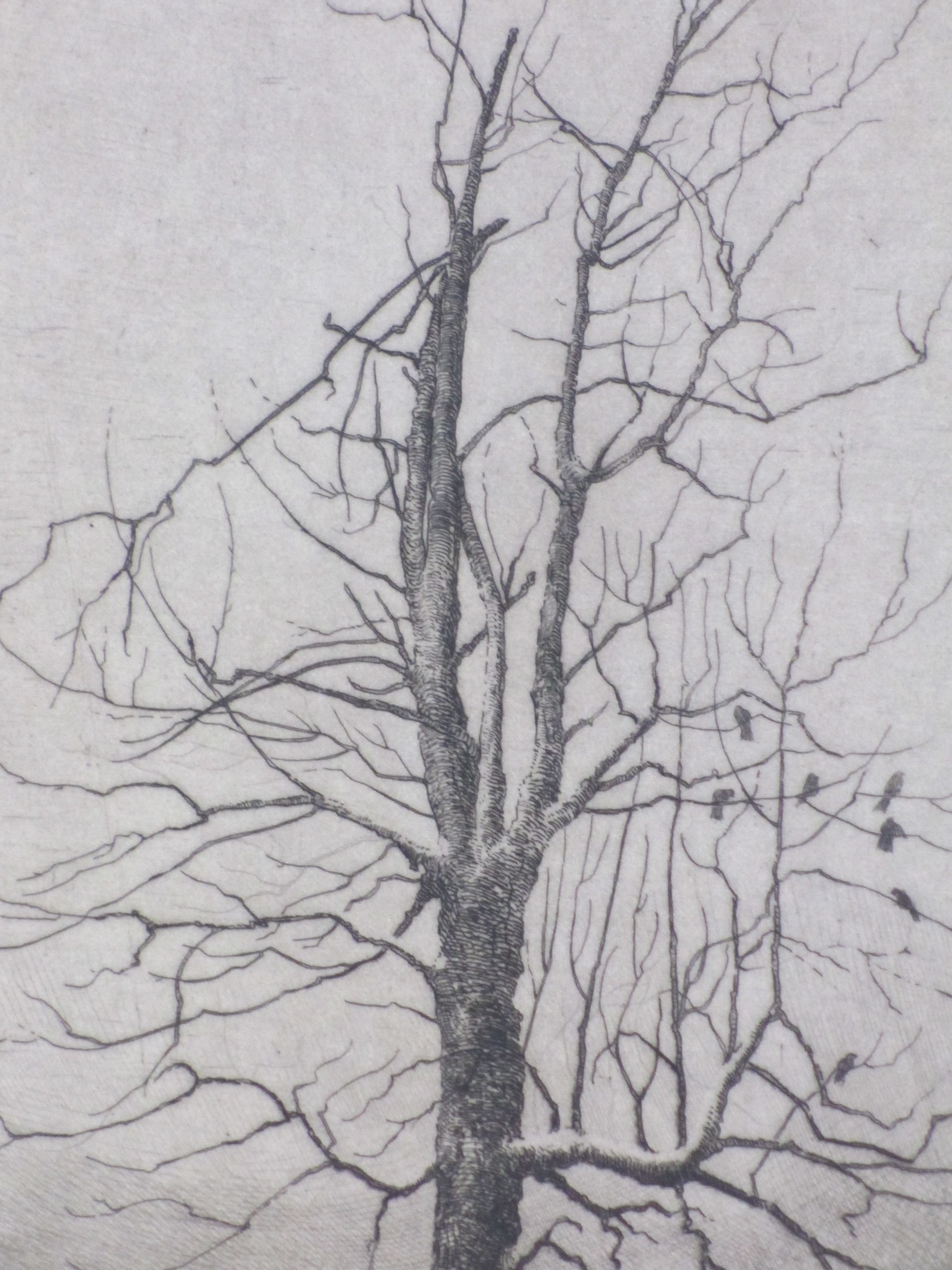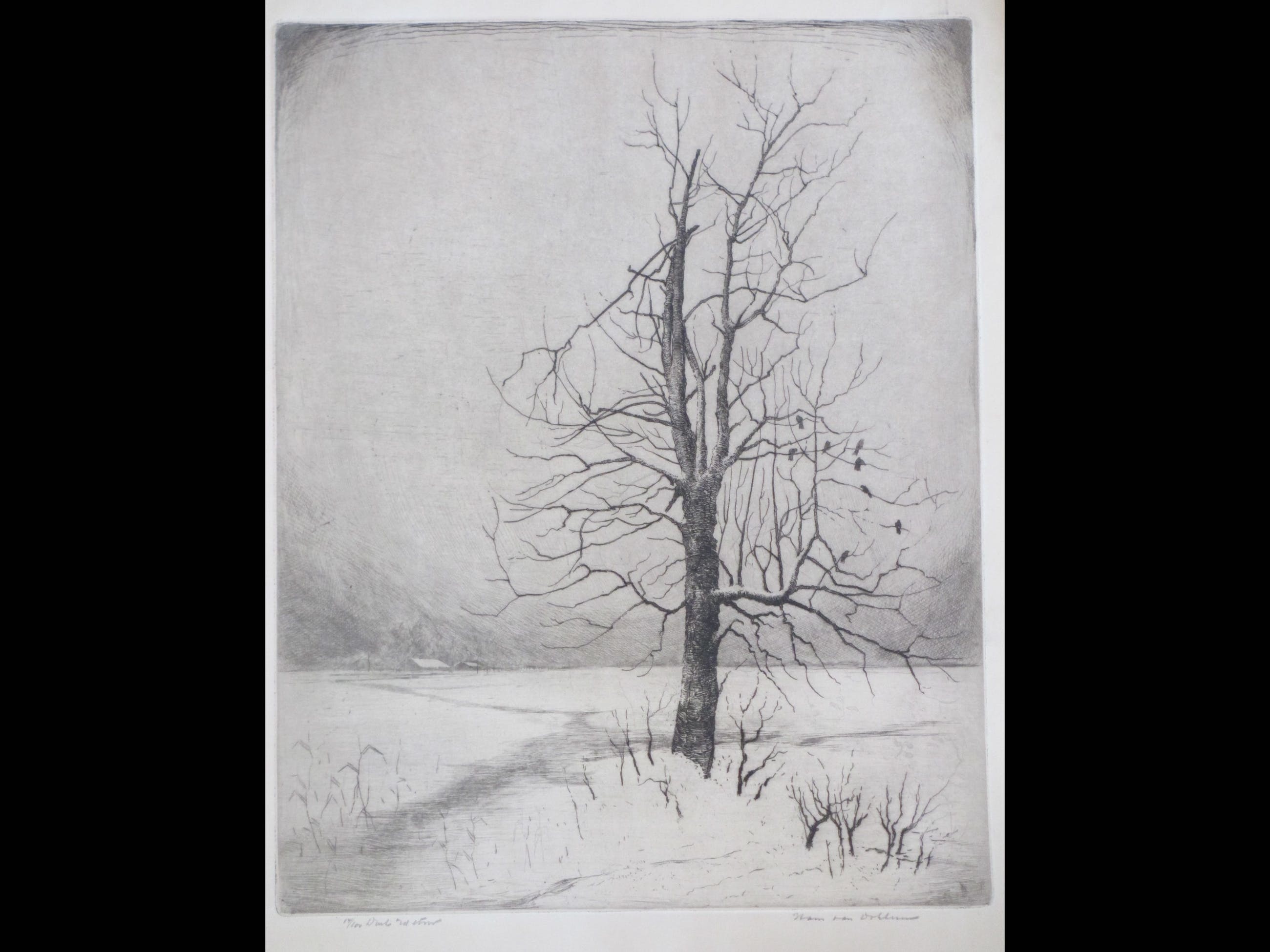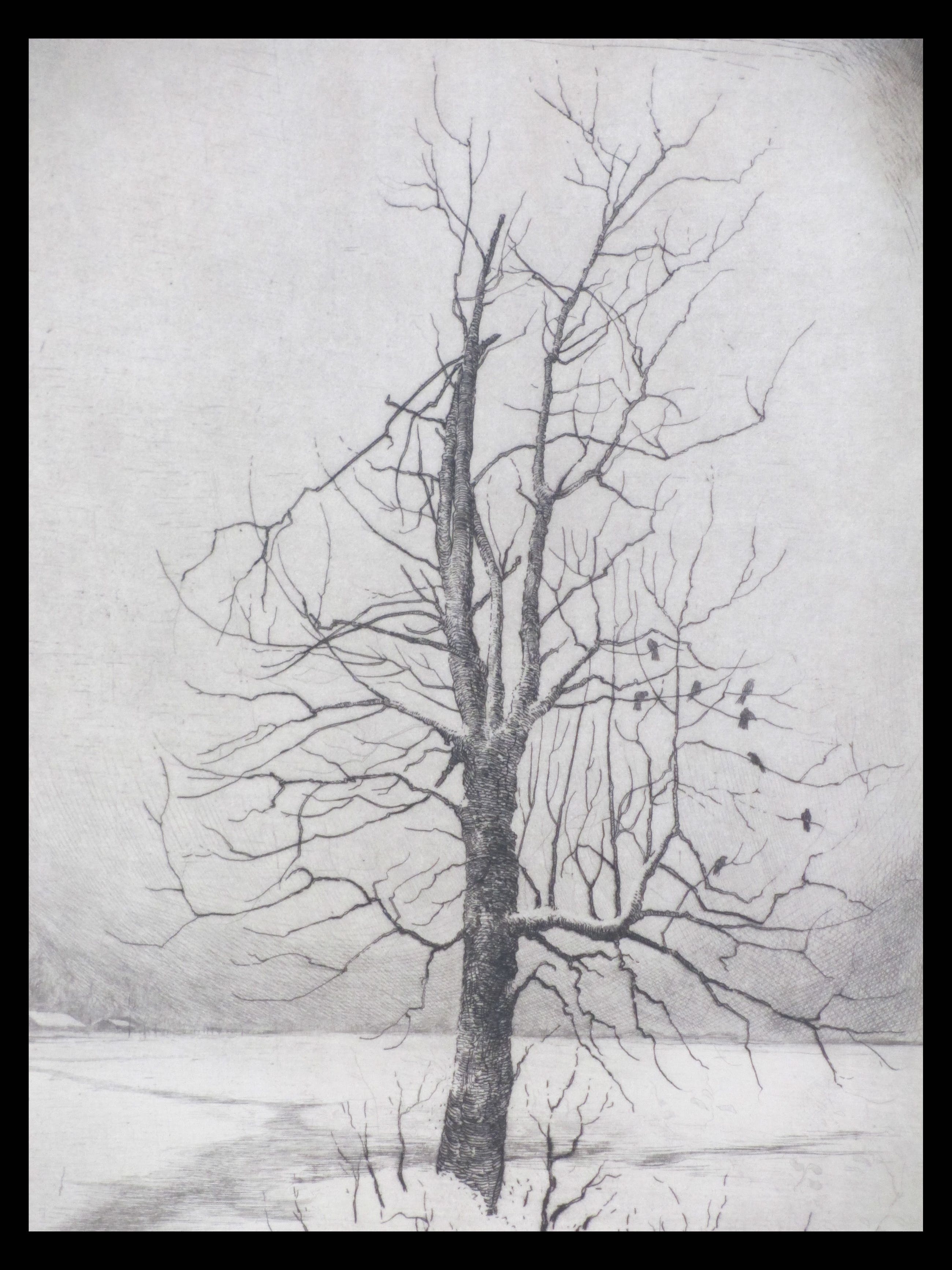Fraaie surrealistische ets door Hans van Dokkum. Voorstelling van een dorre boom met vogels in een besneeuwd landschap. Gesigneerd in potlood rechtsonder. Genummerd '14/100' linksonder. Annotatie in potlood linksonder 'Druk v/d etser'.