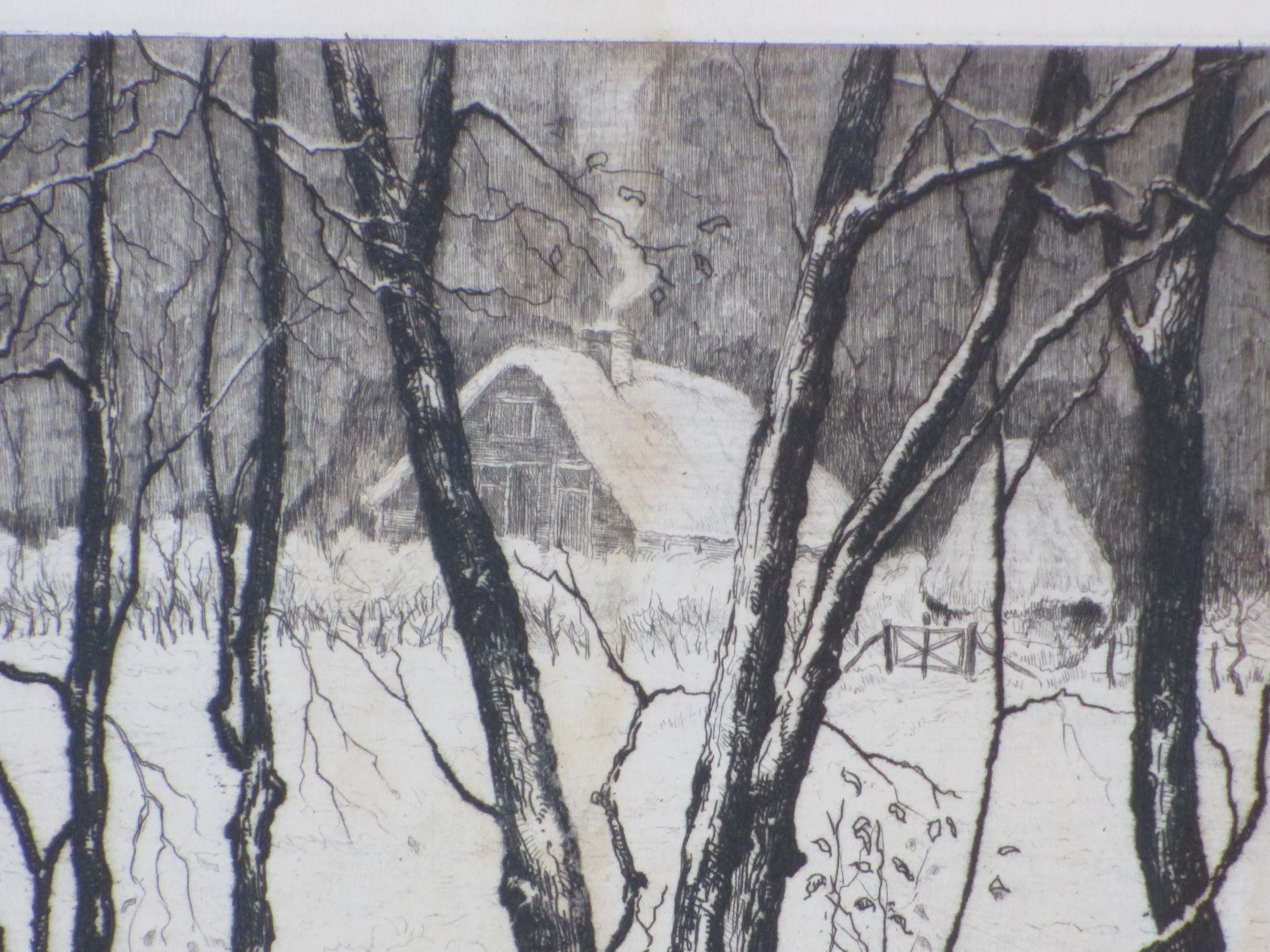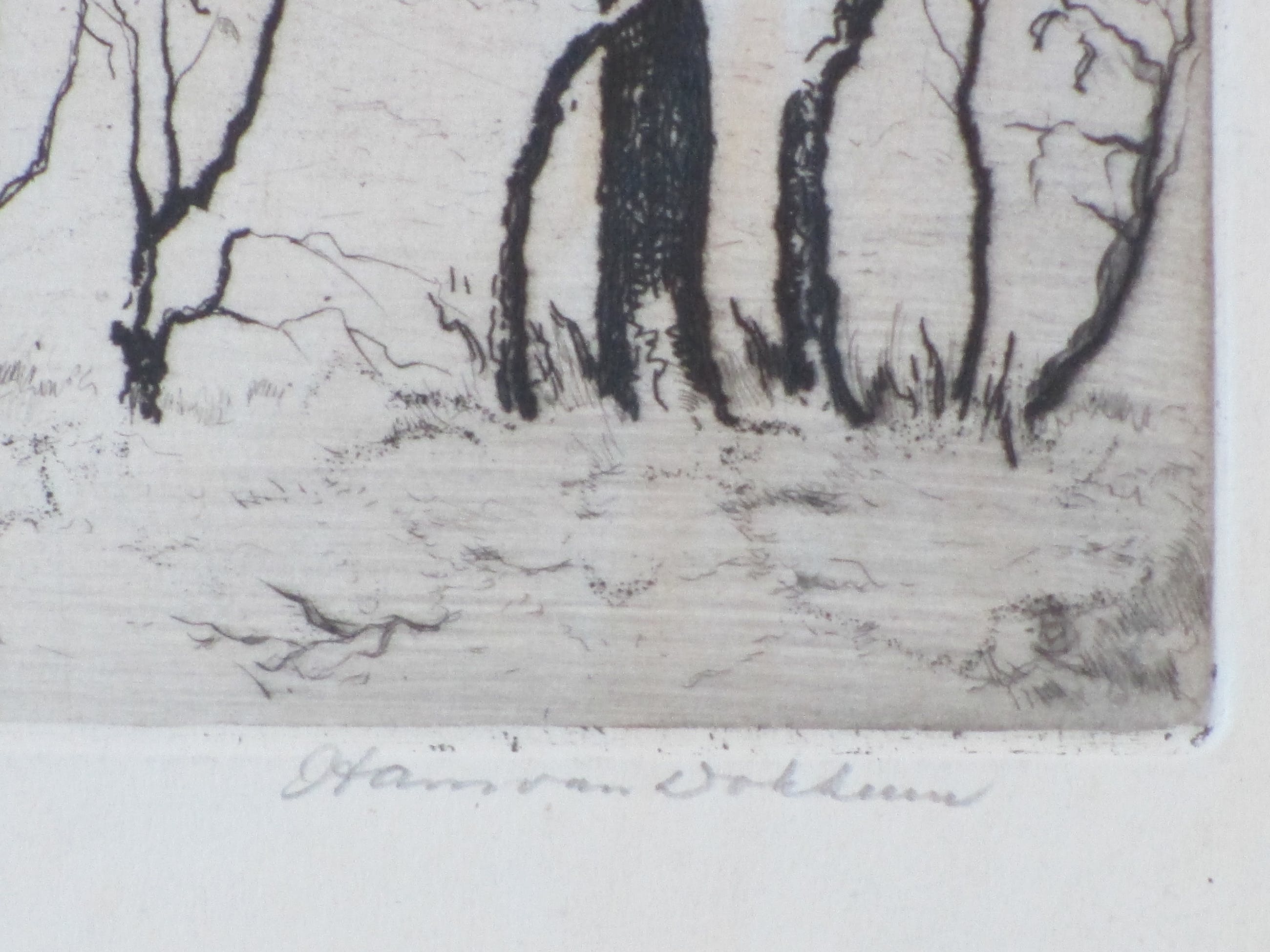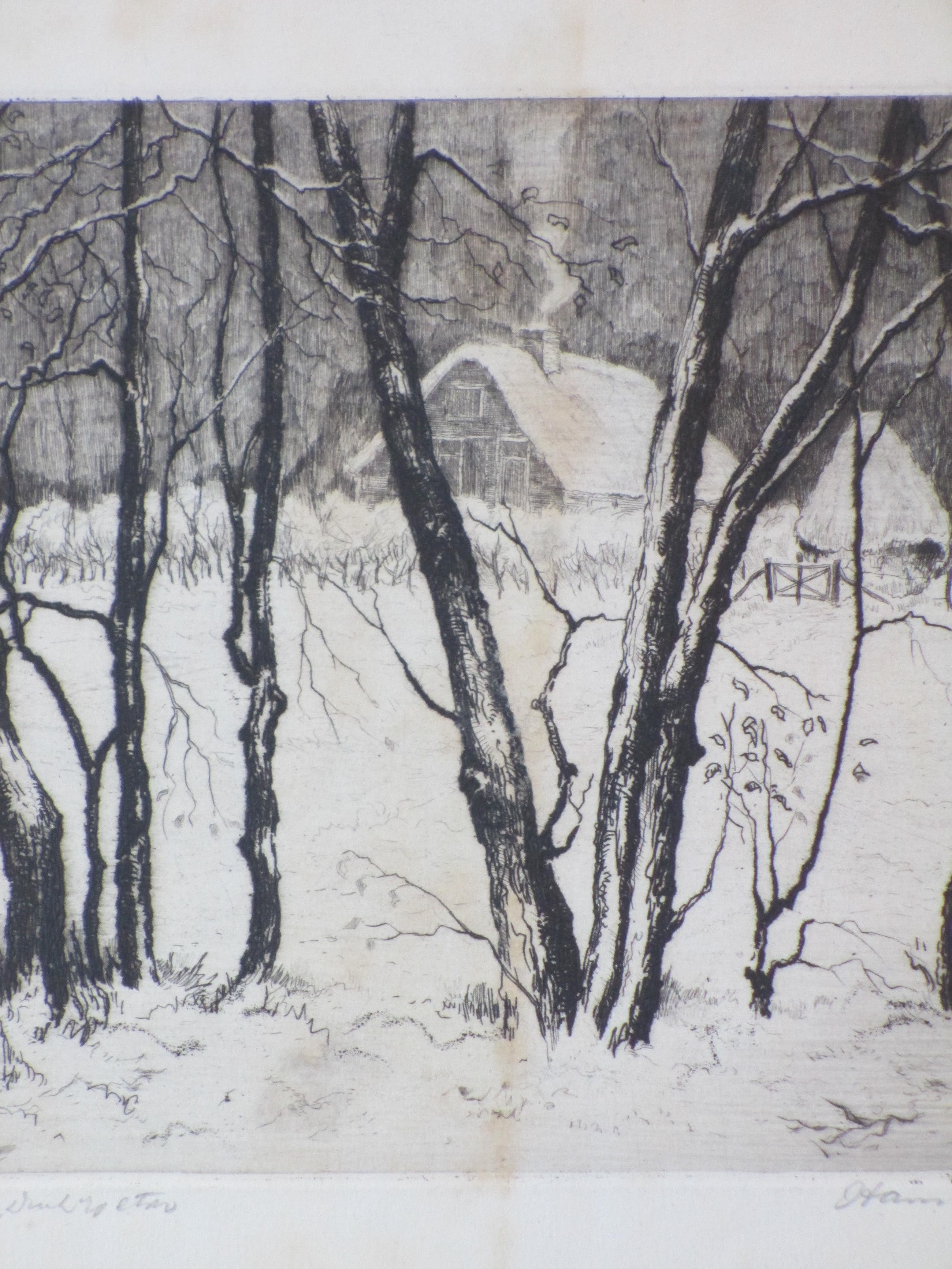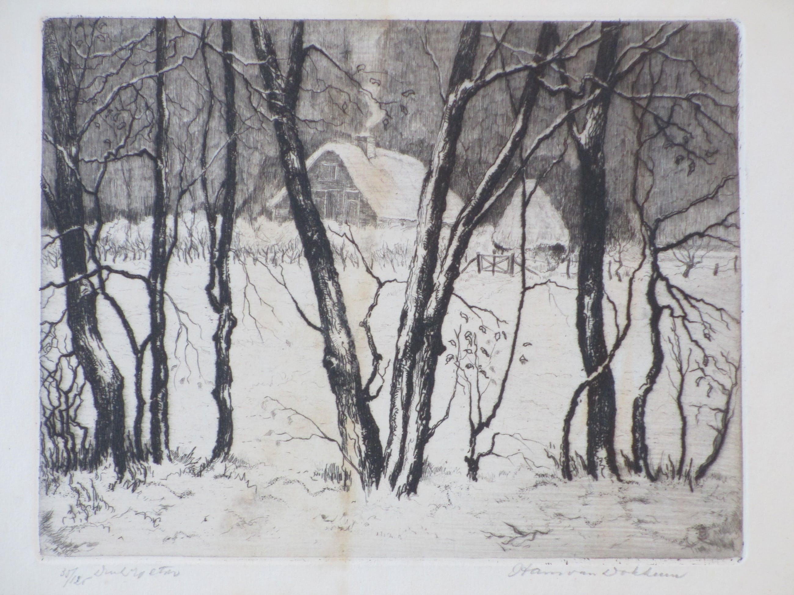 Ets door Hans van Dokkum.Voorstelling van een boerderij in de sneeuw.Losbladig, beeldmaat 16x21,5, bladmaat 28x32,5.Gesigneerd in potlood r.o. 'Hans van Dokkum' .Genummerd en annotatie l.o. '35/125'. en 'Drik v/d etser' .Authenticiteit volledig gegarandeerd.