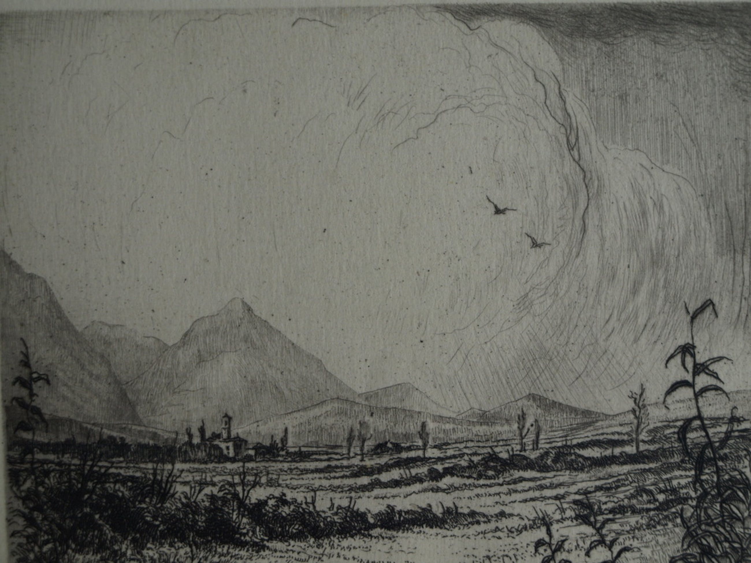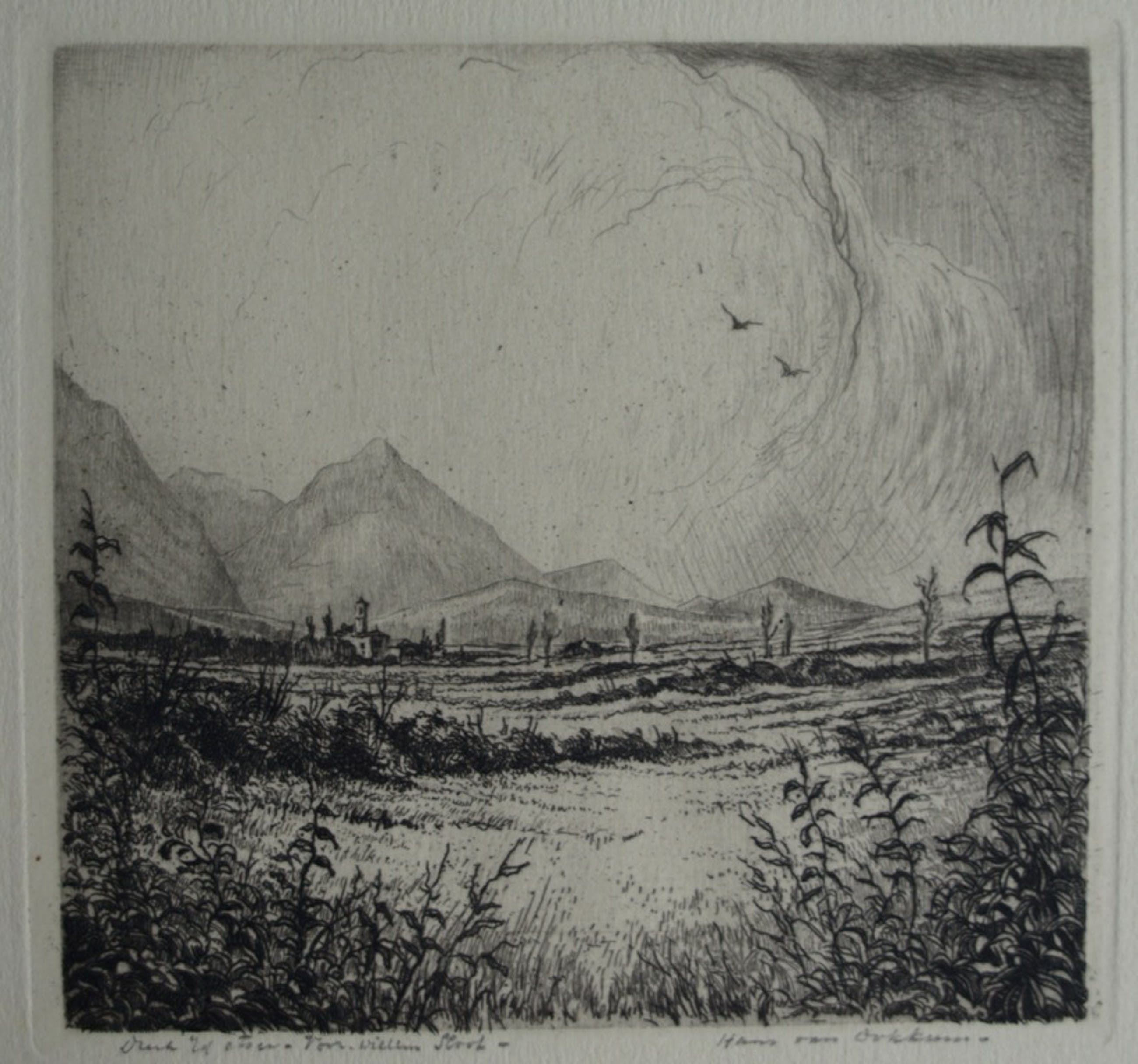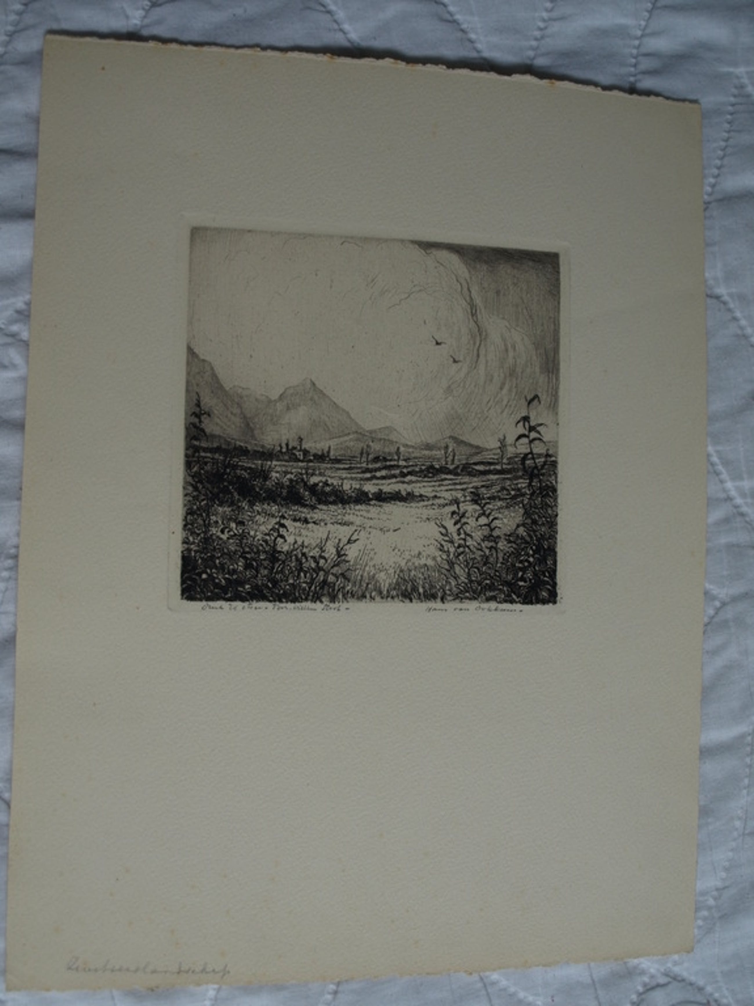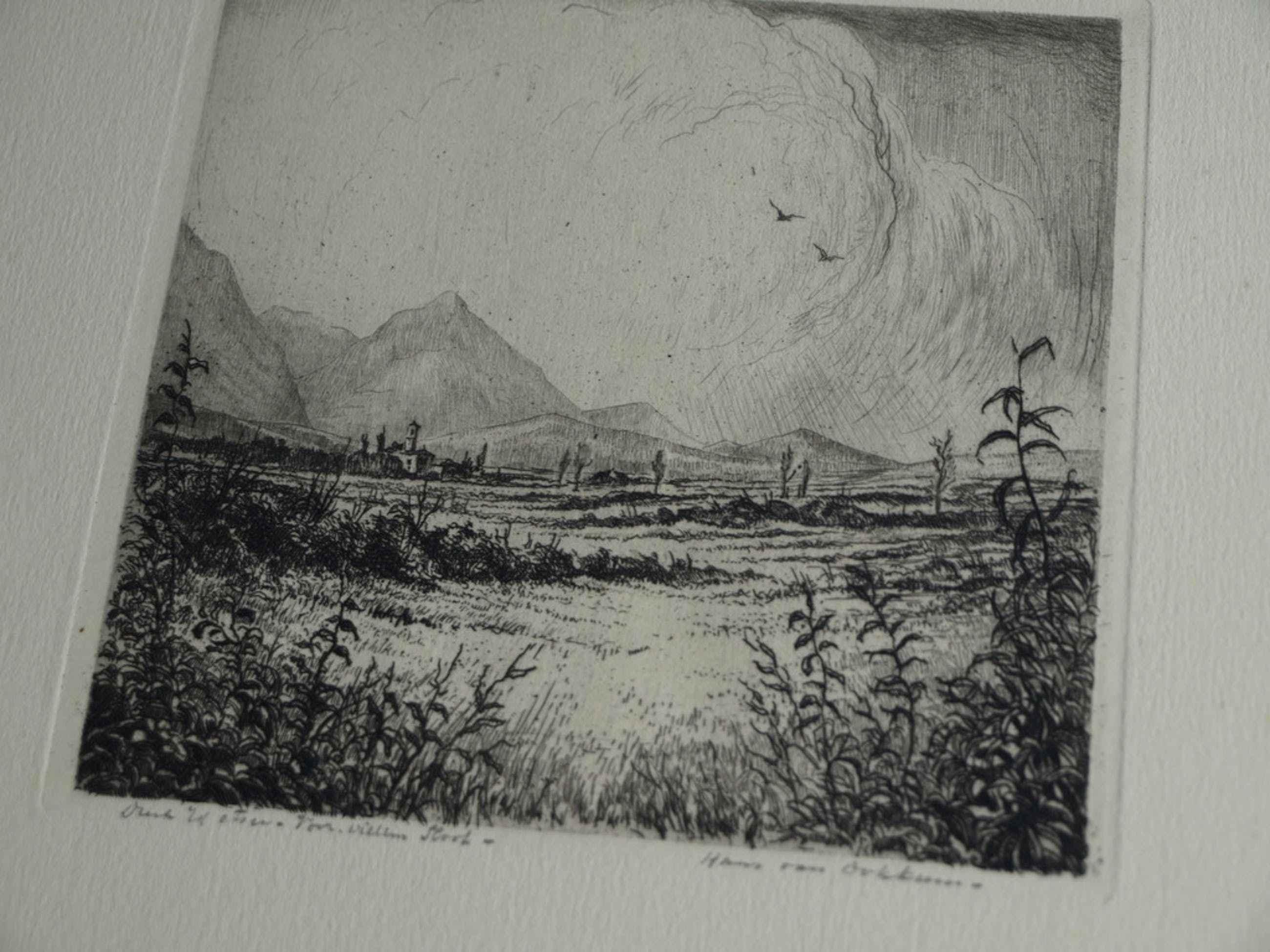Een ets van de Nederlandse kunstenaar Hans van Dokkum, getiteld “Zwitsers landschap”.